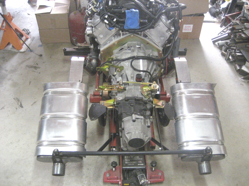 The stock LS1 headers exit in the wrong place (pointing straight at the axles), so after a little digging, I decided to go with stock LS6 Vette headers. They are thin wall cast iron, tri-Y design, and surprisingly light weight. What I like about these headers, they have some real nice heat shields, aren't prone to leakage like tubing headers, suppport 405HP (which is plenty good for the LS1), and dump on an angle somewhat centered so it's perfect for my application. The exhaust pipe routing is up-over the axles, which I made from some 2 1/2" stainless mandrel bends from Summit. The flange that bolts to the header wasn't available as an aftermarket part, so I made my own such that it will sandwich the stock Vette donut gasket. The flange is made of mild steel, so I used some 312 stainless rod that's recommended for carbon steel to stainless welds. As an aside, I found this rod is very nice to work with, and I used it on a few other dissimilar welds. For mufflers, I decided on Flowmaster three chambered stailnless. The three chambered mufflers, according to the Flowmaster noise graphs, significantly reduce the interior noise level; that is something I really wanted. Actually, I needed to determine the available space first, so I mocked-up mufflers from cardboard from the advertised dimensions and moved them around until I got them where I wanted. Since the 01E transaxle is fairly long, there was no space between it and the rear of the car to fit the Camaro style dual inlet/dual outlet muffler that some have used....I think it's a nice solution, but unfortunately not for me. Once the mufflers were welded in place, I made a brace off the transaxle to mount some rubber isolators to support the weight at the rear. I did add some heat shielding in strategic areas so as to manage the heat. First, I shielded the area adjacent to the shocks, since the muffler and inlet pipe was a bit close. I then added a heat shield where the pipe runs close to the shifter cables. Finally, I installed heat shields to the top of the mufflers to keep the trunk floor from getting too hot; these are made by Flowmaster specifically for the three chambered muffler. After driving the car, it is a bit loud (exterior noise), but I'm not surprised due to how short the exhaust system is. I know I can quiet it down by adding a cross-over pipe, but there's so little room I'm not sure yet how to route the pipe; I'll have to chew on this for a while. There's also a drone under load from about 1800 - 2000 RPM. After some research, I found that a Helmholz chamber can cancel out this drone. A closed end pipe, regardless of routing, placed preferably just ahead of the muffler, calculated to the proper length (wave speed, number of pulses, frequency, etc) can cancel out the resonance (drone). It's a tidy solution that I may employ once I figure out the cross-over pipe. Attached thumbnail(s) Attached image(s)