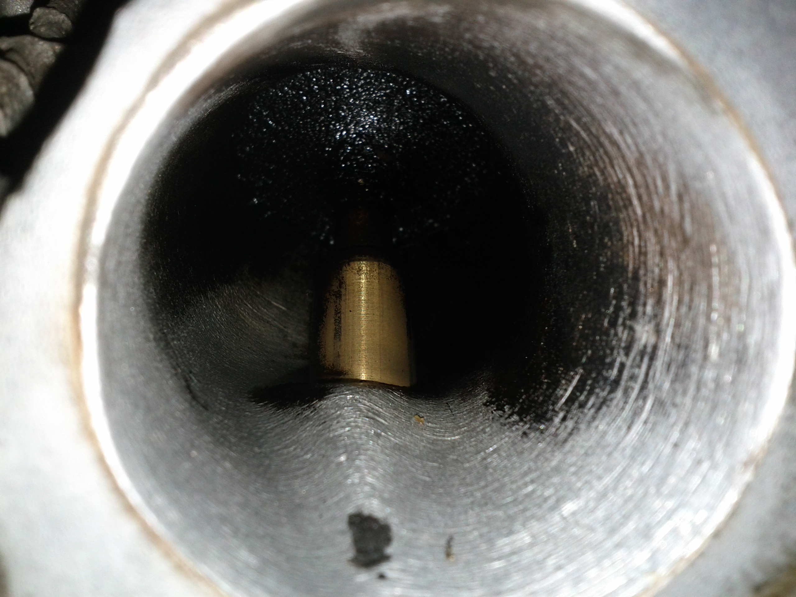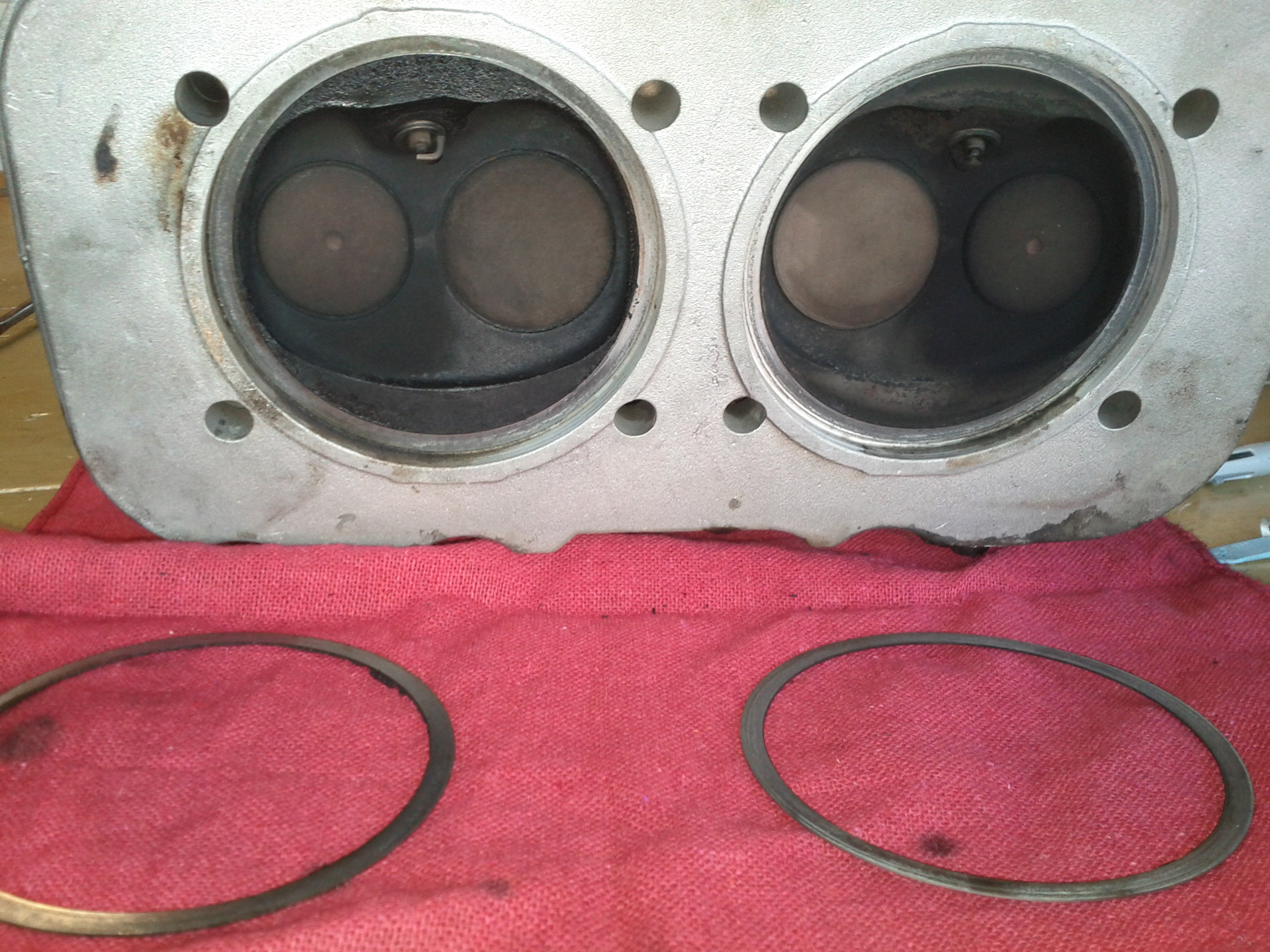 The heads looked good, see pictures, only thing I was wondering about was a ~0.5 mm spacer about 1/4" width that was at the mating surface between the cylinder and the head. Does anyone know if these are normal? Heads look decent, there are no cracks visible, 42mm intake, 36mm exhaust, based on the picture below there may be some leakby at the valve seat so I'll get them reground. Probably evidence of worn valve seat, any ideas?? |