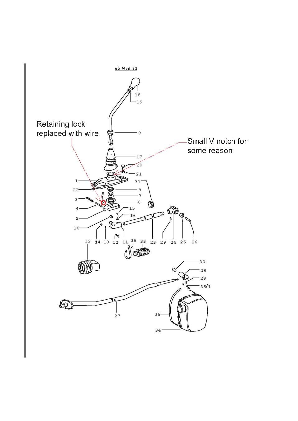 OK I think I understand how the adjustment process is supposed to work. I am not sure that my shifter allowed me to implement the adjustment correctly. I see that on the transmission there is a very defined and limited range of movement. But that range of motion has to be correctly synced up with the limitations of the shifter to make them play well together. So I started by getting the trans in 1st gear. Moved shifter forward and allow the spring to push lever over out of the 1st/ reverse plane and then shift down into 3rd. This should place the selector knob on the transmission in the middle of the H and in the most forward position on the H pattern. Verified that the car was in a gear and decided that I wanted the shifter position for 3rd to be here (meaning shifter to rear of car and just able to access the pinch bolt through the port. So at this point the position of 2nd is set by the available travel length of the shift selector on the transmission. At this point I can access all of the gears in the pattern after much trying, but the shift from 1st to 2nd always finds 4th. I can make deliberate corrections with the shifter by biasing the shift to the left and eventually find 2nd. Going from 2nd to third seems to always go to 5th. Looking at my shifter, it is questionable at best. It has the lock rings on the compression springs replaced with wire and there is a āVā notch in gearshift bracket. I will pull it to get some better pictures tonight (see attached) . Before I get Dr. Evil to rebuild my trans I would like to know if there is any reason to consider rebuilding the shifter and if a shifter rebuild kit is available? Also while I have seen a number of shifters on the board, I am not sure how to determine if a new used one is better than the one I have. If there is a reasonably priced alternative to buying a completely new shifter I might try that before pulling the trans. Any suggestions where to locate would be appreciated. Attached thumbnail(s) |