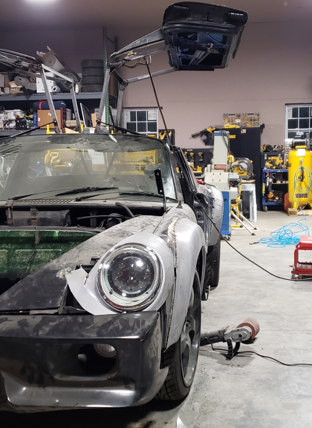 The drop-down headlights are the setup I hope someone will do, with the stock headlight "hole" on each side of the hood filled by one piece of steel (or?) instead of the one Porsche had to use with the separate "brow." Back of the panel drops down to expose modern LED lights or projector setup. Wouldn't take a lot of drop down, and would result in a very clean look.