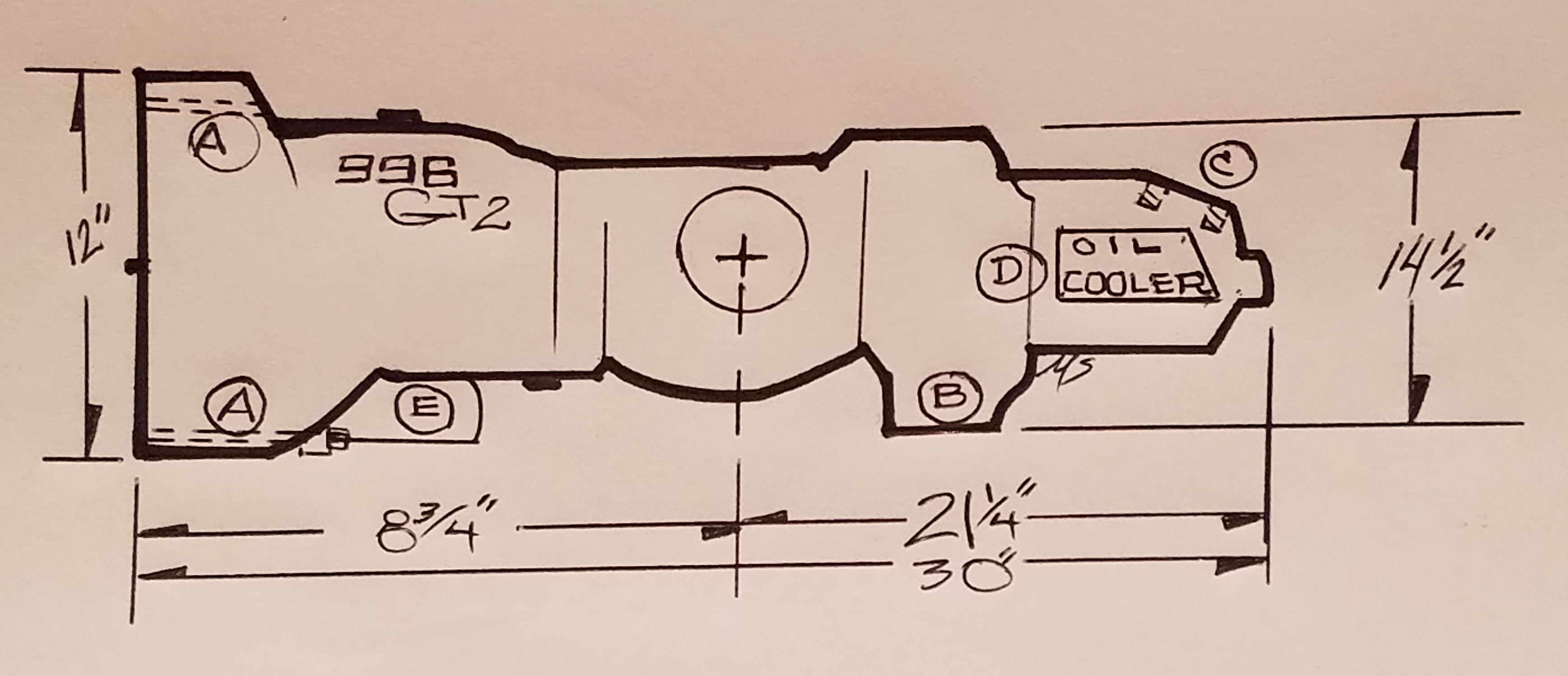 Awesome project! > Porsche 996 GT2 Transmission Do you have the basic dimensions of this transmission? Or anyone know where to find them? - Overall length and width? - Distance from bell housing to center of axle output flanges? - Distance between output flanges? Thanks - I have a new project I'm working on too... -Steve Note that this view is showing the 996gt2 trans Inverted, drain plug is now vent, and vent is now drain plug. There are also internal mods for proper oiling due to inverted operation... Sketched this up for you today (not to scale, but good measurements) ...some notes: A) the 4 bellhousing bolt locations are not the same as on air cooled transaxles...there are a couple machine shops that can mod the 996 gt2 (bolt locations) for use on an air cooled 6. B) This large rectangular aluminum area of the trans serves some purpose when in its original position, but I might machine most of it away for better clearence. C) these threaded 8 x 1.25mm (4 total) bores make for a good start point for the rear trans mount. D) Oil cooler adds + 3" to side-to-side dimensions...which is approx 8" wide...to 12" dia. at the bellhousing. E) Starter motor resides on the lower right (pass) side. Measurement of the outer distance for the drive flanges; Left to Right is 10" (distance between output flanges). Hope this is of use to you Steve (IMG:style_emoticons/default/smile.gif) |