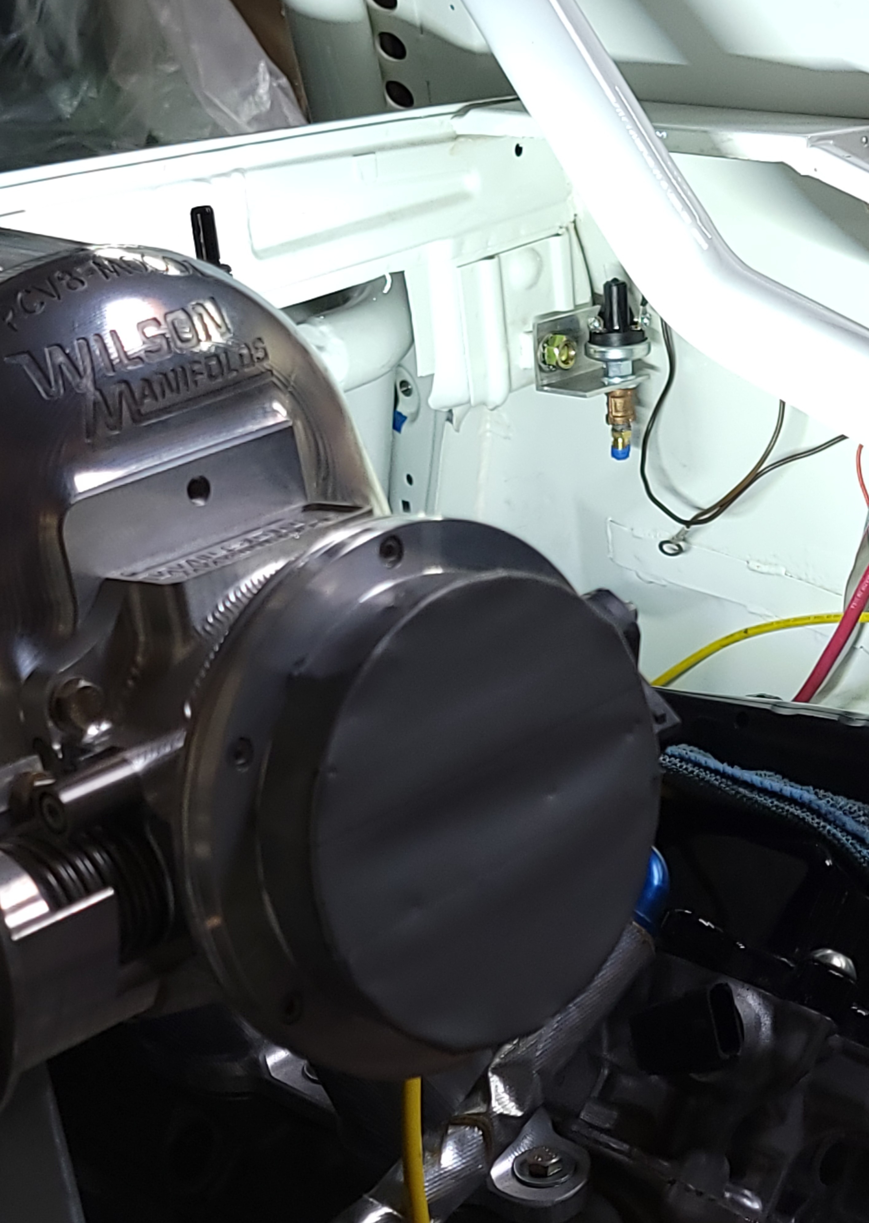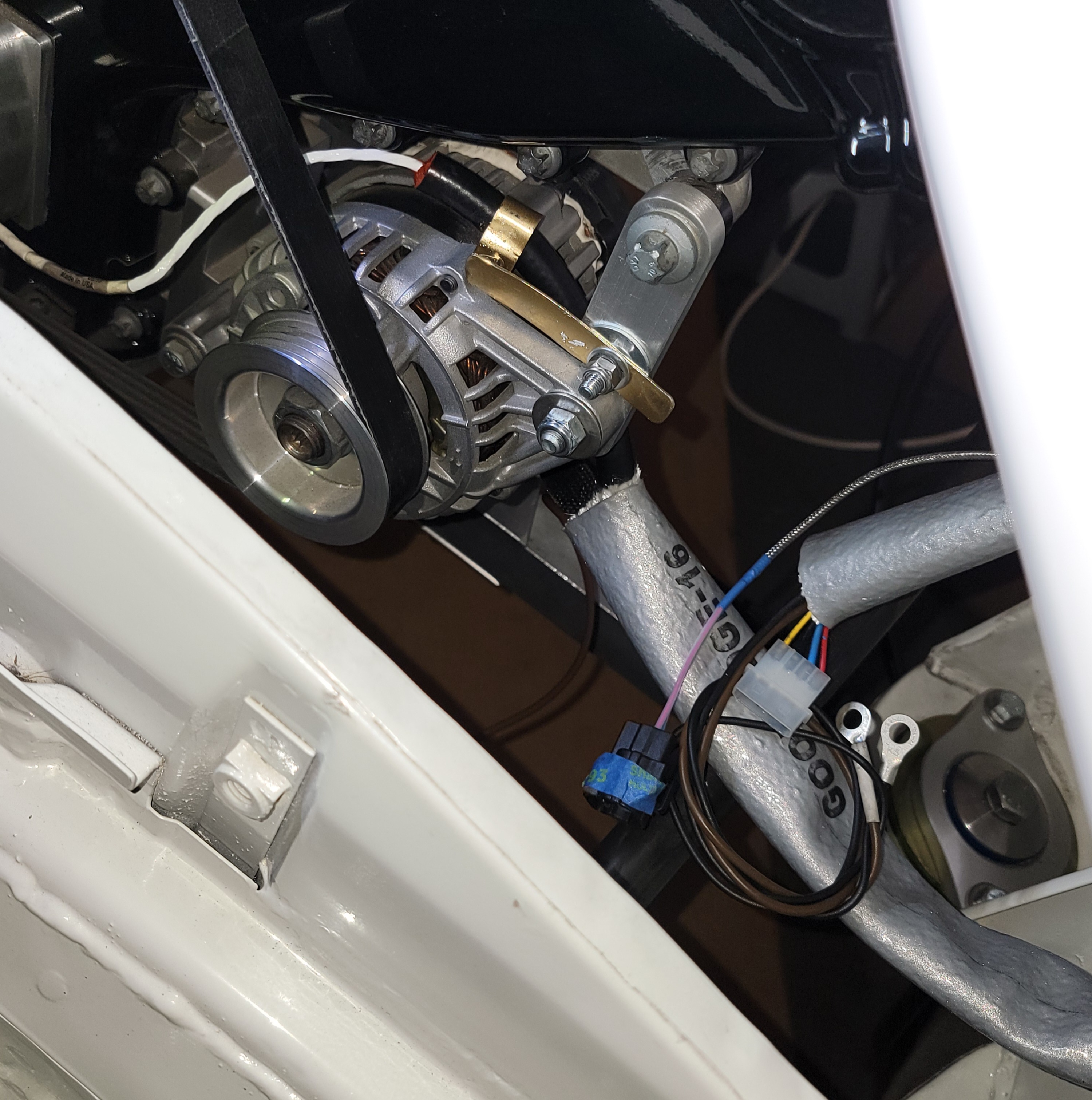 Non stop wiring...so this is small bracket that I came up with; keeps the crank trigger (small white) coax cable from running up into the alternator pulley/or belt. The #16 Goodridge firesleeve contains: the trigger cable, a couple grounds, the B+ charging cable* from alt to battery.