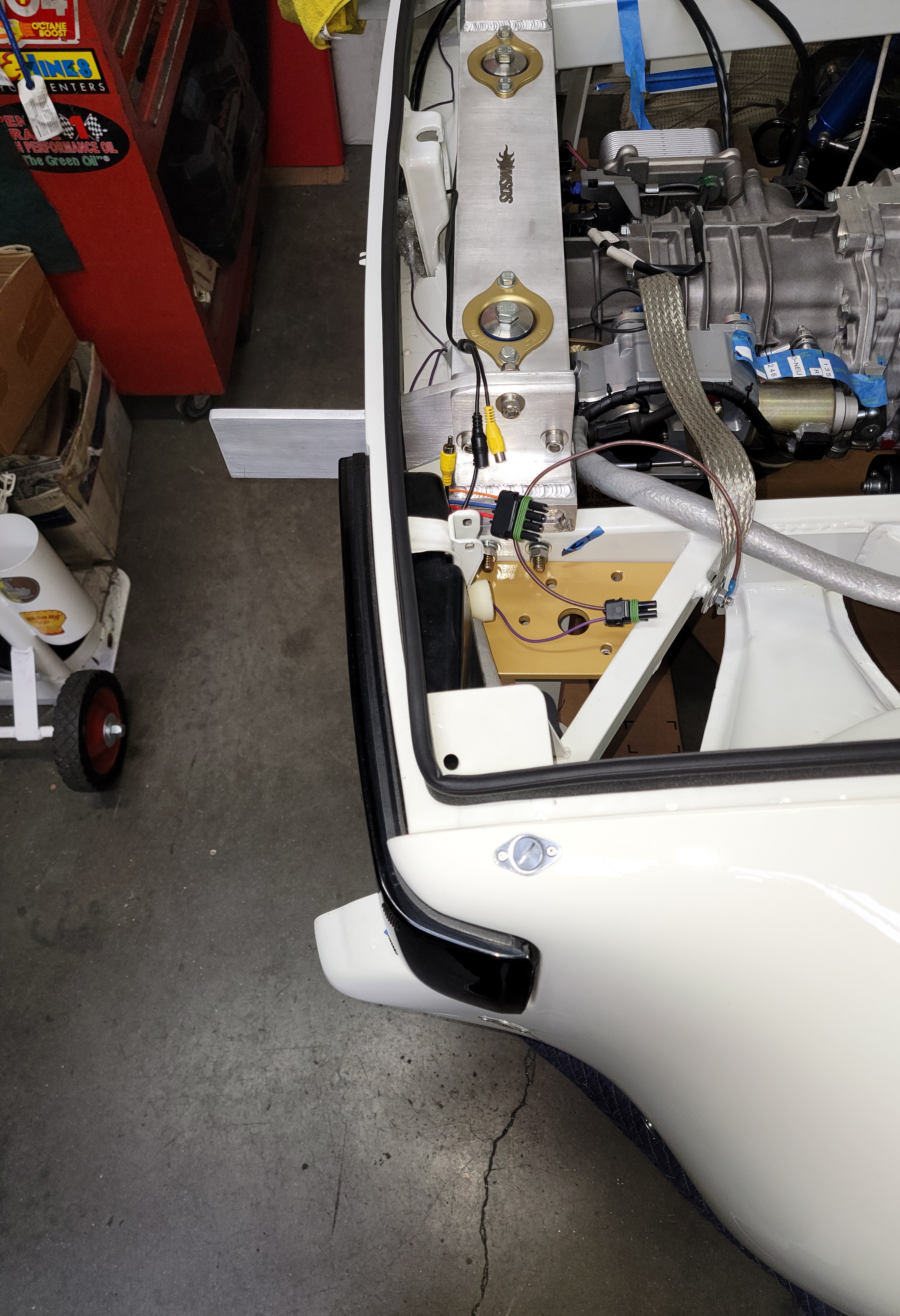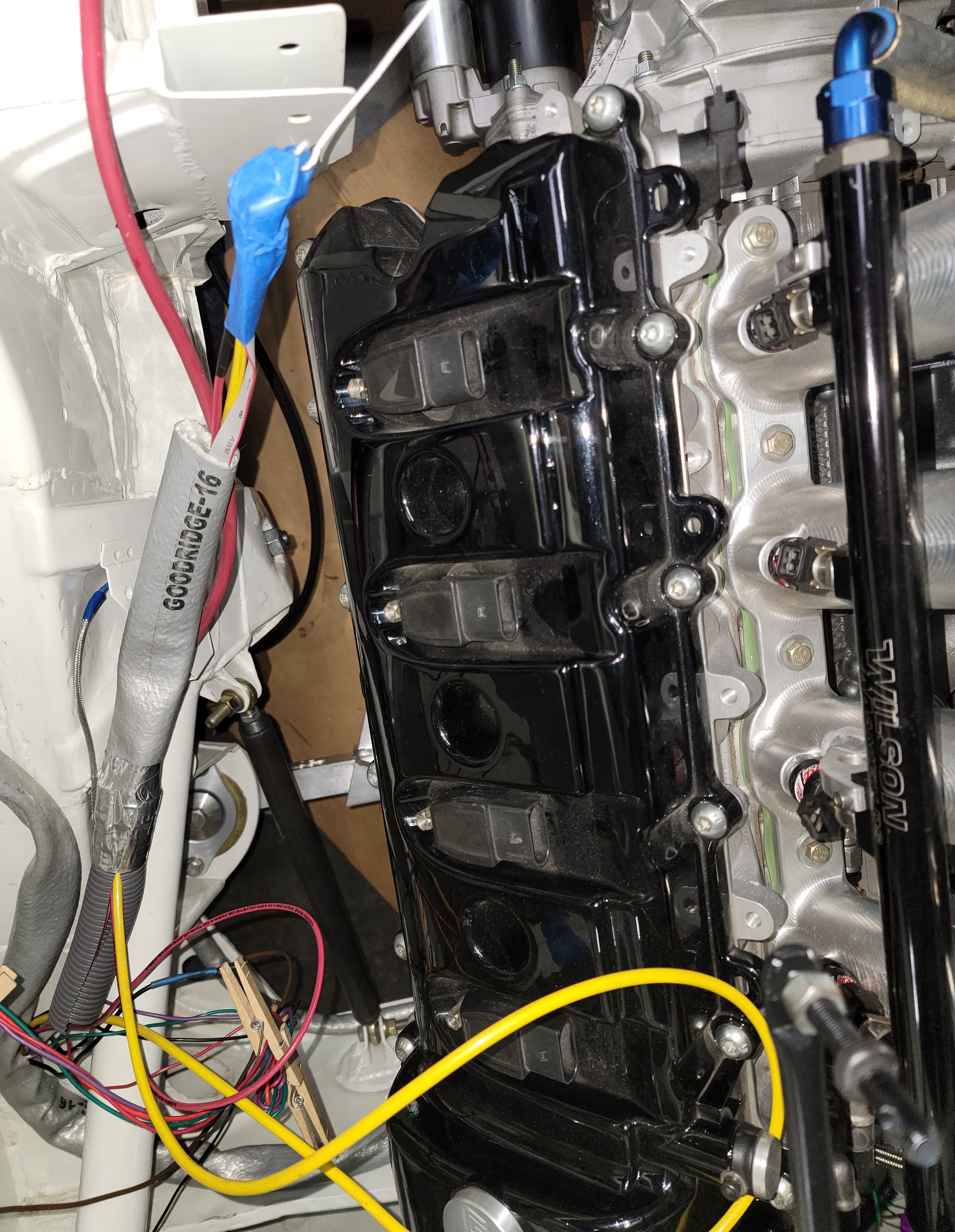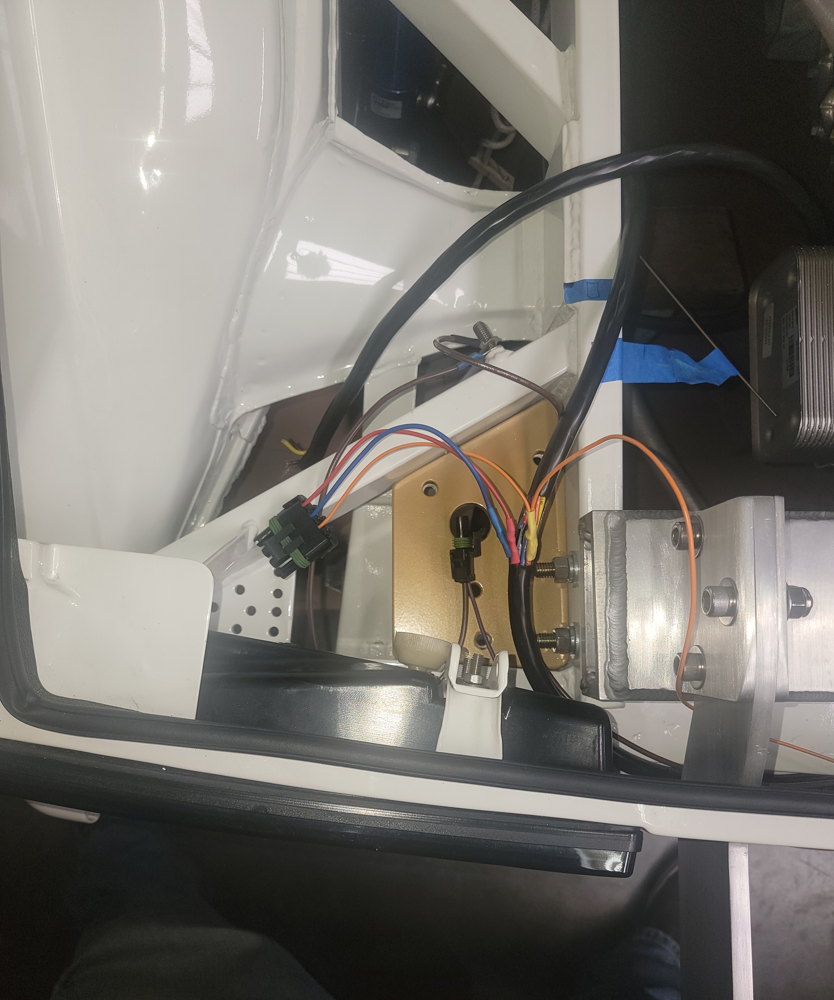 Interior multi-wire cable now totally supplying circuits to left, center, and right sides of the engine bay. 12v Coolant pump for the transaxle cooler will be on a manual switched circuit, not triggered by the oe temp switch.