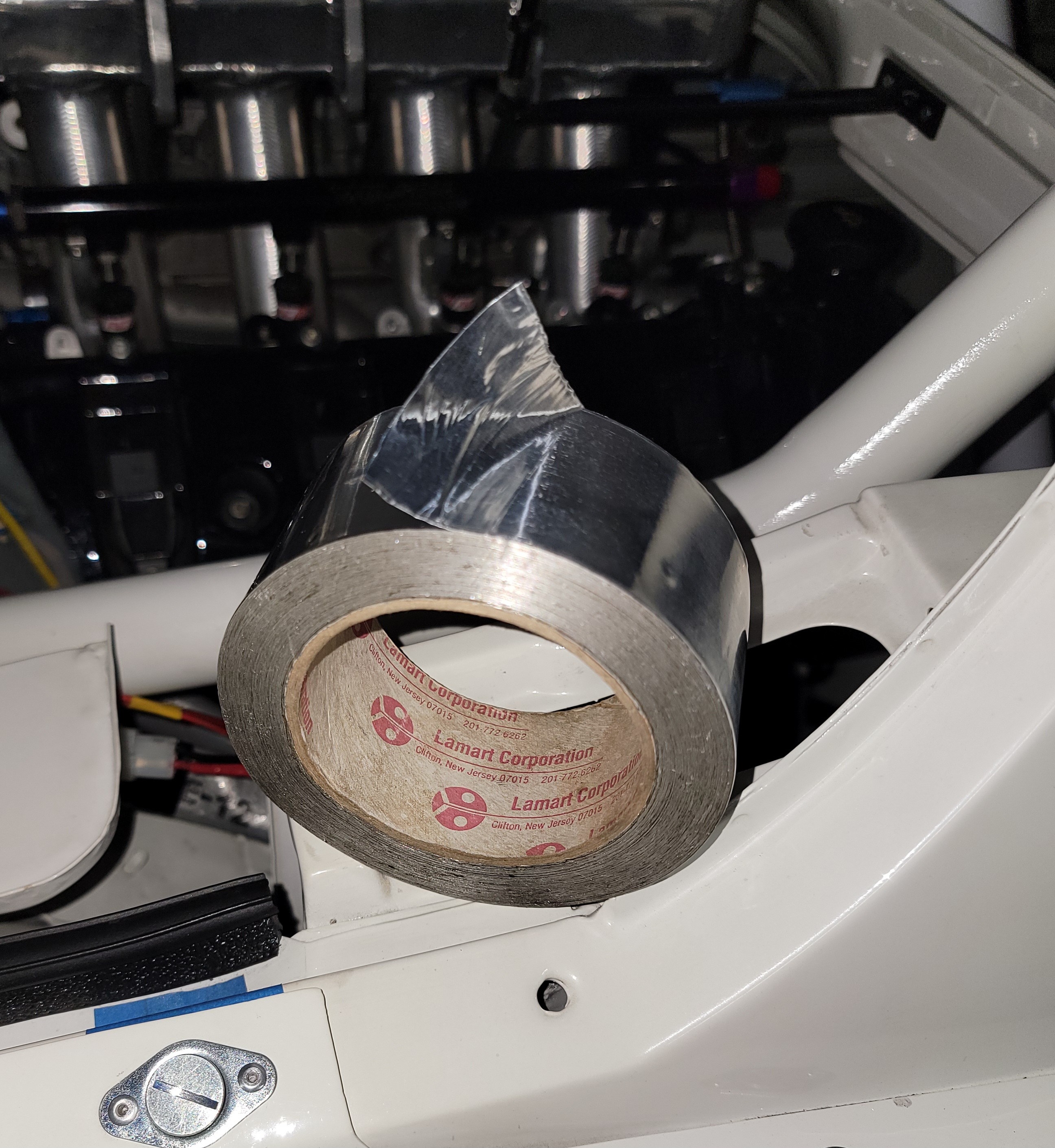 Still having lots of fun pulling wires through Goodridge fire-sleeve. Customized end on one side mates to a curved split-wire sleeve. I found a very special roll of "Aero grade" aluminum tape in the toolbox to join the 2 together.