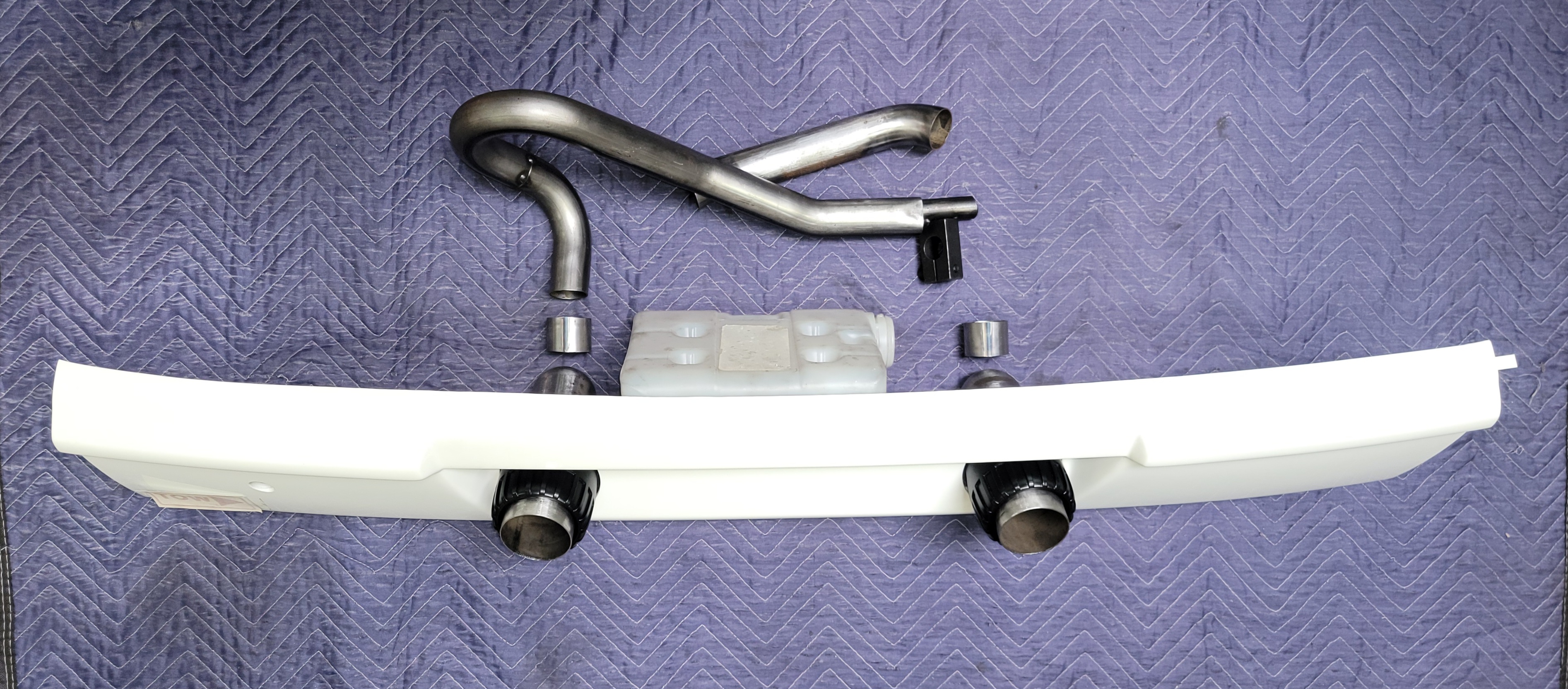 The goal was to move exhaust gas from left and right side Garrett turbos, but we have decided to vent the Left + Right wastegate exhaust down to the rear of the 914 instead; and the turbo exhaust out the top of the rear trunk lid...race car (or even 918) style. Routing 1¾" header tube around the drivetrain 'Maze is so much more compact compared to dual 3" dia tubing. Cooler engine bay temps as well, the wastegates oscillate the dispersing of exhaust gas, wherein the turbo exhaust is a constant flow.