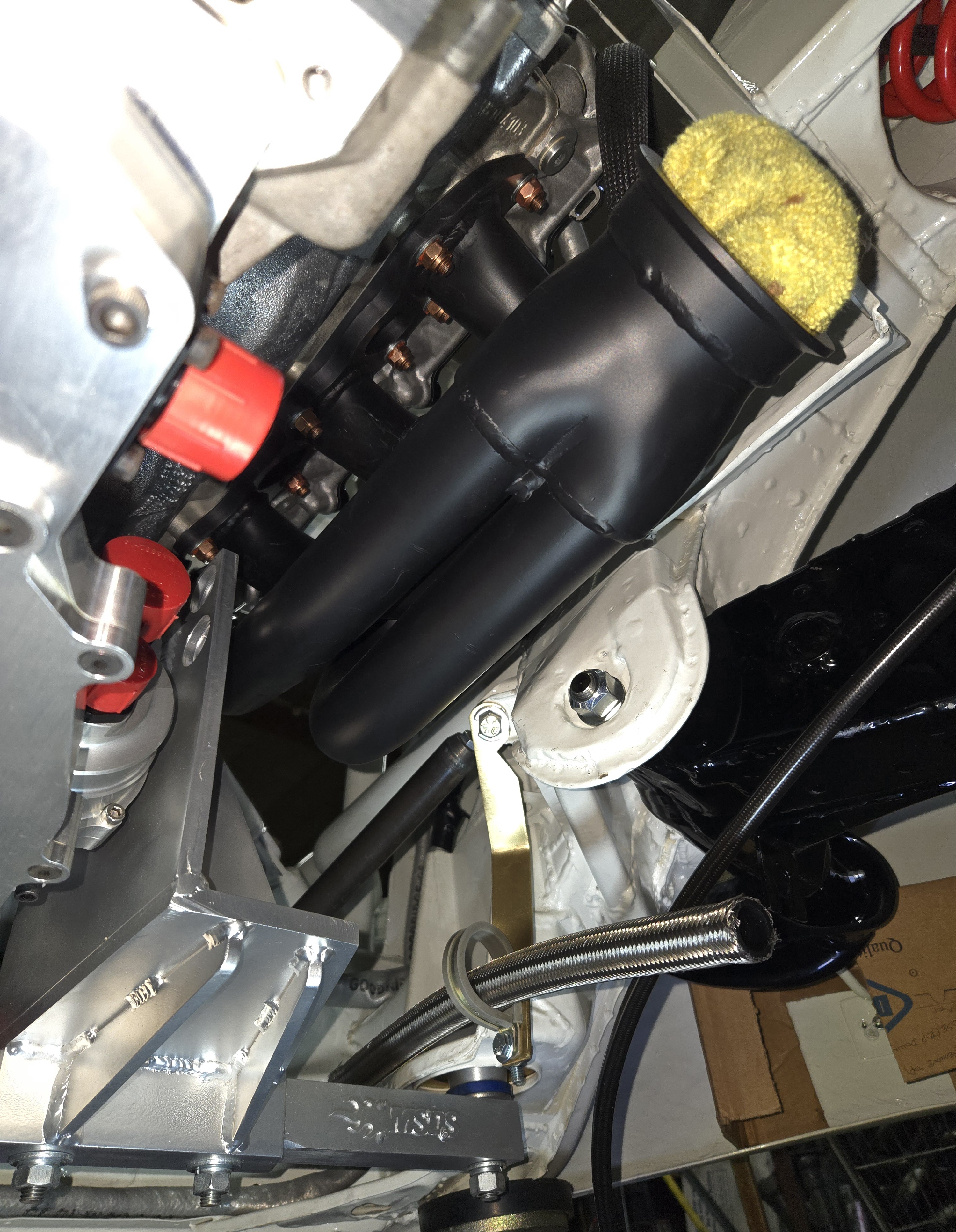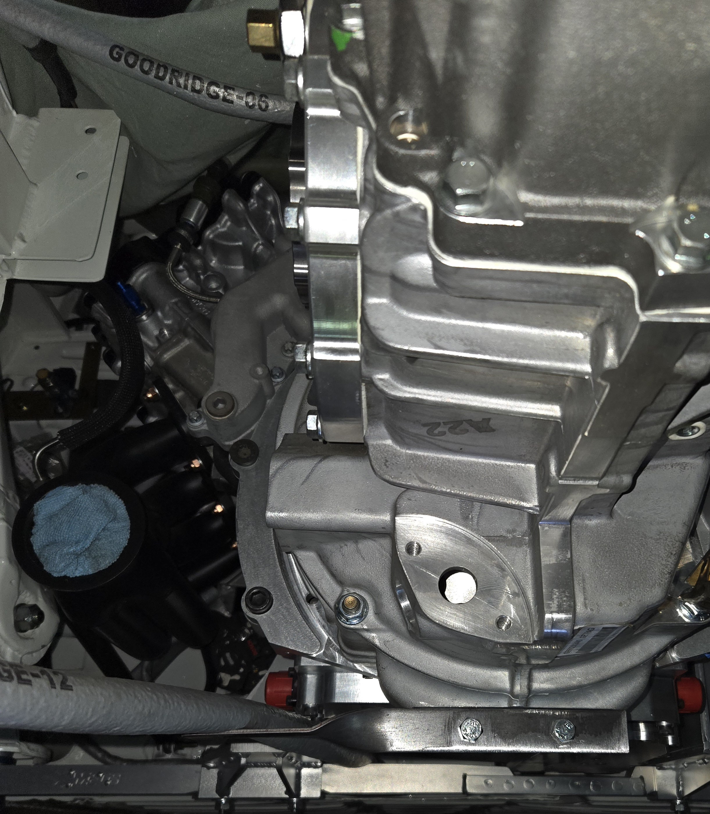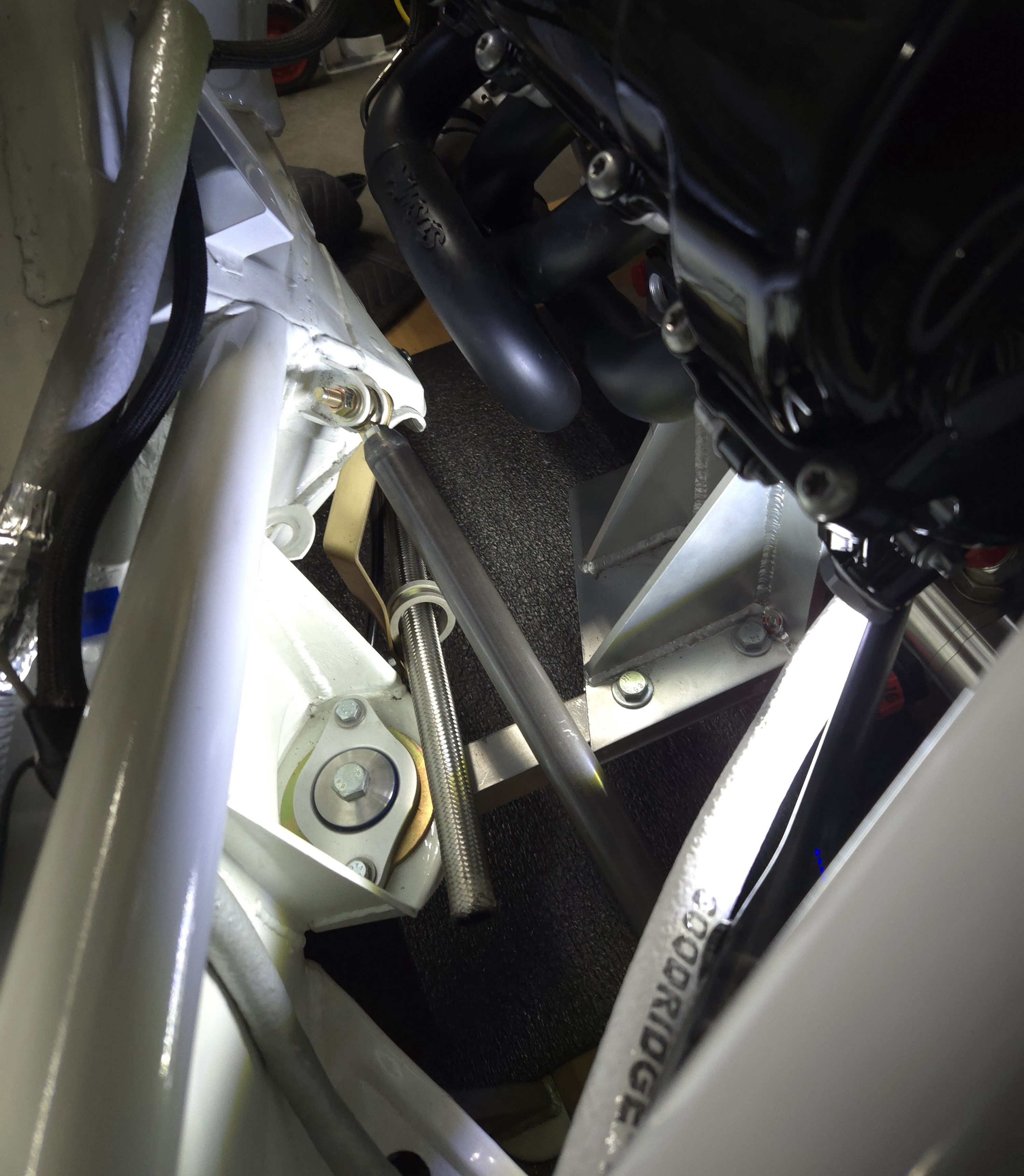 Bullet Point 1) snorkel hold down. 2) Left and Right headlight brackets. 3) Under transaxle bracket for SQS shift cable/combo with #16 oil line. 4) #16 oil line, running in the location of right side motor-mount bucket/ unibody area. Oil lines + shifter cable will both be encased in Goodridge fire-sleeve. |