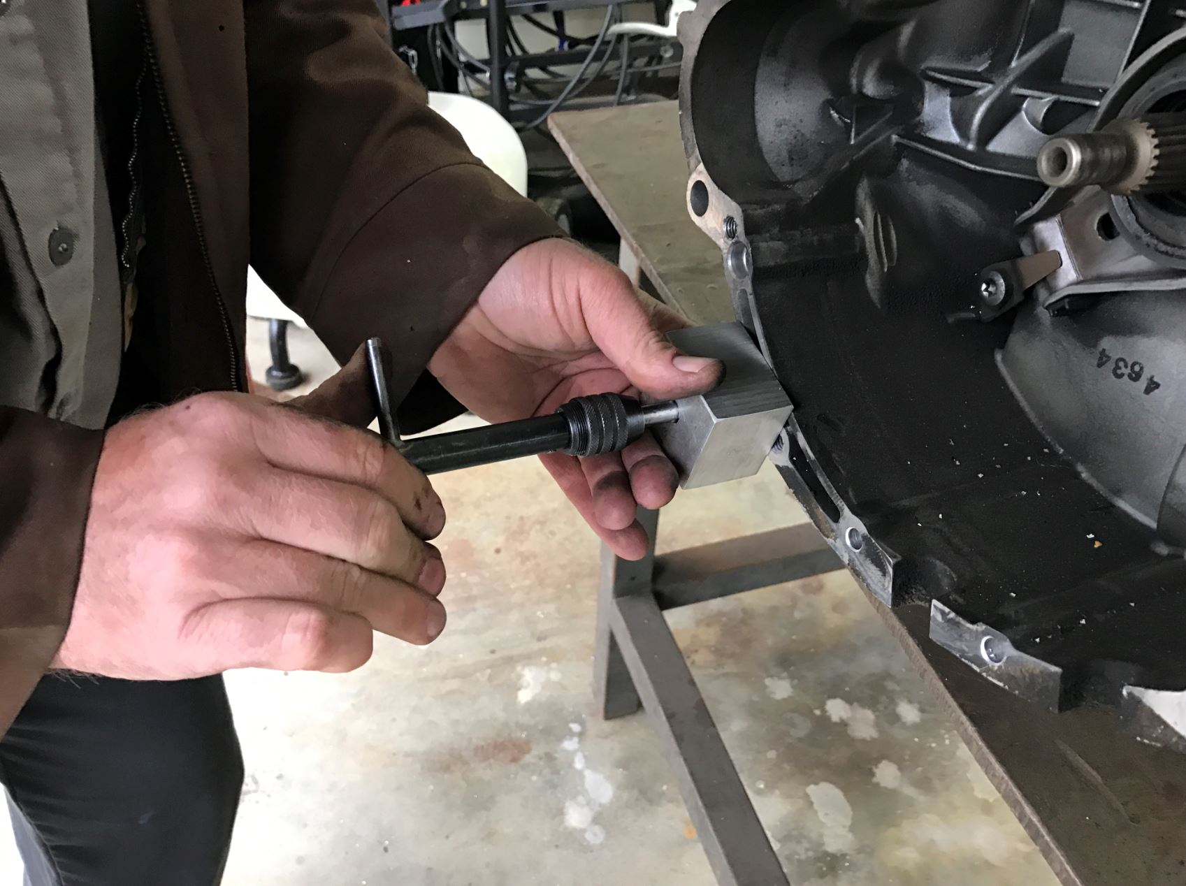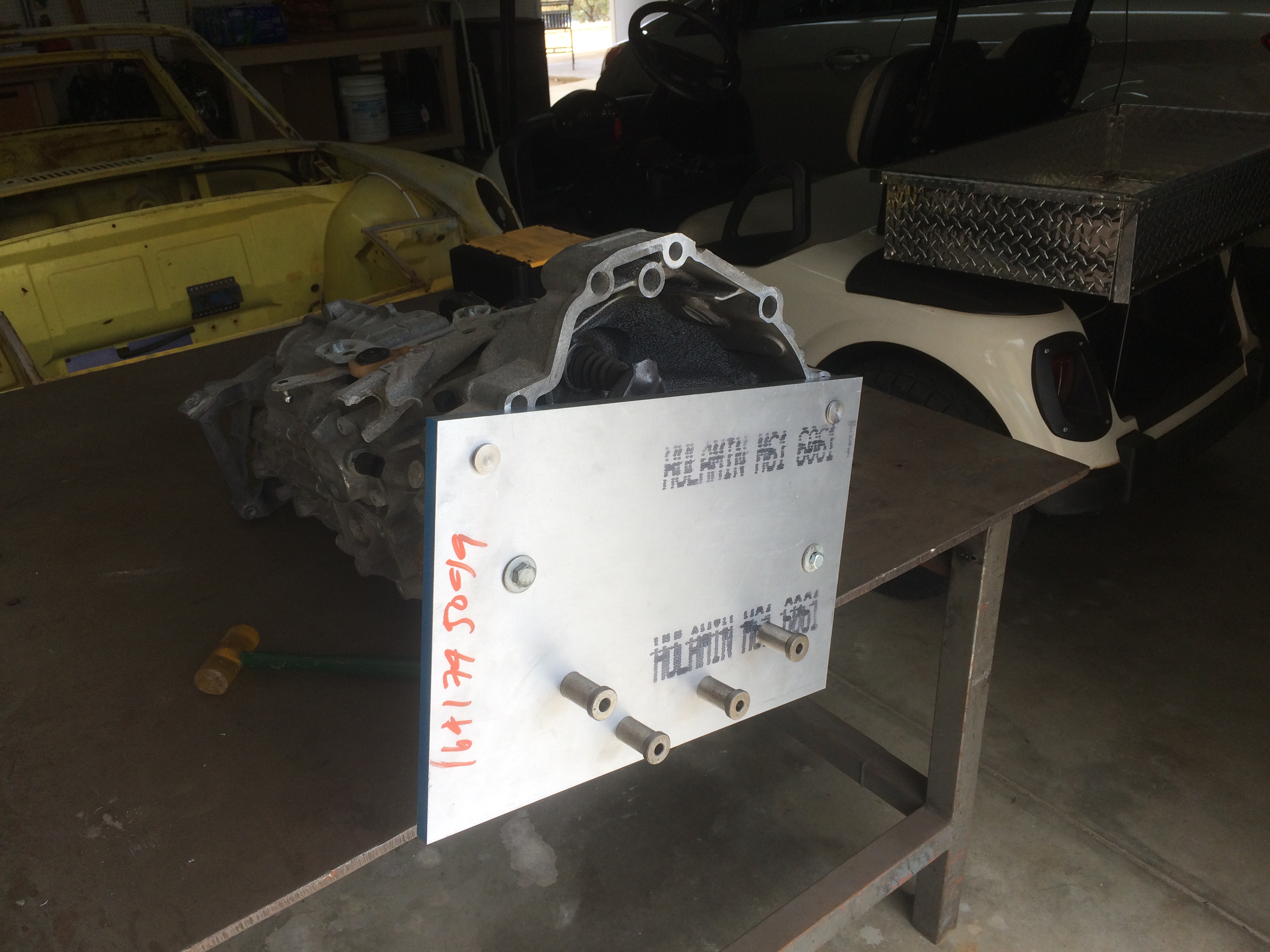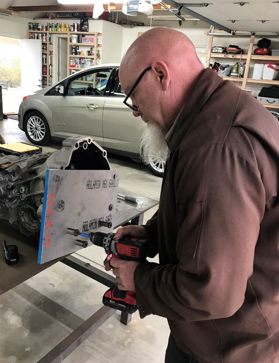 I went down South to Chip's house and he tapped in four additional studs to the Cayman transmission. You can see them in the first picture (Chip's motor and trans). He machined up a trick jig and was able to set it up and tap the trans in about five minutes. For those of you that may want to do this, these studs are not mandatory but we like our belts and suspenders around here.