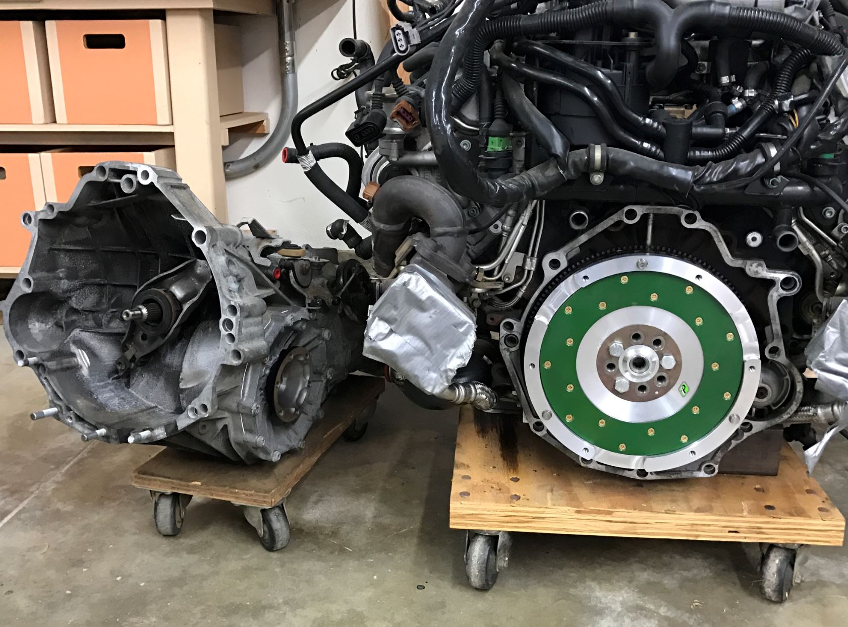 OK this weekend I mated the Cayman Trans with the Audi motor. I started removing all of the excess piping and tubing that are unnecessary (IMG:style_emoticons/default/smile.gif) (IMG:style_emoticons/default/smile.gif) . It really started to clean that rats nest of tubing up quite a bit. I'll post pictures when done. Hoping to place motor in this weekend and then make the motor mounts. Chip will then start mocking up for the custom headers. I'd like to have the motor completely bolted up this month since I will not be able to work on the work for the first two weeks of April.