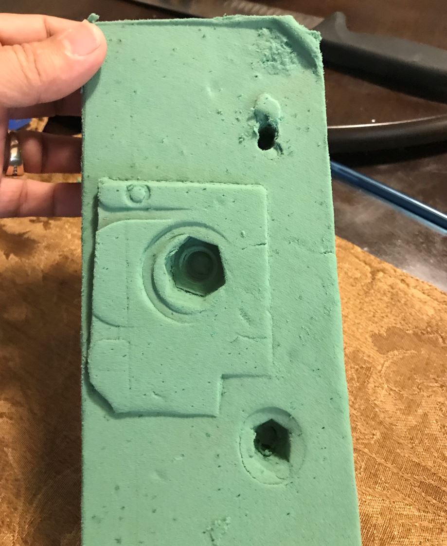 Well I went to a hobby store and bought some foam that they use in flower shops. Then I cut and sandwiched the foam in between the strut tower and the hood. Then I closed the hood and I got the mold that I needed. Kind of like pressing a panini. Here is the mold after pressing it. Here is the bottom view Then slice at the bolt locations and get the clearance dimensions from the hood. Looks like I will be able to shove the struts up into the trunk another 2 inches. And that's how you slice it. Now I need CSDilligaf to machine the shoulder of the lower strut to be able slide into lower strut mounting point another 1 inch. Then I'll have my 4" of clearance "unloaded". |