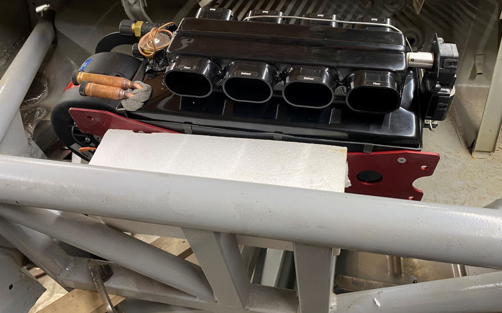 This thing is super cool. (Sorry, couldn't help myself.) Do you think it might fit into the stock area in a 914 with a standard fuel tank if the expansion tank and factory fresh air box are removed? Does it get under the cowling? Simple answer is no, mocked one up a while ago. But if you don't mind a bit of cutting on the separator panel then yes it will fit, have to move the cowl support or build a new one, and it gets in there just fine. Added benefit is the floor heat venting actually works, for pure A/C it does not matter that much. And the wiper mechanism is out of the way if your worried. Lots of room there just not a lot of depth, you have to pull it over to the passenger side as you have steering shaft going into that area also. One thing I was messing with was moving the blower off the unit to gain a bit more in the packaging space. Can't remember if you lost the washer bottle or not, not a big deal, plenty of Modern VAG cars have remote washer bottles with electric pumps that would fit under the gas tank and keep the fill high. All about packaging. This build it will not be an issue at all. Keep rocking this one (IMG:style_emoticons/default/aktion035.gif) |