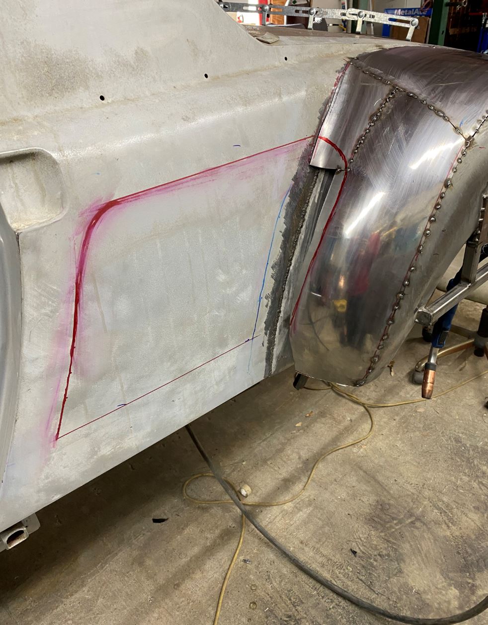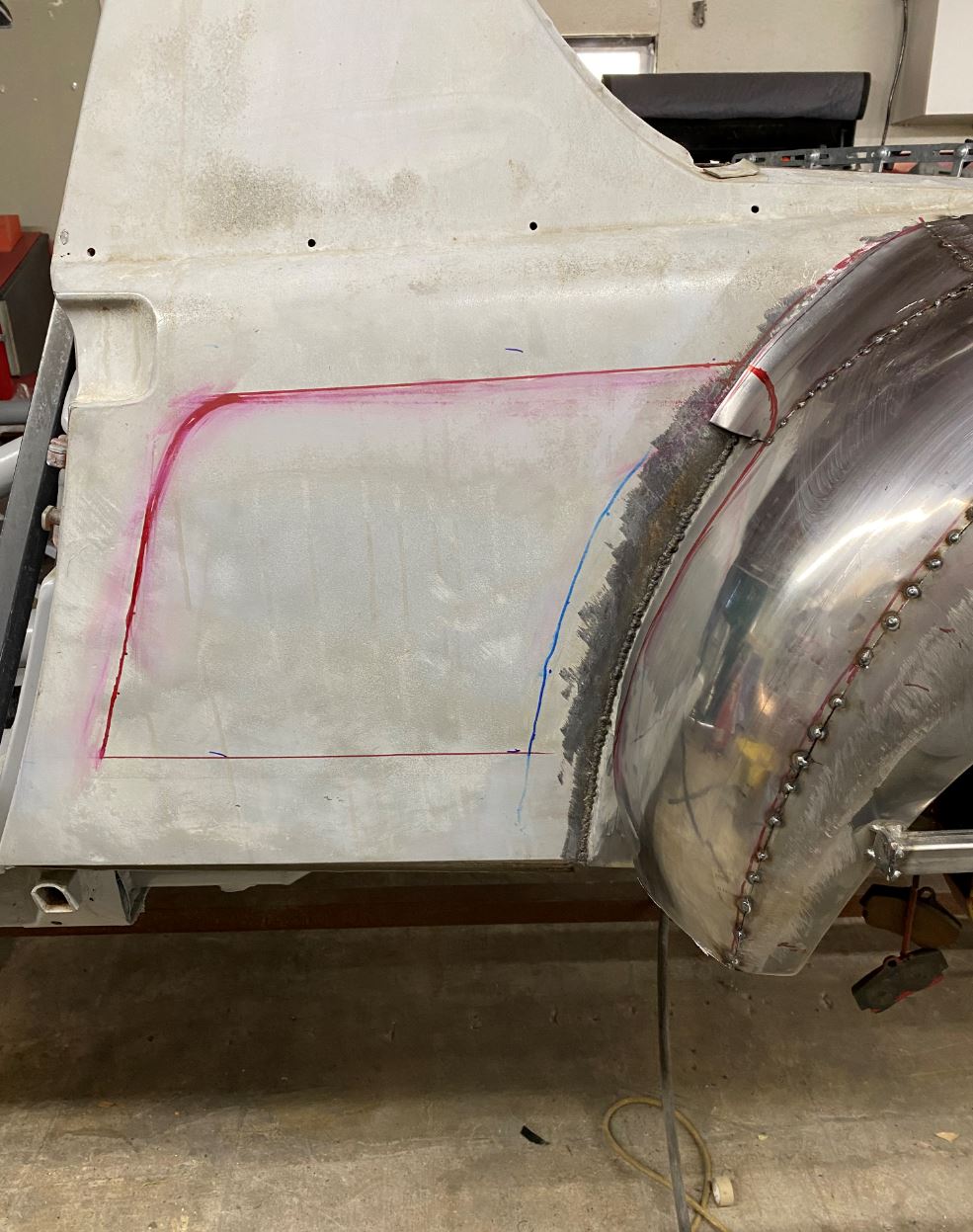 This is the direction that I'm going with to cut in the 1/4 panel to couch the air to water intercoolers as well as the cold air intakes. The cut will taper from o" depth at the door to 12" depth at the back. Notice how the top cut line is not level, it actually tapers up to follow that ever so slight rise in the 914 silhouette. The bottom line is parallel with the rocker panel. By the way does anyone know how tall those Porsche side panel stickers are? The ones that go along the bottom of the door. I need a pair but in the negative. I'm thinking of dark metallic charcoal grey for the entirety of the car and then spraying the Porsche sticker logo in a Carrera silver along the bottom of the doors, like the stickers. I may continue that silver into the intake at the 1/4 panels. The rockers will be in black and they will follow the silhouette of the fenders. |