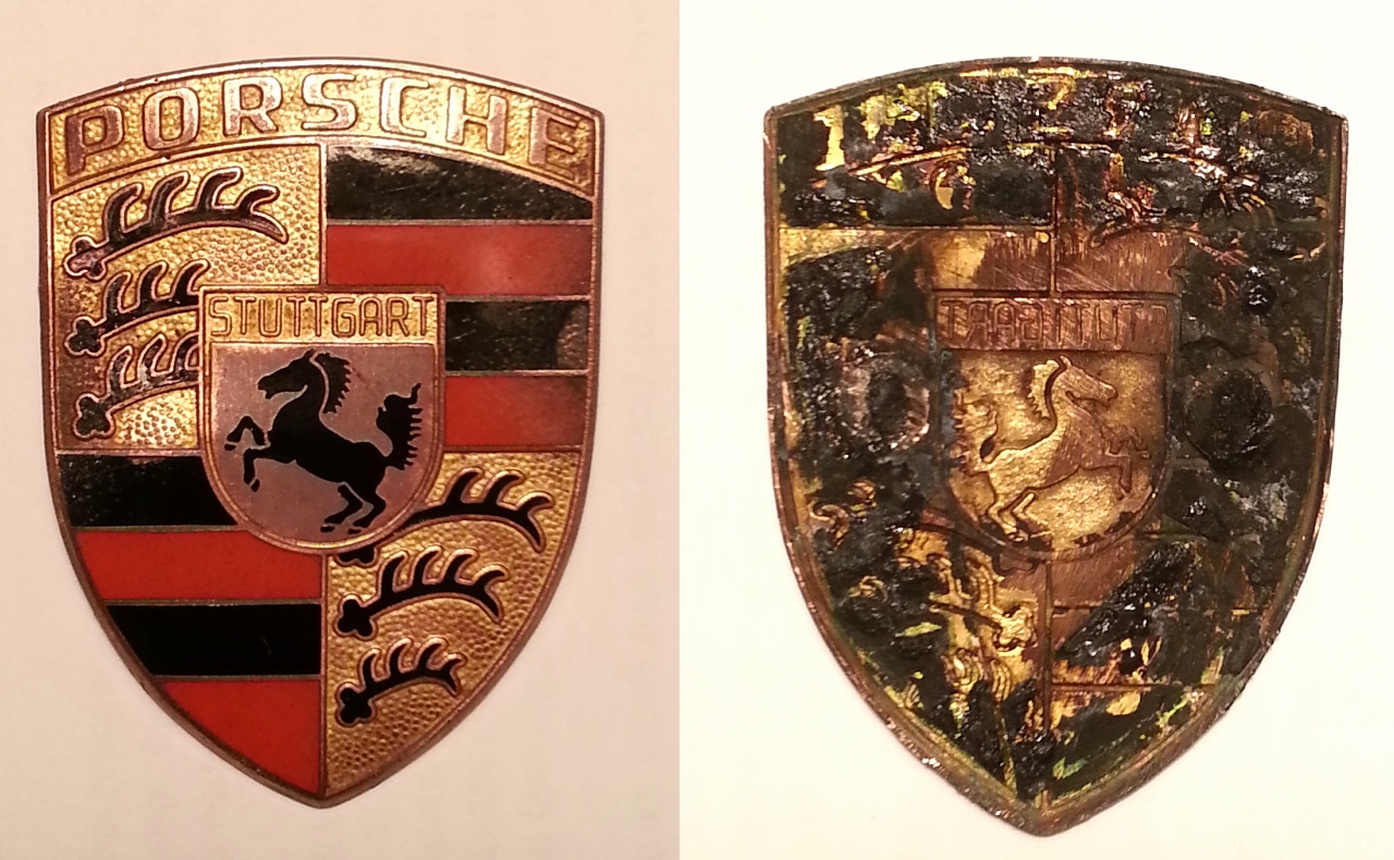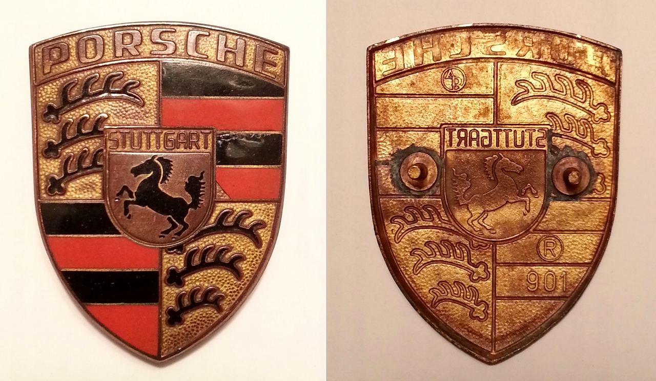 Both badges are in good, original and unrestored condition. One badge has both pins in back and ready to install. The other has no pins (this one was on the hood secured with a sticky adhesive, since removed). Vintage OEM Genuine Porsche Orange Bar Badge Hood Emblem (no pins): $300 Vintage OEM Genuine Porsche Orange Bar Badge Hood Emblem (has both pins): $400 |