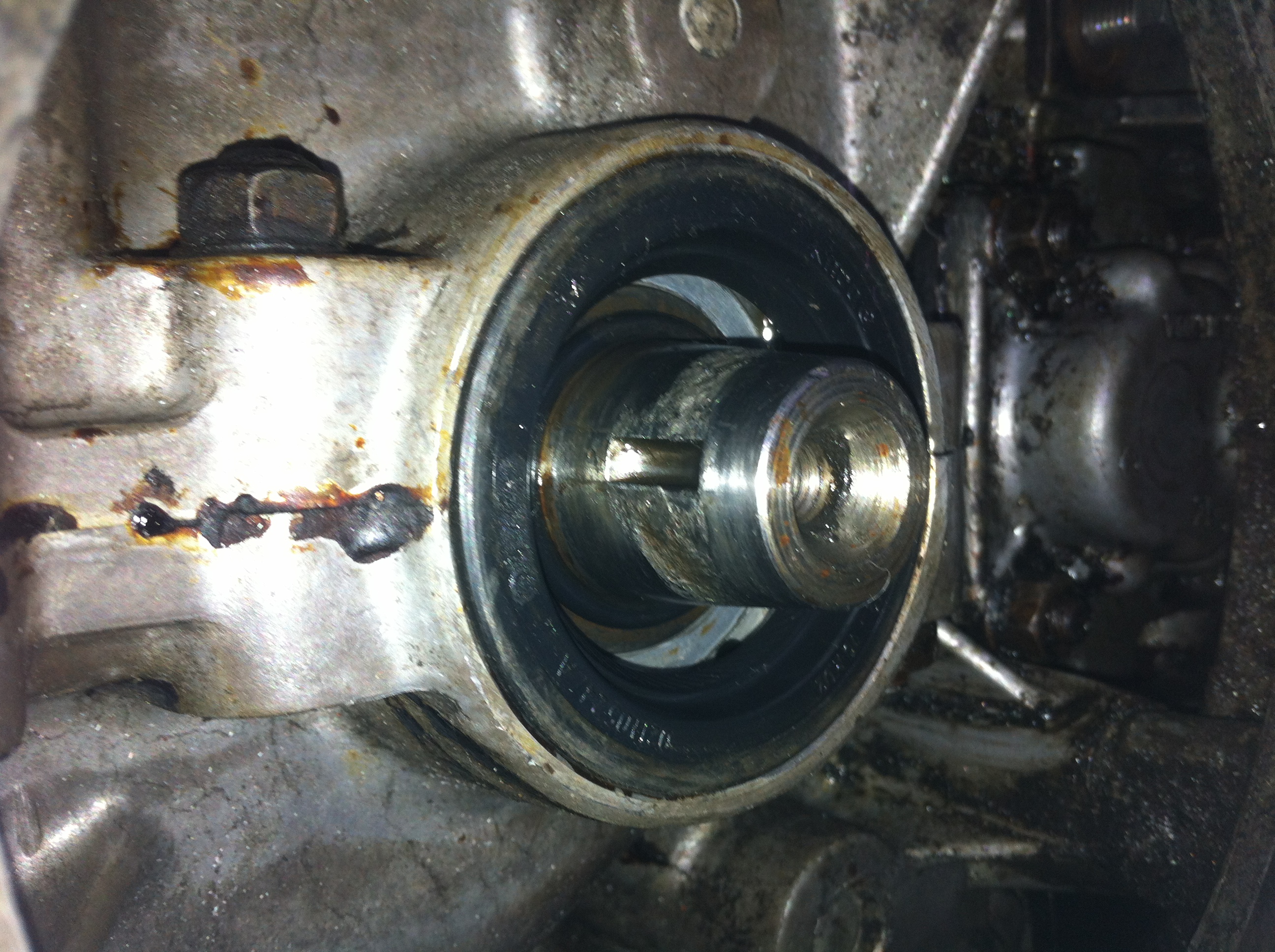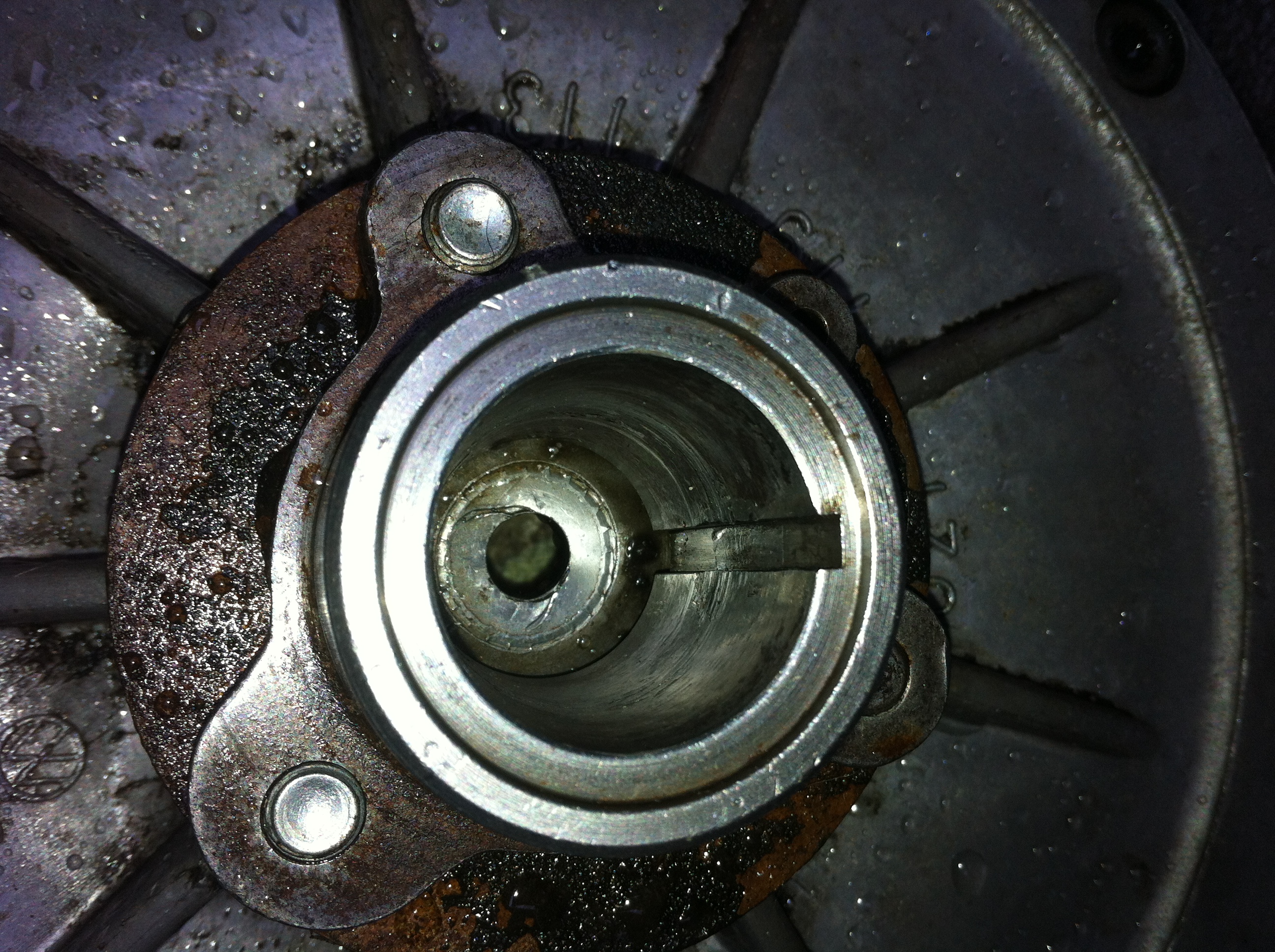 I'm letting the boy work on this as it's his car and he should be able to turn a wrench. The car overheated and he didn't know why. So we figured it was an obstructed oil cooler, or flaps may have been closed. After poking around and checking he found the fan has come loose. From what I can see with a mirror the center bolt has backed out and is MIA. Along with missing center washer. What should I be looking at here? I would have thought that an alternator light would have gone on too after a short while. Question for the Capn or anyone else. Can this part of the crank be repaired through a welding process? I am thinking either directly welding or metal spray. Then repair the taper shape? Or is it just not worth the trouble? |