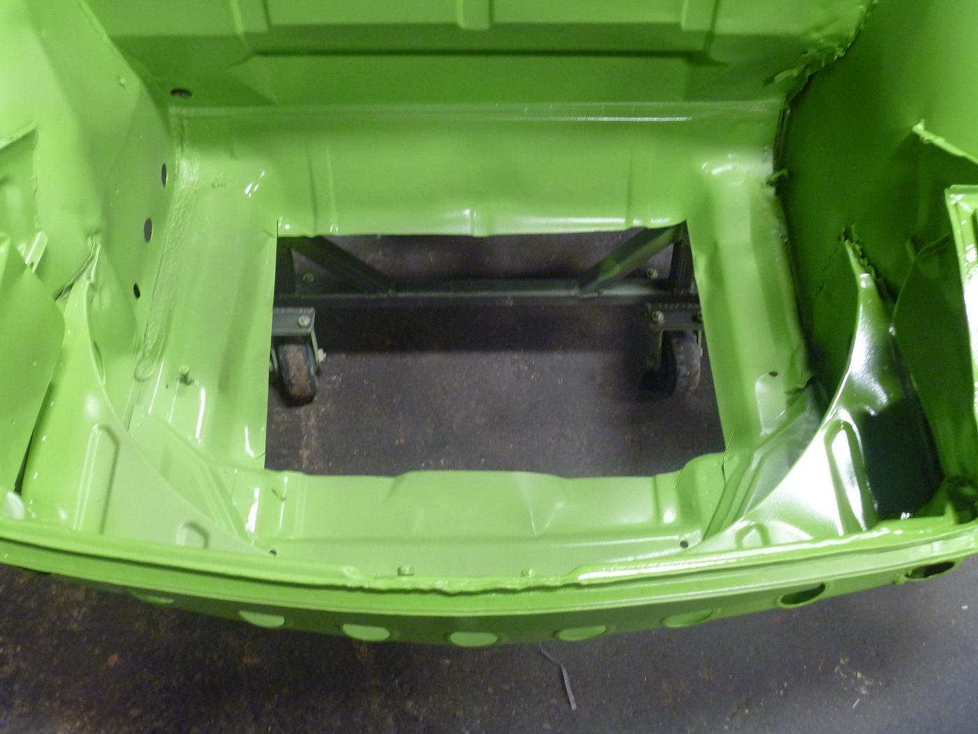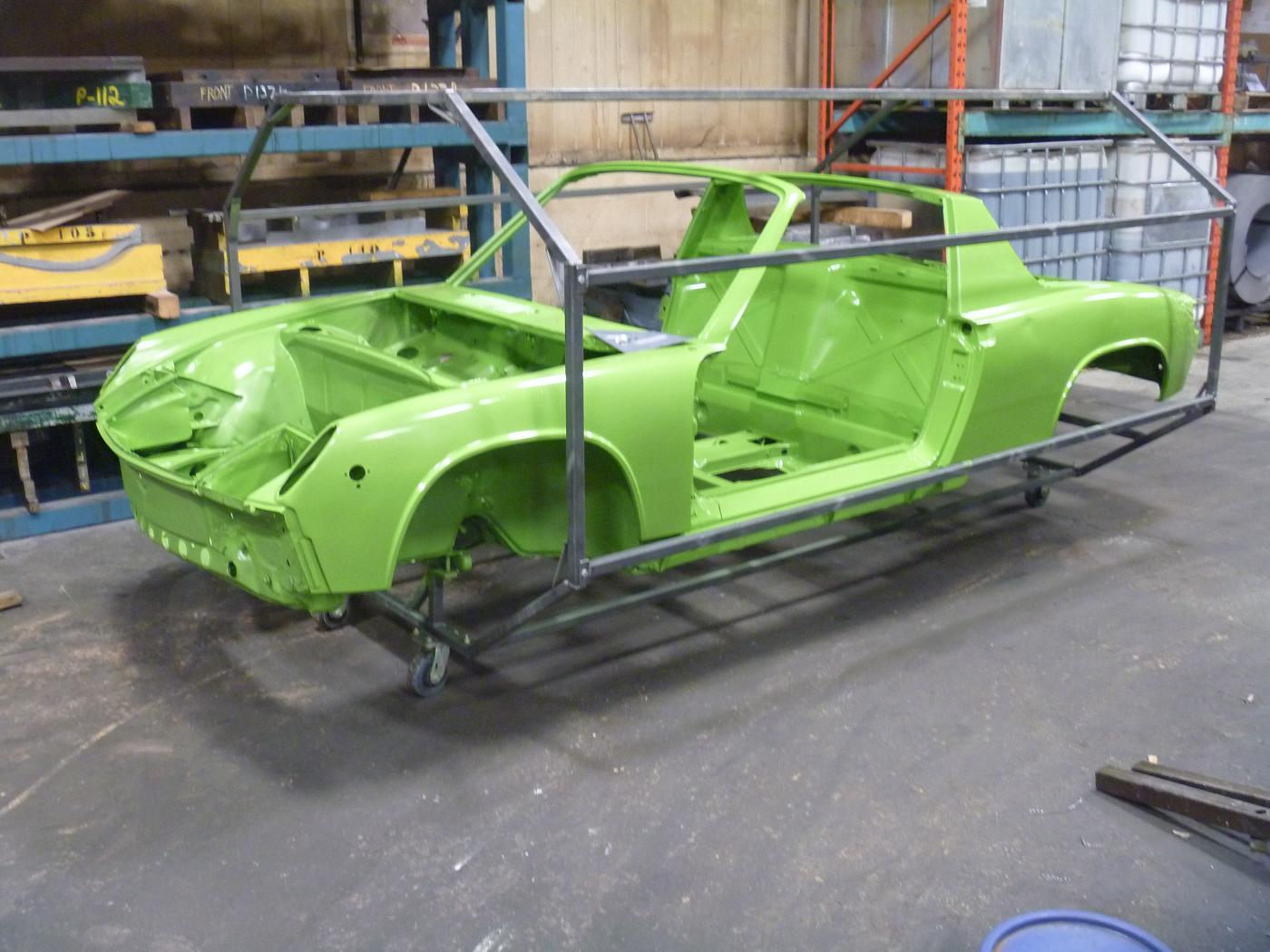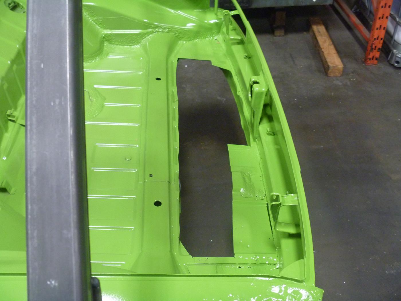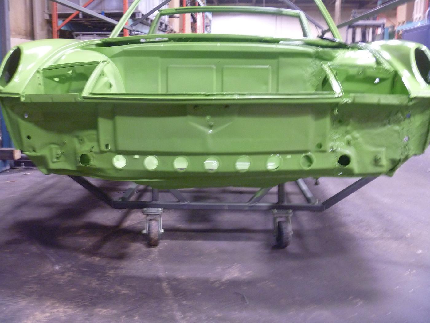 we will be starting with the clam shell stiffening kit we sell. We painted the car green so when we bring the car to shows it will stand out. there was front end collision damage that was repaired at one point, so we will have to redo this properly. we will also have to install floor pans, rear trunk floor, left rear quarter and the front trunk floor |