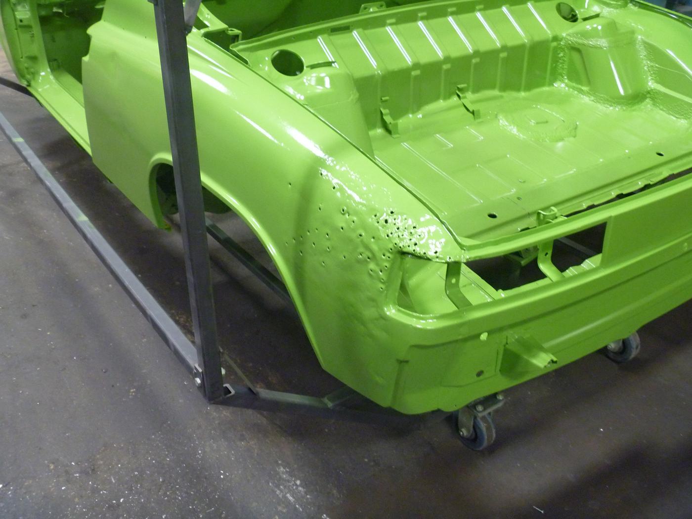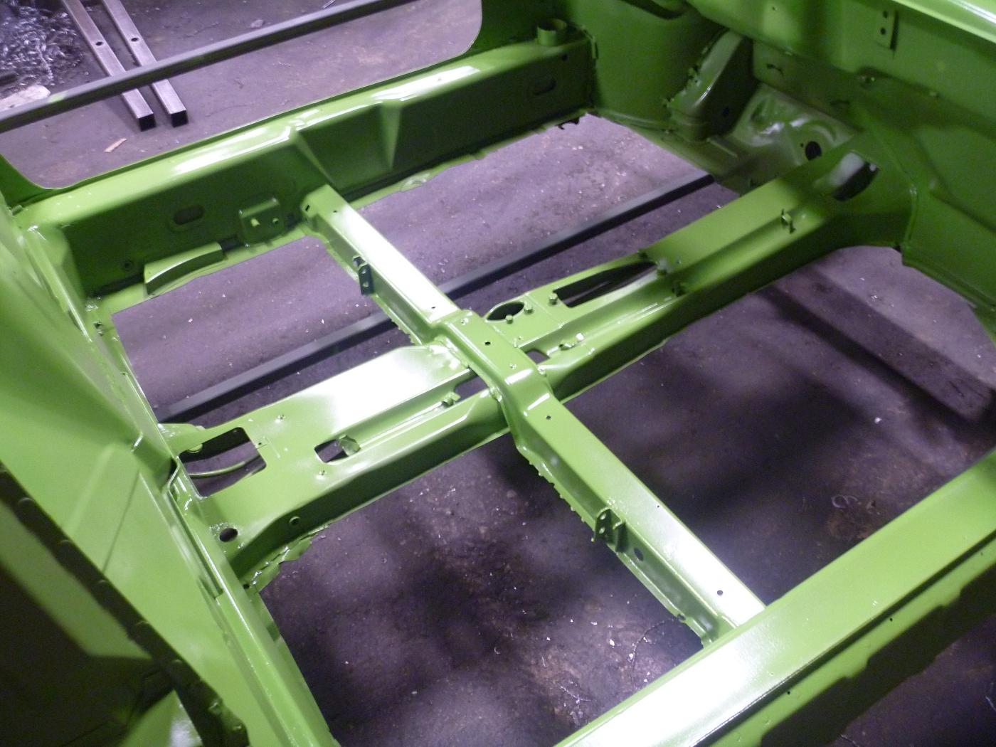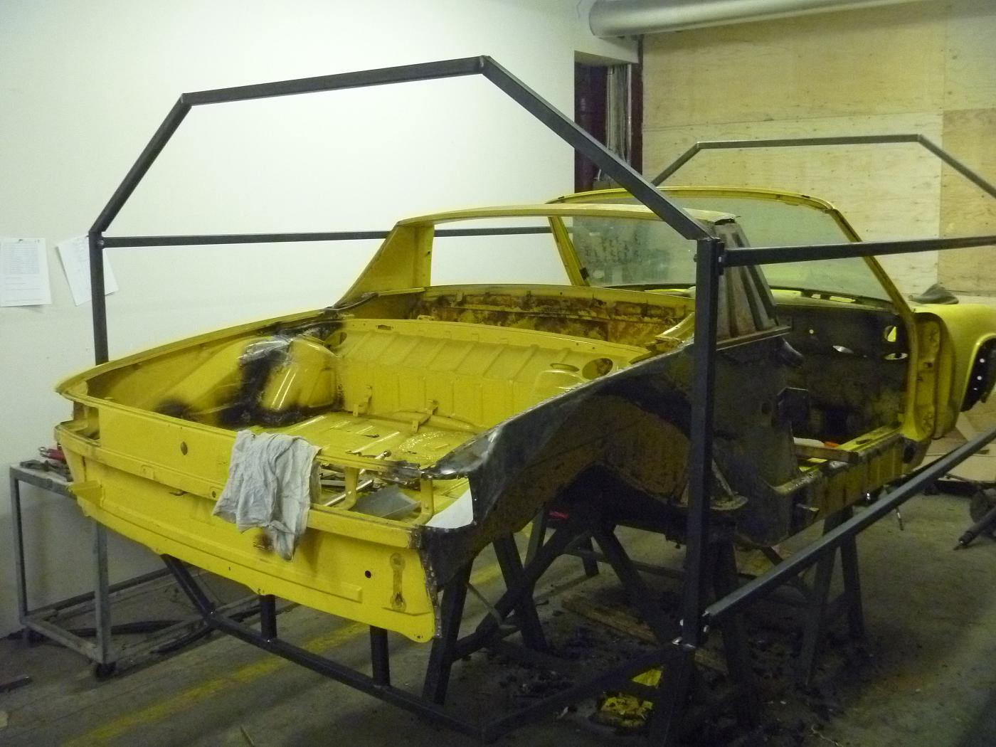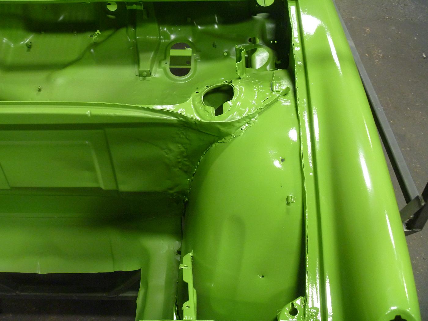 we will be starting with the clam shell stiffening kit we sell. We painted the car green so when we bring the car to shows it will stand out. there was front end collision damage that was repaired at one point, so we will have to redo this properly. we will also have to install floor pans, rear trunk floor, left rear quarter and the front trunk floor |