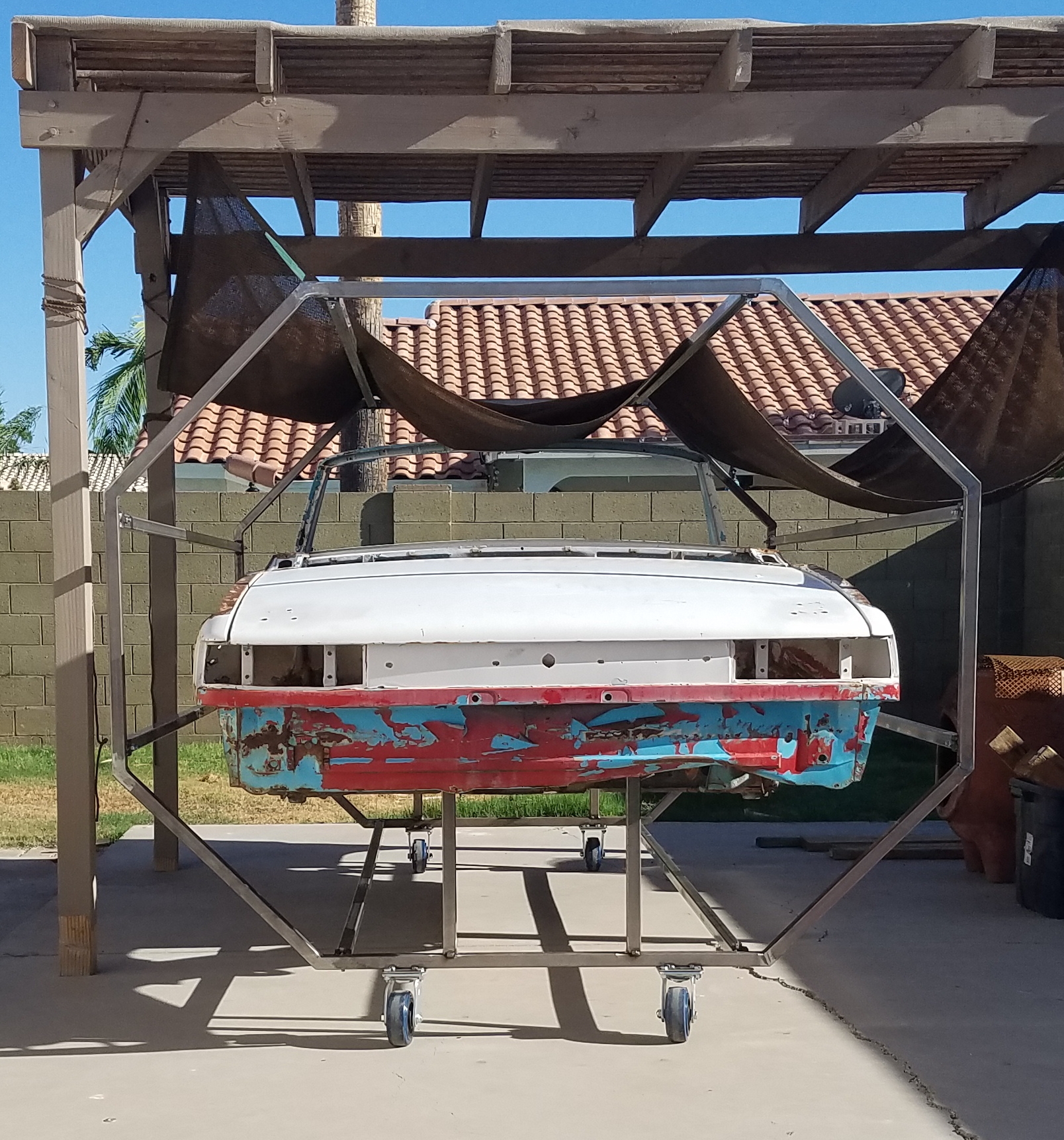 Thanks for the design guys! I added a few inches to the mounts to raise the shell, maybe not a good idea but fixable if it makes it harder to roll over? Not finished welding yet, need more bracing! but for now it is fine as it sits. This is my 'bad' shell that has holes EVERYWHERE and was used just to test fit. The nice shell is in the garage (IMG:style_emoticons/default/smile.gif) Changed it up a bit other places too: 41" horizontals 25" diag/vert mitered all 22.5degrees. I was thinking of having some 135deg gussets made on a waterjet/laser/plasma somewhere. 107 1/8" connections. 1/4" plate mounting. Link to more pics. My octisserie build |