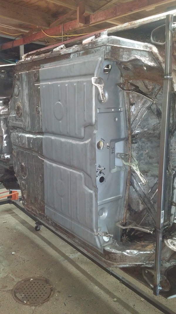 It's been a busy weekend. We got the lower outer firewall and 75 % of the floor pan welded in place. It took some time making sure the measurements where right. Installed the Tangerine firewall shifter bushing prior to installing the floor pan. Just an FYI if anyone is going to use the RD lower fire wall. You will need parts off your old firewall welded onto the new one. There's an inner shifter bushing plate, e-brake tubes, speedo cable tube, and the brake proportioning valve bracket.