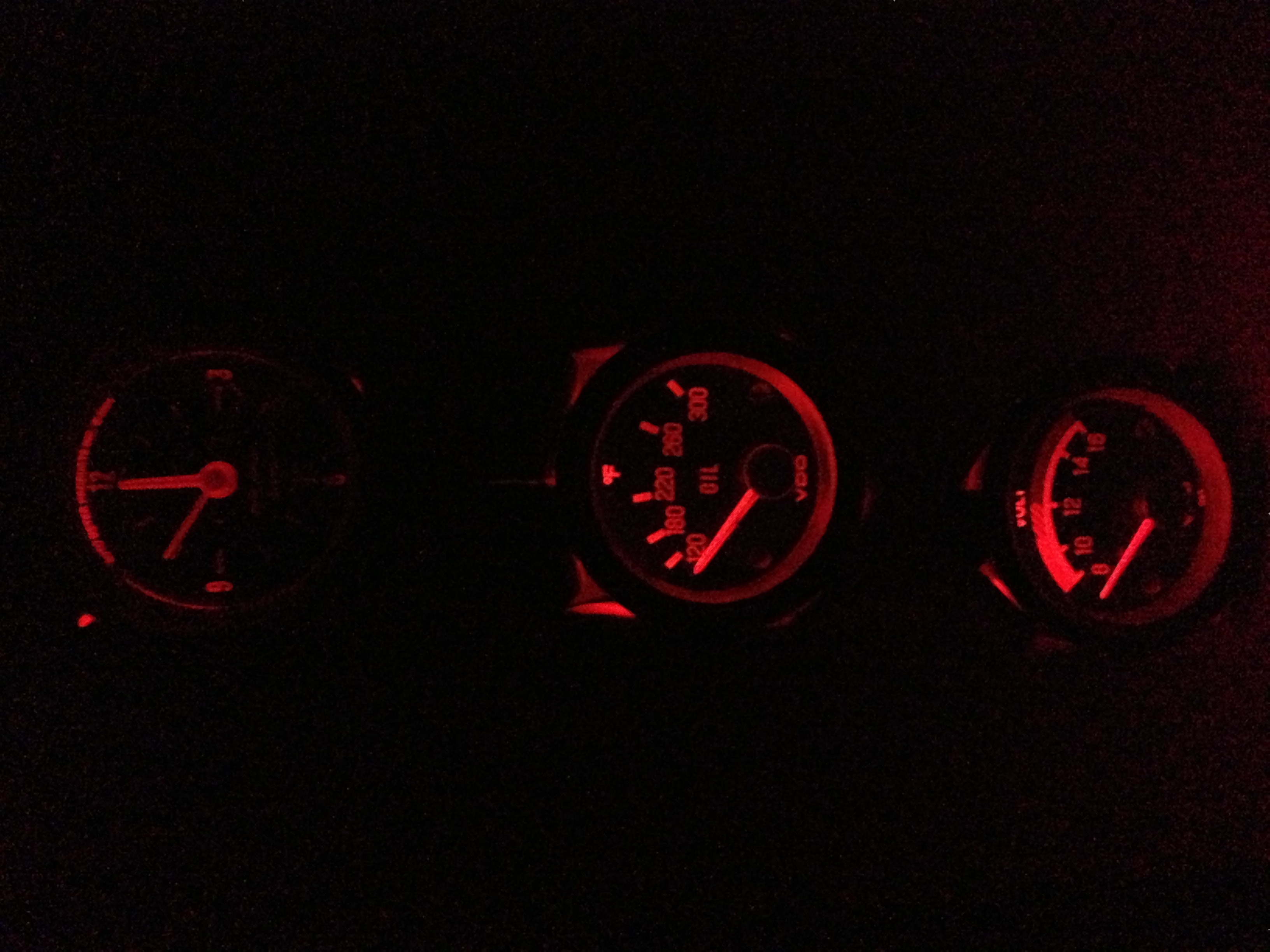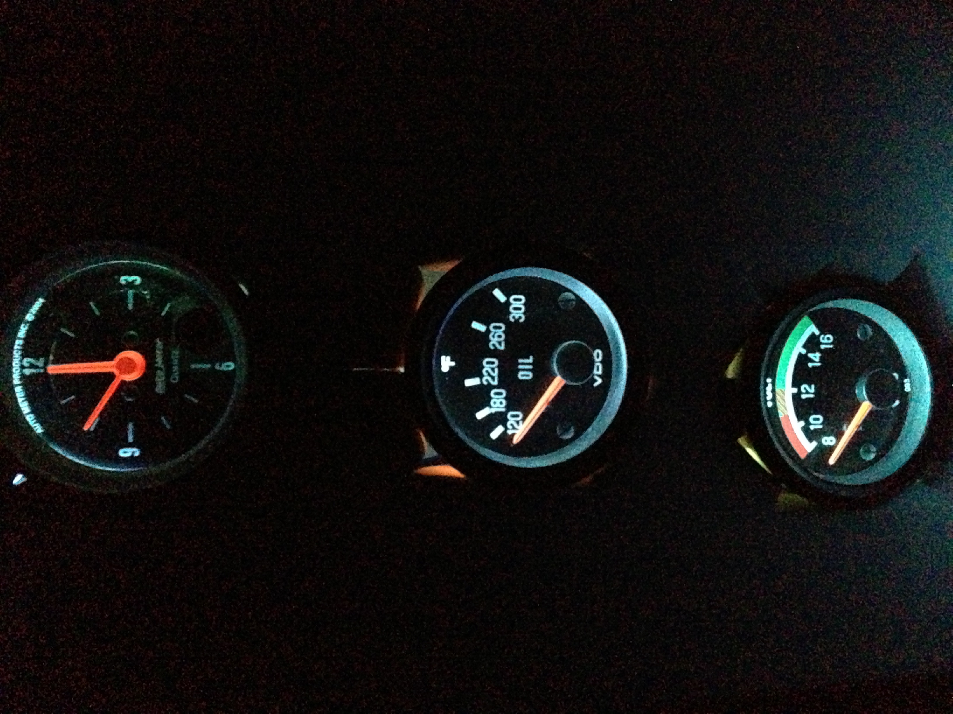 OK lights installed. Driving at night is amazing. Went to a neighborhood gathering where there were a number of younger guys with various sport cars from Fiat X-19s to BMW M3s. It was really cool to find all of them gathered around my car wanting to see the gauges.