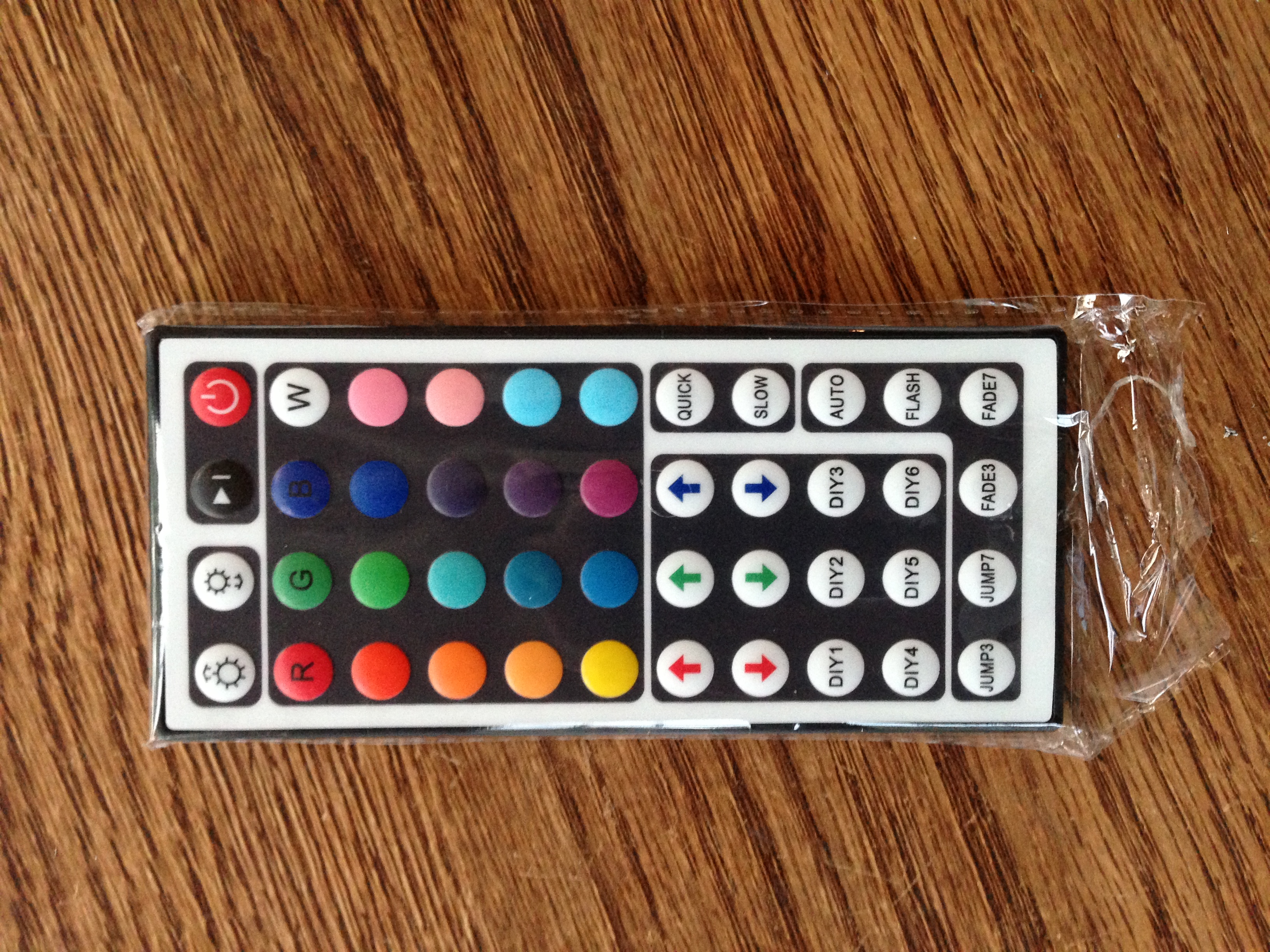 Here's the remote that comes with the controller. You can select the pre-chosen colors, or you can custom make your own color by adjusting the levels in each color.
