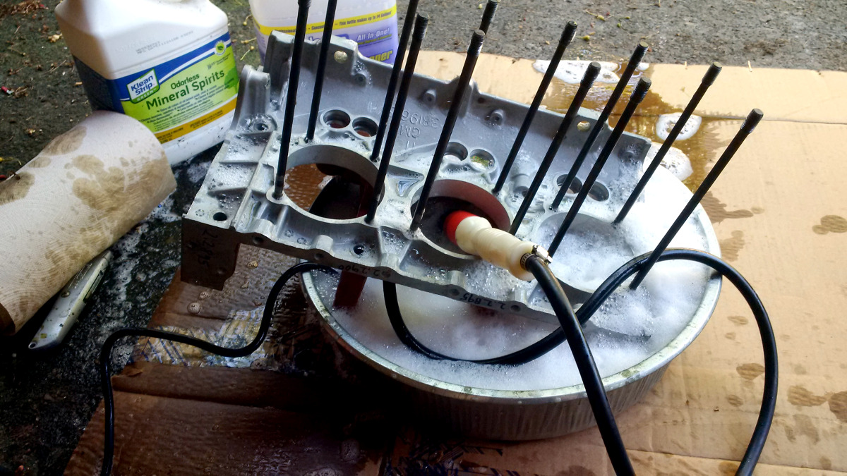 'Twas a pleasant summer's eve so I took the case halves outside for a refreshing douche. This is a makeshift parts cleaner assembled from an oil pan, aquarium pump, and an Oxford comma. Purple Simple Green is used to remove the last of the machining swarf and bits. I wish they would name it "Complicated Purple."