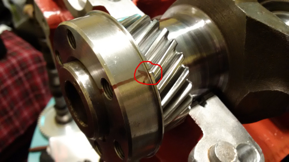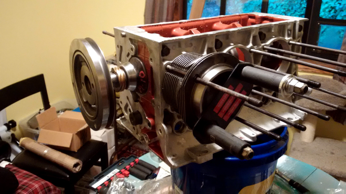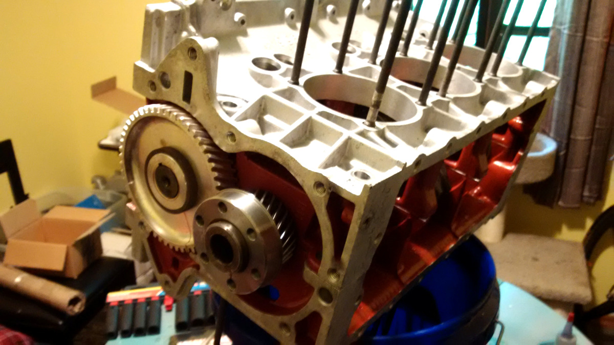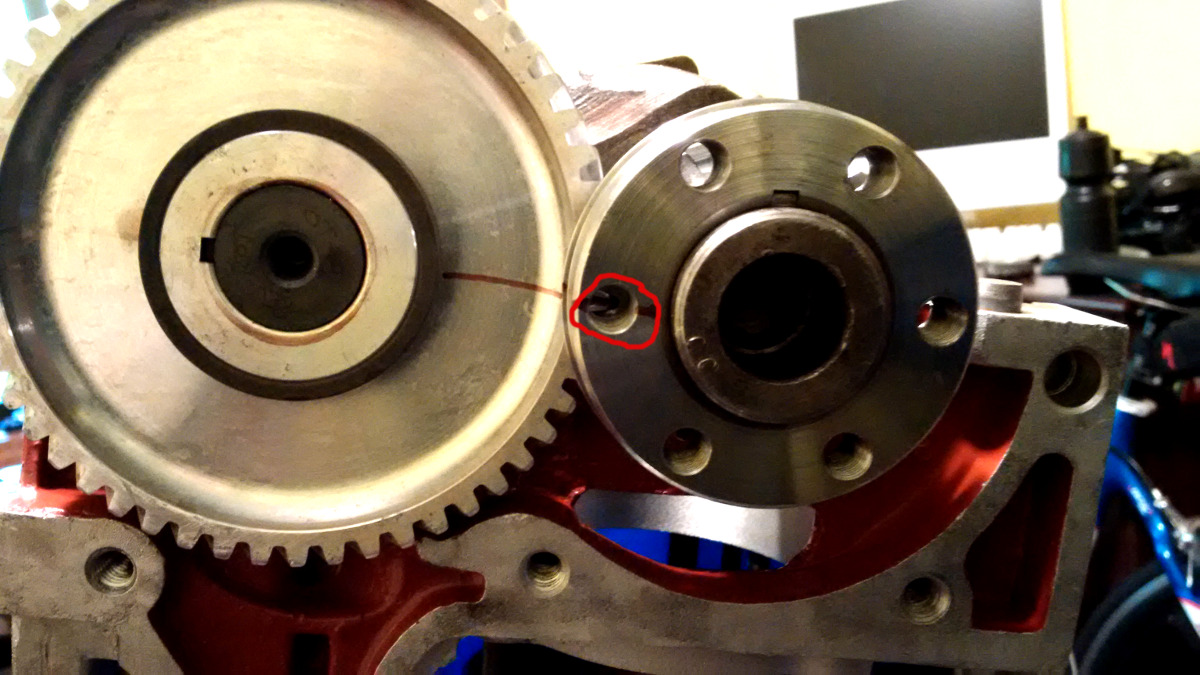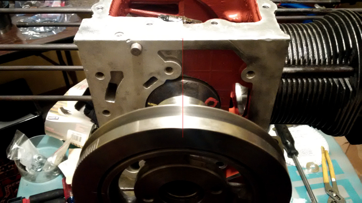 It's 102 degrees (39c) outside so I hosed myself down with the garden hose and pulled out my bucket-based parts washer. I very thoroughly and very carefully washed out both case halves, blasted them with clean water, and then with compressed air and set them out to dry. No problem on a horrible day like this. So let's start the assembly. Before cleaning it, I pulled and numbered each of the main bearings. After cleaning the cases I cleaned the bearings with mineral spirits, popped them into place, and smeared on some good synthetic assembly lube. I cleaned the crank with the nastiest residue-free cleaner I had (Berkebile 2+2) and made very sure it was as clean as I could get it and that no remnants of plastigauge were left behind. The crank popped into place and rotates as smooth as can be. Here is the timing mark on the crank. It's remarkably small and barely looks like it was deliberately placed. I drew some reference lines with a marker to verify it's position in relation to the mark on the camshaft. I couldn't photograph and install the cam at the same time, but it's the same procedure as an air cooled VW. Line up the marks and walk the cam into it's home. In this photo you can look into the bolt hole of the crank gear and see that my sharpie-based cam and crank marks line up correctly. Here they are together in the case. And then I clean, install, and lube the opposite main bearings and camshaft and mate the other case half. I bolted the case halves together with the OLD case bolts because I want to make sure it continues to freely spin as I torque down the nuts. I'll have to separate them once last time to smear on some Yamabond or or something. But first I want to degree the cam and then verify end play. The factory service manual says to measure crankshaft end play and make sure it's between .002-.006". You can see here that mine is at .004". That's a relief. The next step is to degree the cam. It's next to impossible for this particular cam to be that far out of whack, and if it is I'll need to use an offset Woodruff key, which means pulling it all apart again. I hope that doesn't happen. Mostly I just want to verify the cam/crank timing. In the meantime I think I need to buy an adapter so I can connect a degree wheel. More soon. |