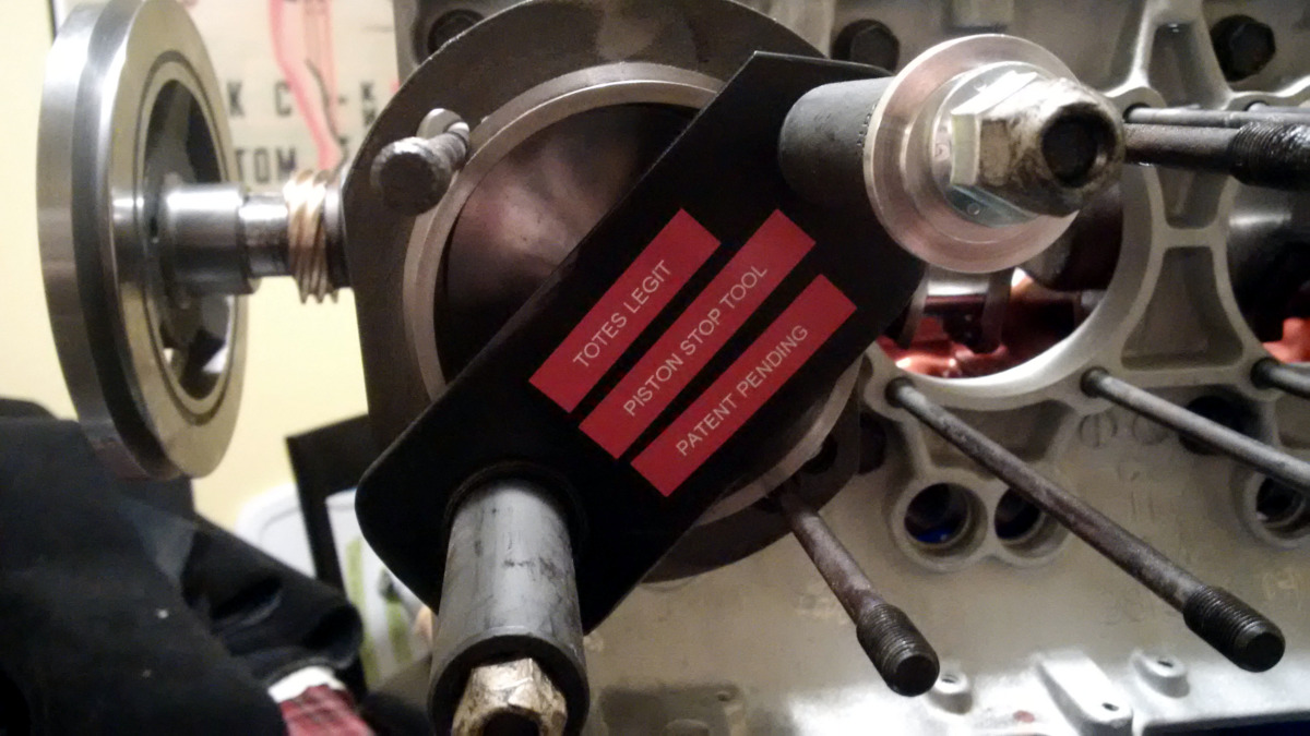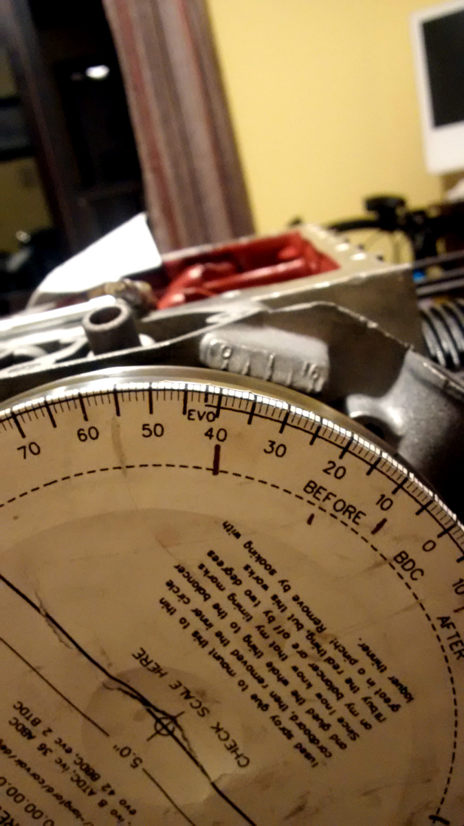 Sooooooo let's degree this thing and make sure I didn't install the camshaft off by a tooth or something stupid. I like sanity checks. Here's the situation as of a few hours ago. I installed rings onto one of the pistons (more on this later) and then the piston into cylinder #1. Then I made a high quality genuine Red Planet Industries piston stop.