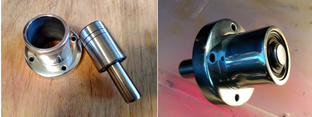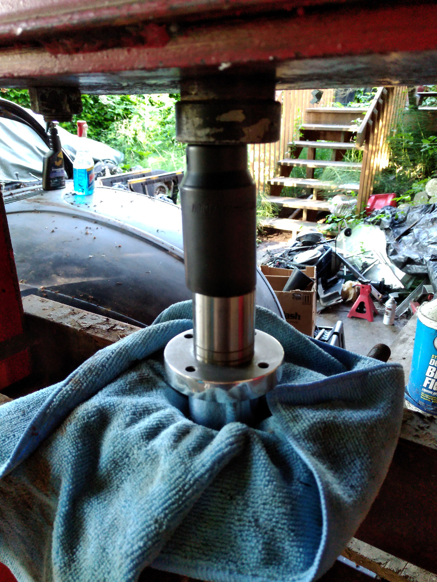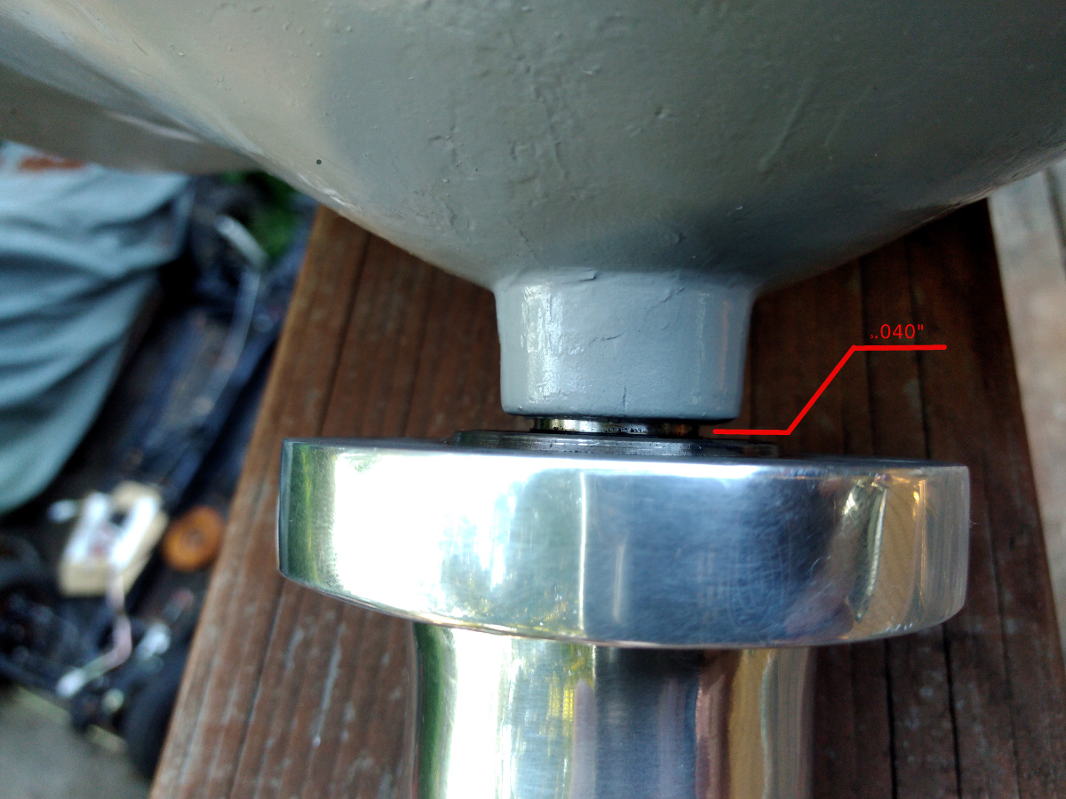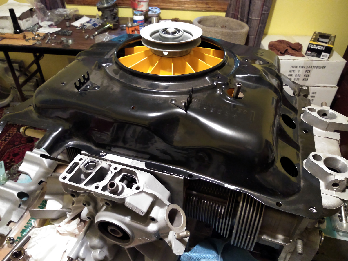 I bought a bearing and polished aluminum housing and then squished them into place. On the subject, does anyone want my old Snap-On hydraulic press? It disassembles, which is nice, because it stands seven feet tall. It needs plenty of love but if anyone wants to come and get it they can have it for nothing. Here's the pressed bearing and housing. Then the tricky bit. It may not seem like it but pressing the bearing shaft into the engine top cover needs to be a precise exercise. The distance from the deck to the top outer diameter of the bearing needs to be between 4.46"-4.49". The idea is that when assembled there is a critical gap distance between the fan blades and the engine cover. Too close and it will make contact and be sad, too far and the forced air won't make enough pressure to cool the engine. I spent quite a lot of time trying to get this just right. If you ever do this, I think the easier measurement is the gap between the bottom of the bearing housing and the top of the fan cover, which is .040". Yes, I know the powder coating looks crappy. I still need to find the fan-to-cover measurement, the one that really matters. I'll find it and report back. With gaskets in place it looks to be 1/4". Here's what it looks like mocked up with the bearing, fan, pulley, and cover. You might be thinking, "Marcus, the orange looks terrible. Your color sense is lacking and your sensibilities are crude." And you be right. I coated the fan to match the car, but now it looks loud and out of place. Oh well. Orange it is. I happen to like orange a lot but I get your point. On the subject of fans, here's the vertical fan setup I drool over. I think it would look much more at home in the 914. I want one more than I want my next breath. Feast your pupils: http://americanflat6.com/products/verticalfans.html |