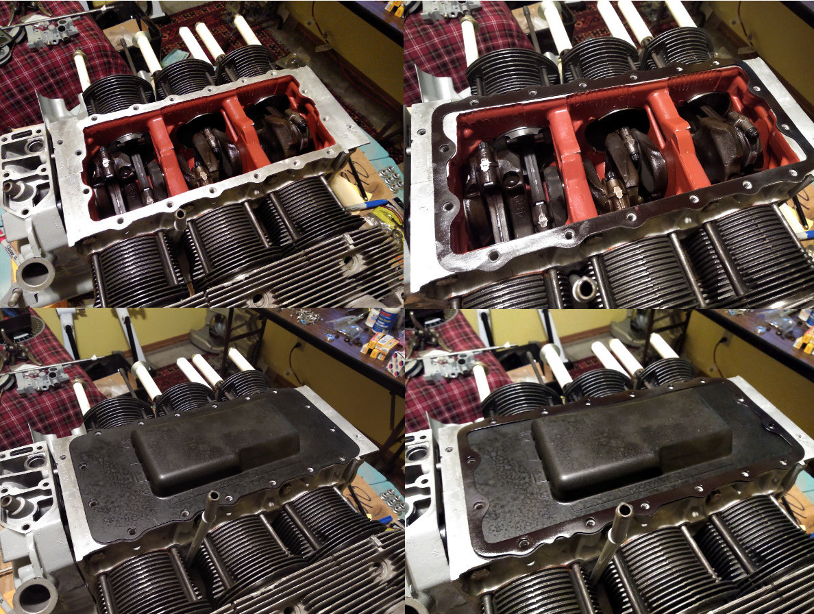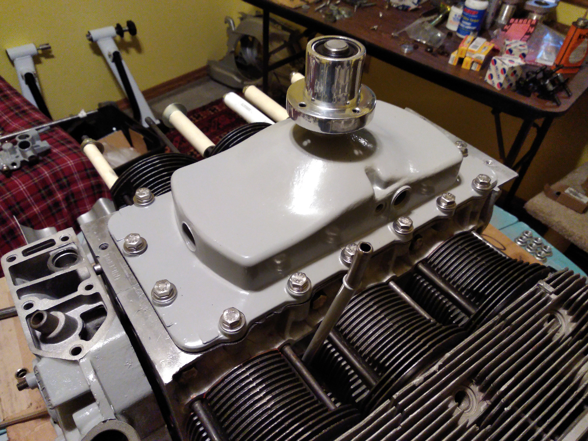 The process is easy for once. Clean the top of the engine case with acetone. Coat the first of two identical engine cover gaskets. <shameless product placement> I use Permatex High Tack in the spray bottle. It's my favorite gasket sealer because it's clean to use and has a long working time so I can relax and have fun. I wish Gasgacinch had a spray version also. But these two are very similar, even the same color and smell. </shameless product placement> Then add the baffle plate, the other coated gasket, and then the top cover. Like so: Finally just torque down all sixteen to 150 inch pounds after kissing each new bolt with a bit of JetLube. I went in three stages of 50 in/lbs until 150. I'm using stainless 5/16-18 x 1" bolts with lockwashers and washers. I don't want to besmirch the aluminum case. Here's the Dagwood all assembled. It feels a bit sad to not see the pistons any more. Not that I want to have a major problem and have to get back into it that far. Perish the thought. |