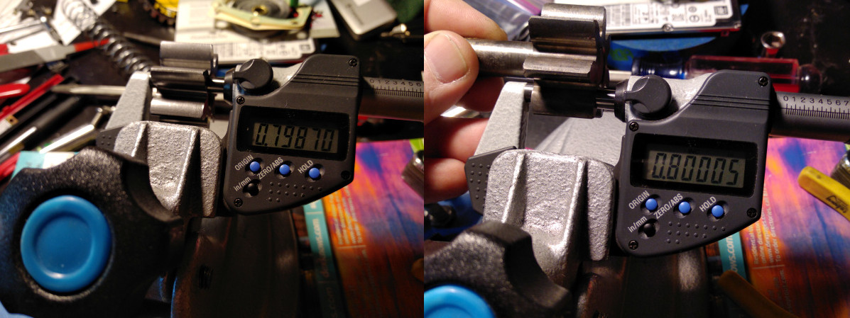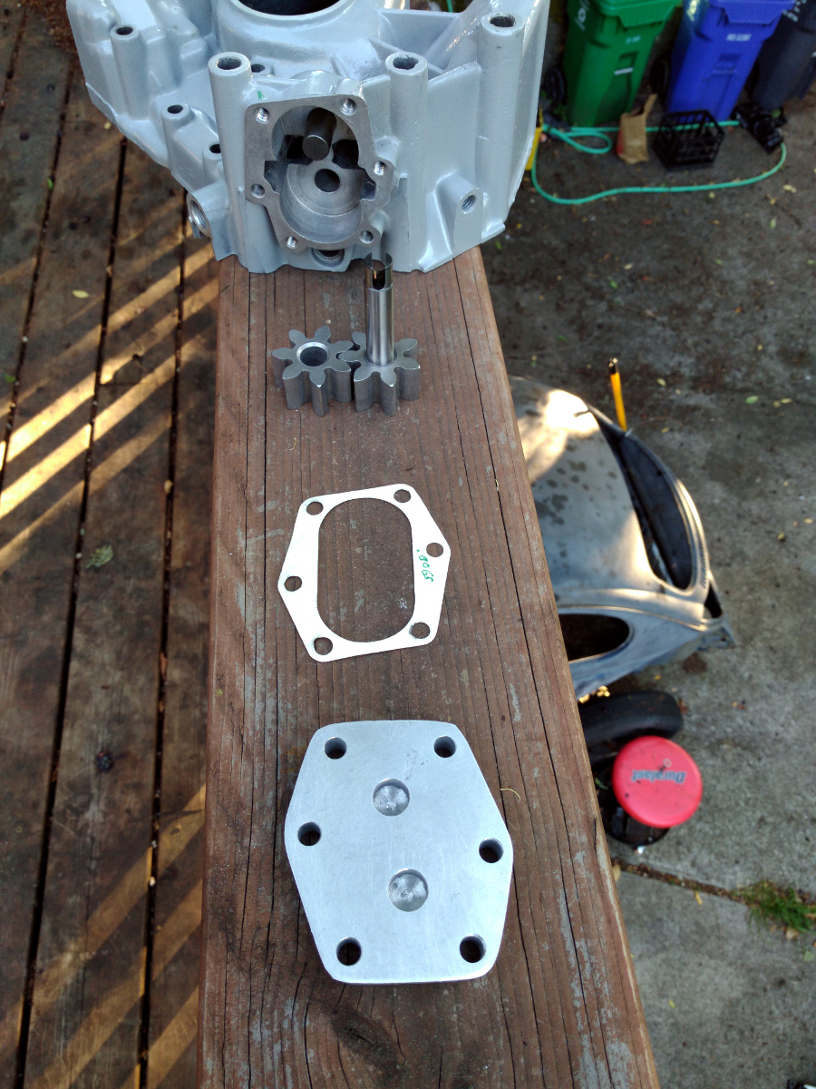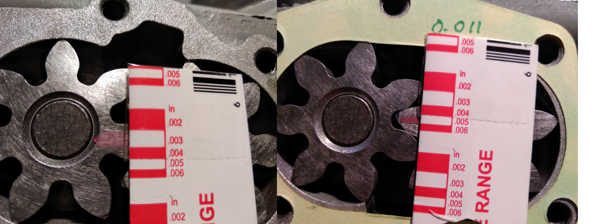 My attention has mostly been the Cover of Many Uses. It took quite a while to sand down the mating surfaces and lap them completely flat. I'm using my ever-handy flat glass plate and sandpaper. While in there, the 90 degree oil cooler connector is getting the same treatment. Just to review, the Cover of Many Uses is a two-part assembly which houses the distributor, oil pressure sender, oil filler, mechanical fuel pump, and two oil bypass valves, one oil pressure regulator, and the oil pump spur gears. But it's getting a bit of a reprieve because I'm using an electric fuel pump instead of the mechanical one. Better all around. The oil pump threw me for a bit of a loop. Here's the order of installation: The clearance between the spur gears to the bottom plate is suppose to be .002-.003". Fair enough. The new oil pump comes with different size gaskets but none of them measured to nominal thickness. So a .010" gasket is really .0075". Great. I don't like Plasti-Gauge but this seems like an okay place for it. But no variant of gasket would get the correct clearance. Except for one, but when I twisted the drive gear with a screw driver to simulate the distributor gear, it rubbed against the bottom plate. Further irritation came from the fact that use of feeler thickness gauges didn't match the Plasti-Gauge readings. Finally I realized that my NAPA-branded feelers were the wrong size! According to my micrometer, the .002 feeler is .007, and the .003 is .009. Lovely. I have a nice Mitutoyo set on order. The last bit of despair came when I measured the original oil pump gears with the new ones. As you can see, the new ones are .798-ish, but the old one is dead nuts on .800". The service manual says GM will happily provide oil gears in increasing thicknesses of .001" to get the correct fit, but those are long gone. I called the parts vendor and the guy measured some on the shelf and said, "yeah, they're all like that." Right. So I have another oil pump coming from Melling, and maybe it will be the right size. Normally I wouldn't squawk but oil pump clearances are critical. |