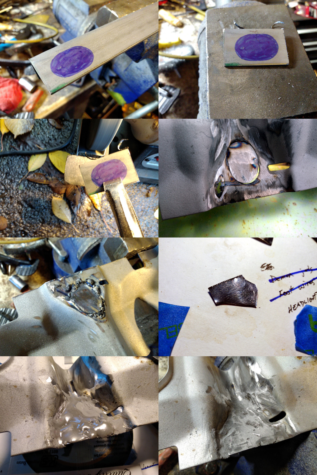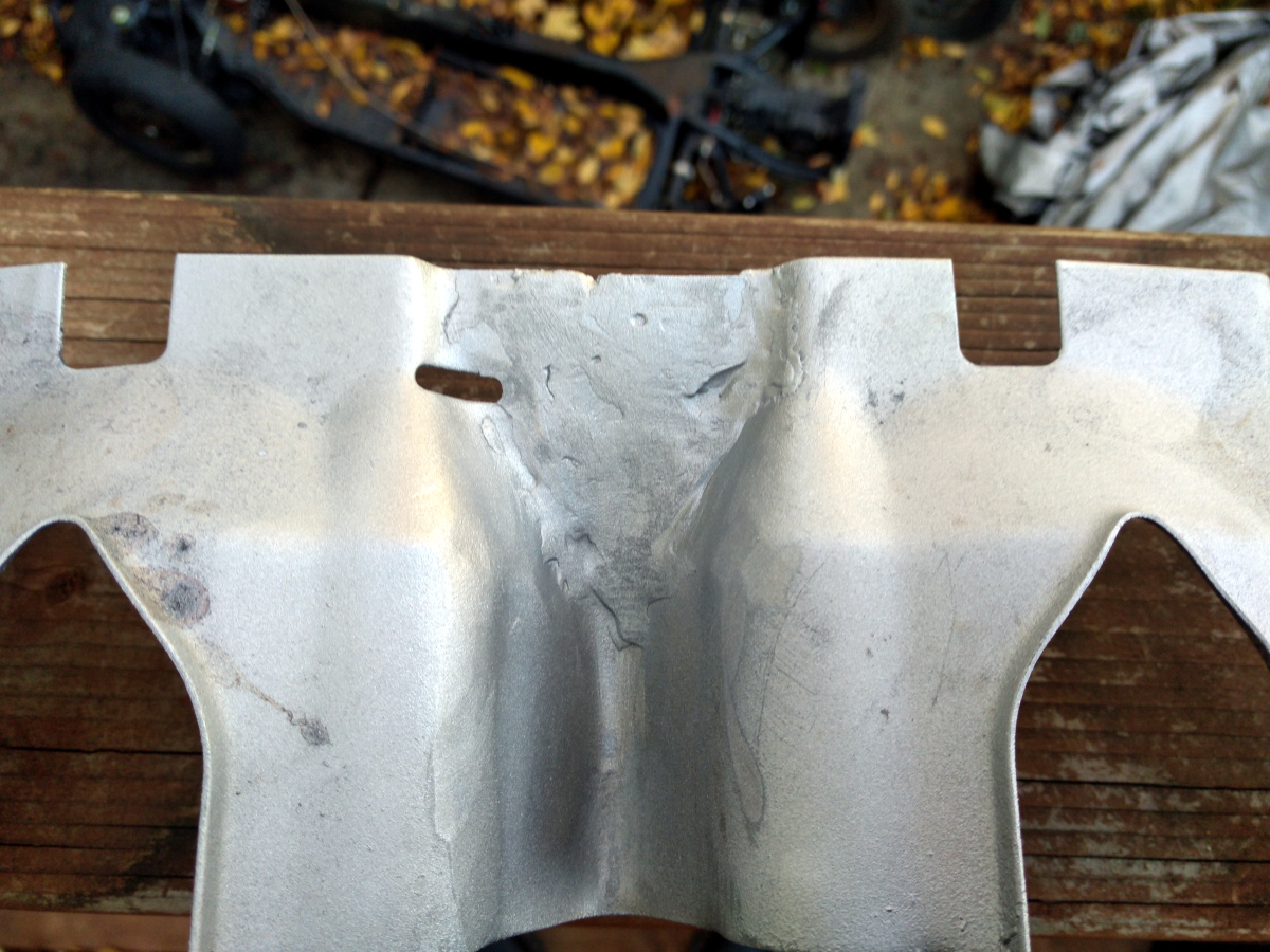 The dipstick doesn't need a hole in the shield. That hole is only for '60-'62 cars that used a crankcase pressure relief tube to dump crankcase gasses underneath the car and out into the atmosphere. Nice. Starting in '63 GM started using a PCV valve instead. Long ago one could buy a plug for the hole but I'm not sure from which material it was made. I am sure that the plug is right next to the exhaust so if it were made of rubber it wouldn't last. At first I was inclined to make a high-temp JB-Weld sandwich with a little bit of steel sheet. But then I decided to do a little experiment. Or rather, three at once. I wanted to see if I could weld a patch on the very thin shield sheet metal (I can't) and if such a patch could be powder coated on an otherwise already coated part. Long ago I coated the heat shields in high temp silver exhaust powder. I've never re-coated a piece, so why not? I also want to try out using Alvin's Hi-Temp Lab Metal. It's a high metal content putty that's supposed to withstand high temperature and is able to be powder coated. Here's a little montage of the process. I cut a little oval patch and tried and failed to weld it in, but just burned right though the shield. I should have known but did it anyway. Then I had to cut another little patch and then puttied it all into place with the Lab Metal. After sitting for 24 hours the instructions say to bake it at 425F, which is exactly the powder coating temperature. I powder coated it with the same powder and baked it. It looks terrible and I blame myself for the shoddy work. But the experiment was a a reasonable success. While being the opposite of pretty, the patch is strong and good to at least 450F (Alvin says a 1000F). The powder doesn't look great but it did the job. My plan, in its entirety, is to install and let someone else check the results at the next disassembly. Here's the final product. It's PERFECT. /snark  |