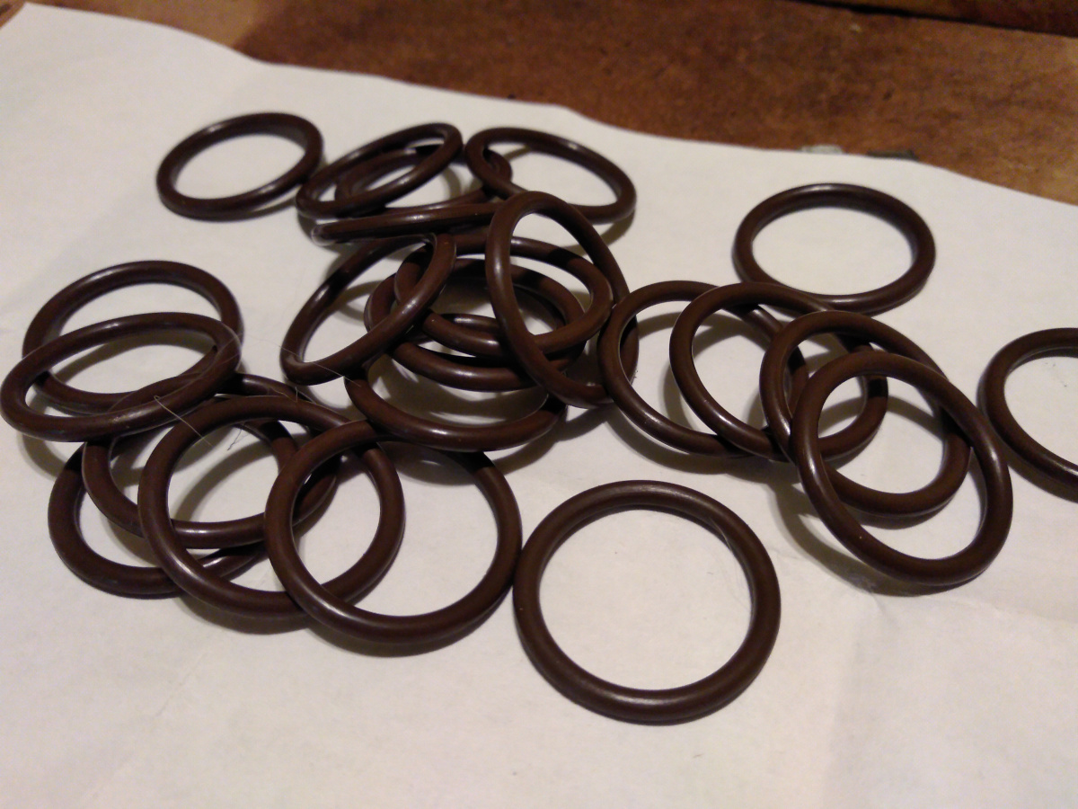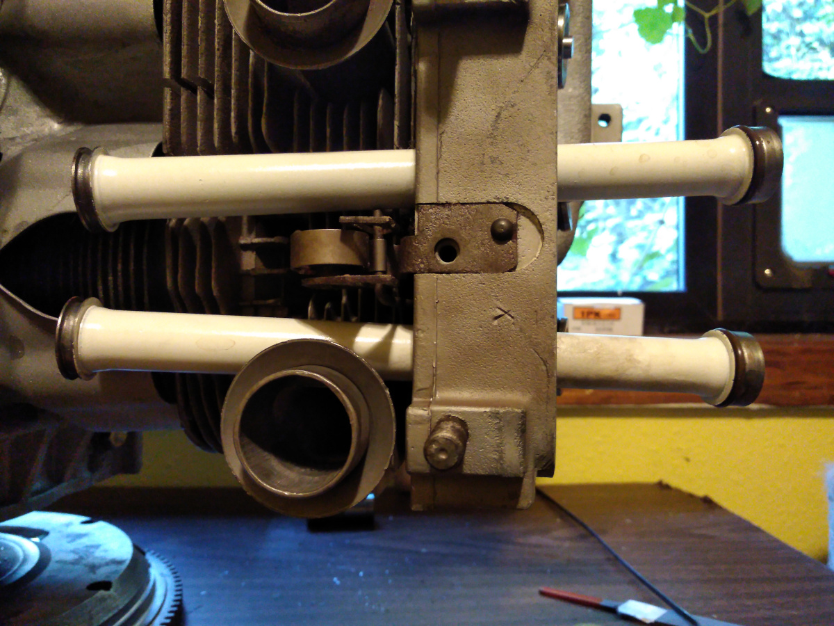 A while back I made a little jig to prep the tubes. I coated the exterior in the same high temp silver powder as the heat shields and then painted them with a few coats of high temp ceramic paint in white. The ends are polished with my rotary tool to prevent damage to the seals.   The tubes get a Viton seal on each end of the tube, but the engine case side of the tube goes in through the head naked. Once through the head the seal is popped on and coated in engine oil. Then the tube can be shoved all the way in to the bore. I used a nylon hammer and a 16mm socket to drive them in all the way, as per the service manual instructions. Note the orientation of the tube. The manual calls the case side the "long side of the tube." Odd way to describe one end of a tube, but okay. You can see in this photo that the ends are different. The larger end goes into the head. Here are all twelve installed:  |