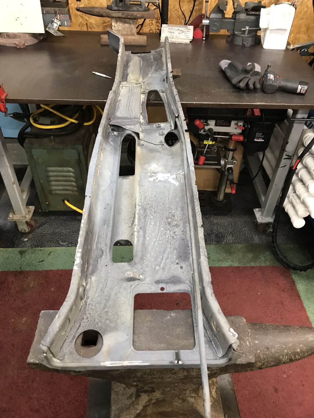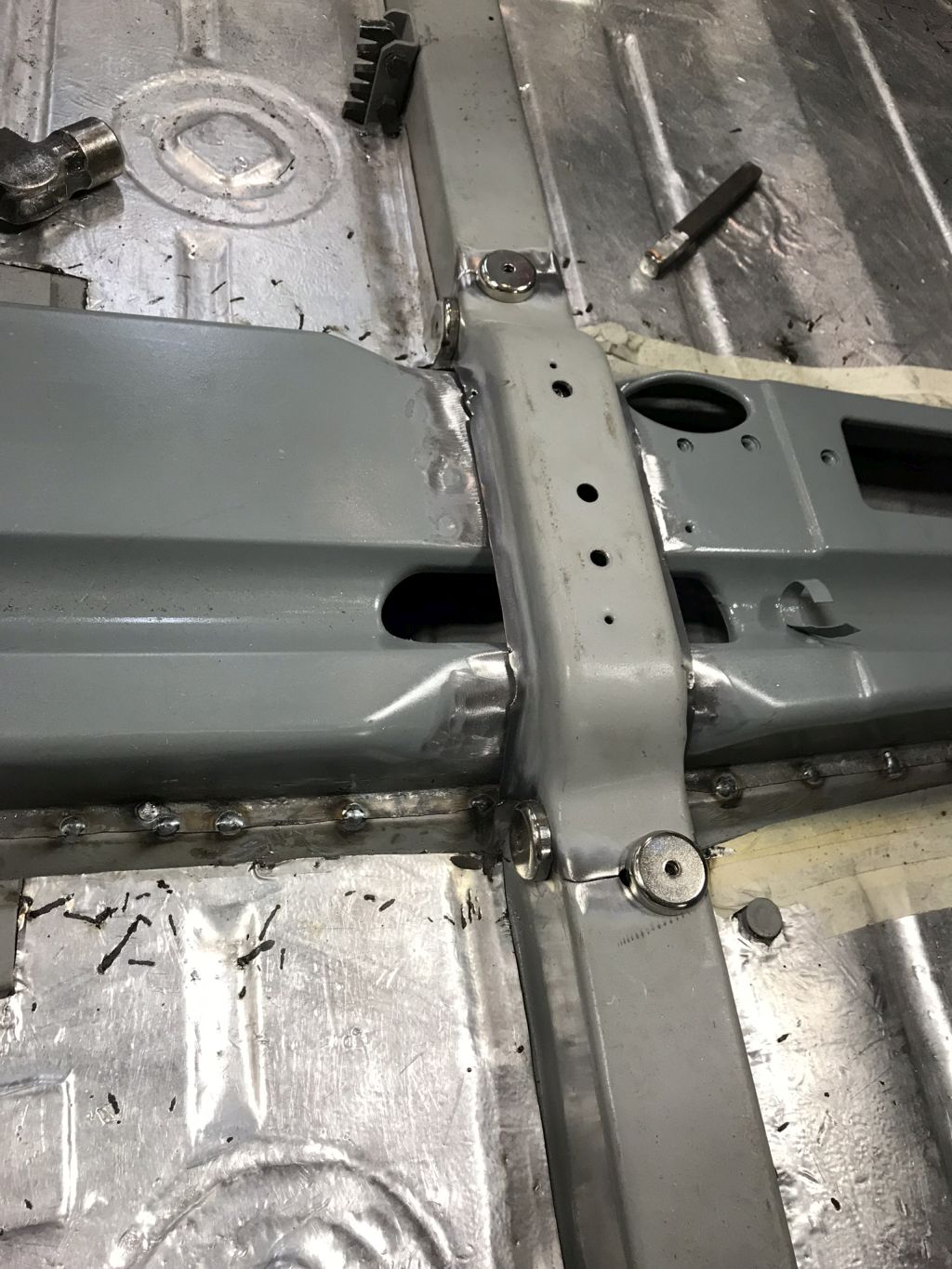 This is the repaired area that needed adjustment. Didn't get a post repair picture. I couldn't help myself, had to wire brush and paint the floor under the center tunnel. Just used weld through primer. ![]() Holes for the IC heat exchanger. I am pretty sure I would not have been able to drill these holes with the center tunnel in place. ![]() Center tunnel is painted with weld through primer on the underside and another poor attempt at matching the grey body color on the outside. Was warm enough to bake it in the sun today! The calm before the storm. ![]() After much mig welding. It is amazing how much smoke a little bit of burning bed liner gives off. ![]() Center rib drops perfectly back in place. Gap's were so good that I decided to use the TIG. ![]() Partially TIG'd. Decided to call it Beer'thirty after sticking the tungsten for the third time. What an awkward welding position. ![]() Looks so much better. Much welding and a bit of painting and this task will be complete. |
