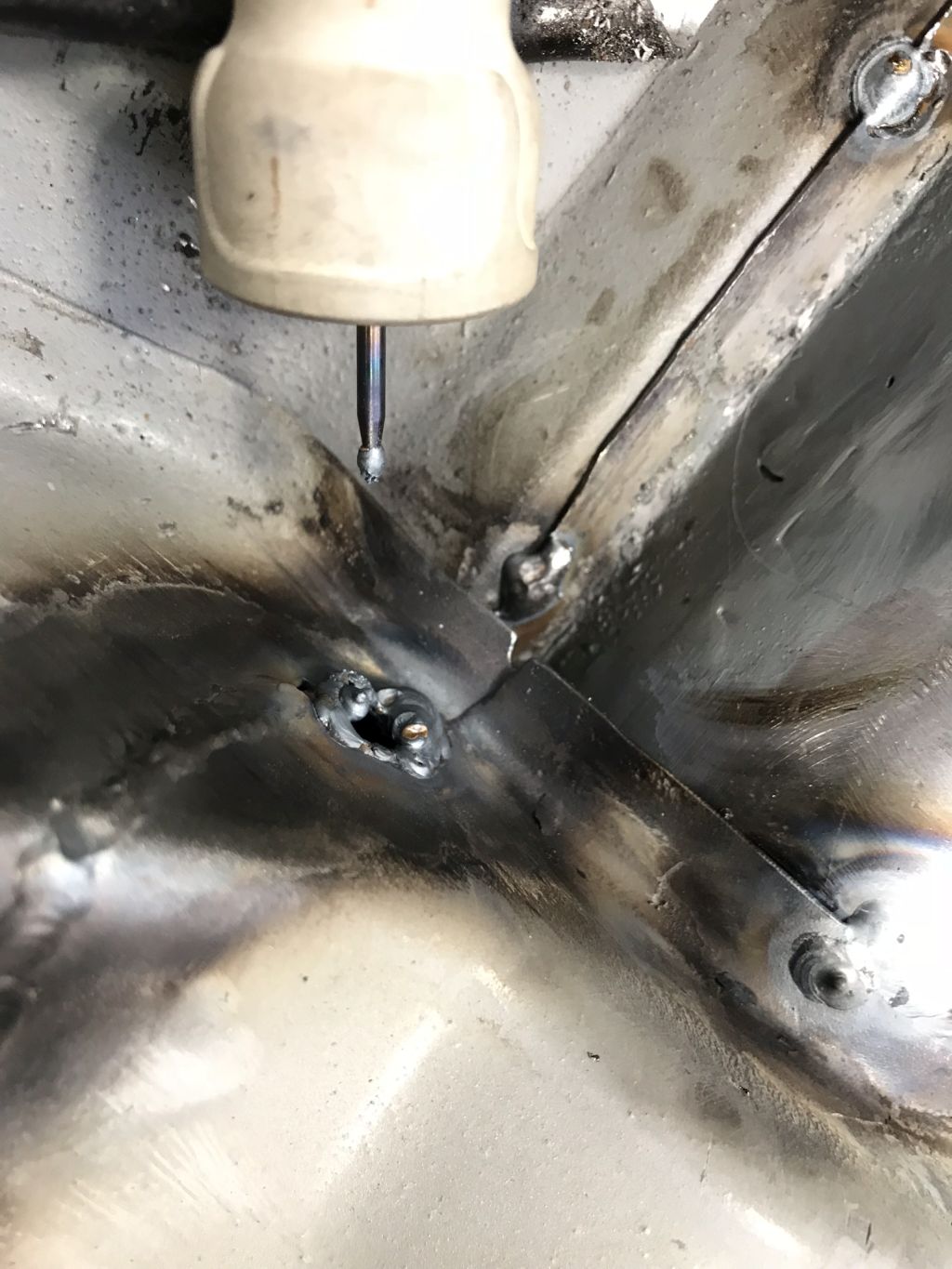 Bad things happen when you try to push through dirty tungsten. It is amazing how a little contamination pop can ruin the arc. Proper thing to do is to stop and resharpen. this is what happens when you don't. Arc gets wide, takes more amps to melt the filler, more contamination on the tungsten, then blop... Took a bid of grinding but pretty happy with the recovery. ![]() Welding finished. This thing is stiff. ![]() Tomorrow the squirt gun welds get ground. |