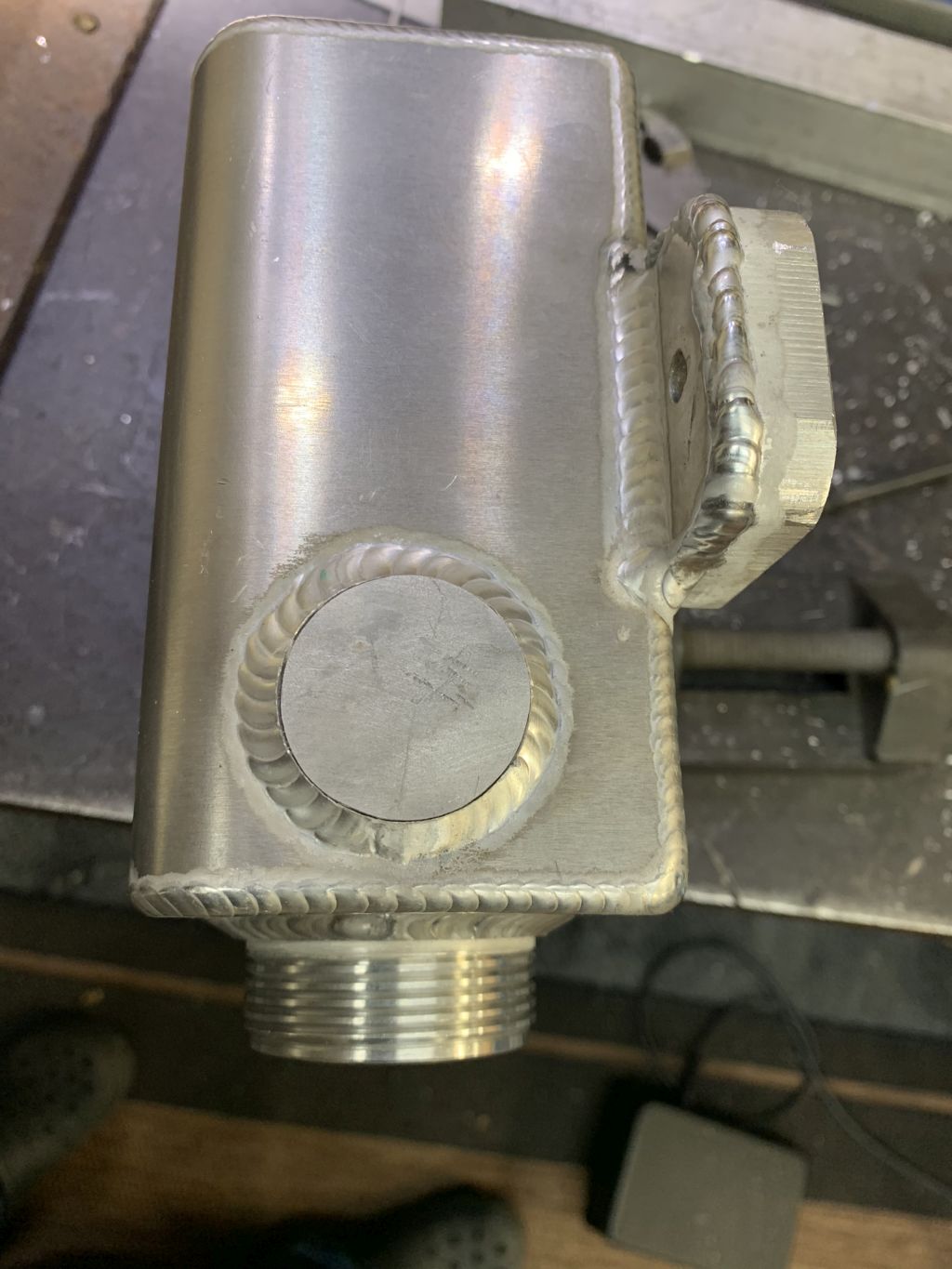 I did take a couple of weeks of garage time to make the wife happy and insulate the shop and put up wall covering. I posted a picture on the Porsti build thread. As for progress on Grey, knocking stuff off the list toward road worthyness. A few photogenic updates: Finally got the auxilary fuse/relay box to fit properly. Required quite a bit of reshaping, probably would have been quicker to cut the area out and weld in a flat section pre-cutout for the box. Still needs to be painted. ![]() ![]() Also got the IC pump mounted and the overflow and IC reservoir modified/mounted. The pump sort of interfered with the bottom battery tray mount that was unnecessary and quite ugly...so I removed it. This opened a huge can of worms due to the less than stellar hell hole repair. For a couple of hours I was seriously contemplating redoing the entire hell hole repair. More than a little cutting/welding/grinding later and the area is presentable. I decided to attach the expansion tank to the IC reservoir which made it impossible to use the inlet I cut it out and plugged the opening (pic pre welding). I also added spacers to the back of the reservoir because during one of Tom's visits he pointed out that it is a bit tight to get to the cap. Still not super convenient but better. Made some plates to attach the two reservoirs. The expansion tank was chromed so I sandblasted it to remove the bulk of it. Turned up the cleaning a bit on the TIG and it welded pretty well. ![]() I still need to add the inlet bung and will probably put a braket at the bottom of the expansion tank. ![]() Happy New Year (IMG:style_emoticons/default/beer.gif) Scott |