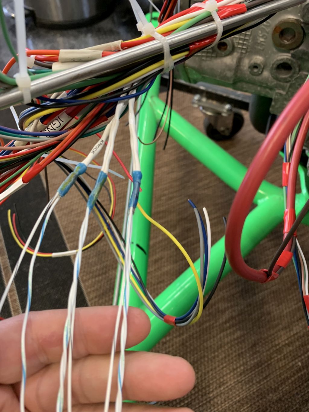 Much cutting, stripping, labeling, crimping later and the engine is fully terminated.