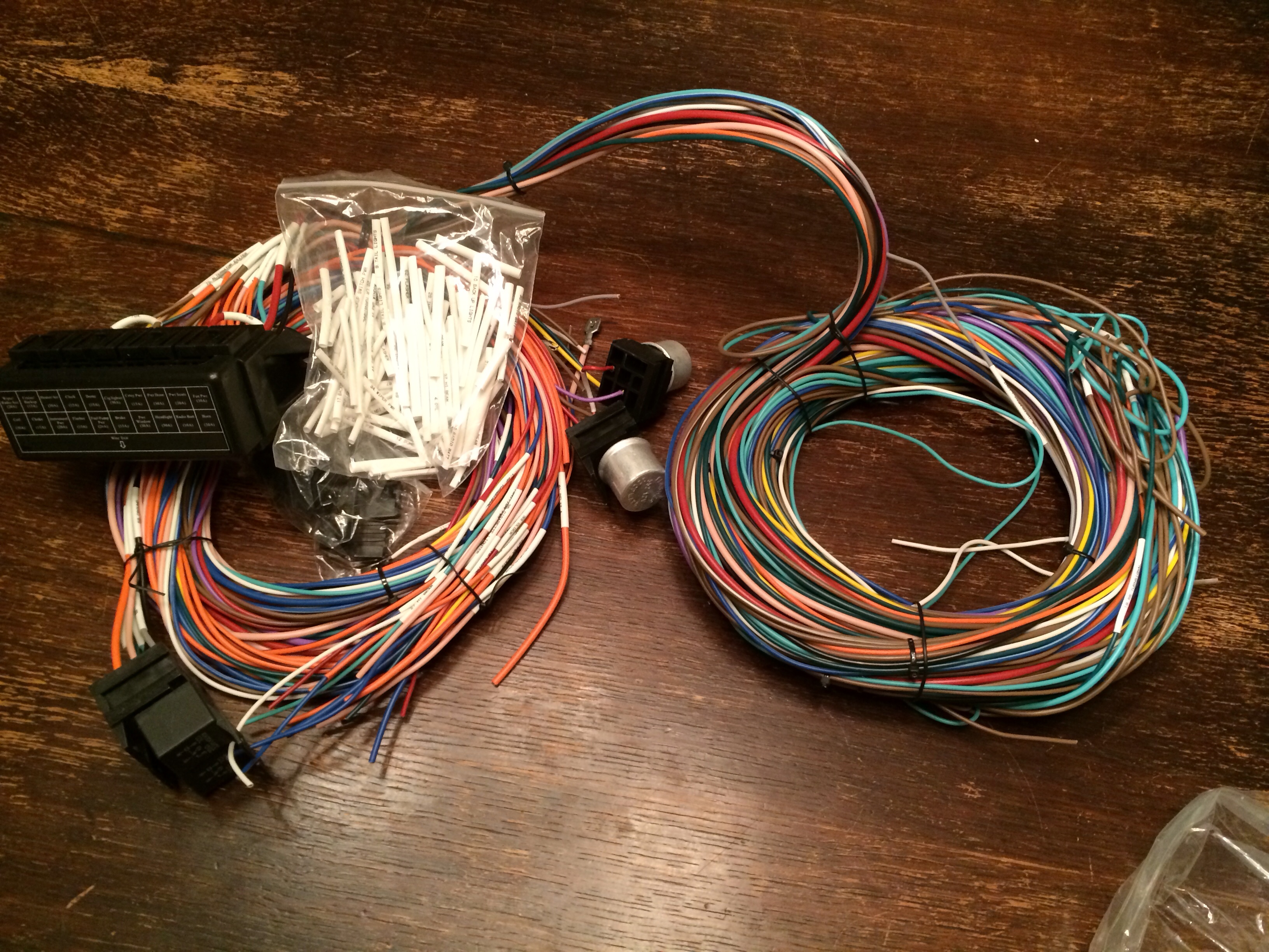 I found it on eBay. Actually, it was less than I said. $160 shipped. http://r.ebay.com/bi3URr The quality is seriously outstanding, and there are a lot of things that I didn't expect to have leads for. It also came with the relays for Hazards, blinkers, horn, and starter. I was all set to order all the wire separately, but this was so much cheaper. I figured at the least, I'd have 30' of 20 different wire colors, which I couldn't buy for less than $200. This came with a modern fuse panel and everything else needed. The bag in the picture has pieces of 3" shrink wrap with all the circuits and the fuse number pre-printed so you can re-mark the wires after you cut them to length. What a time saver! If I have so much as a blown fuse I'm going this route. |