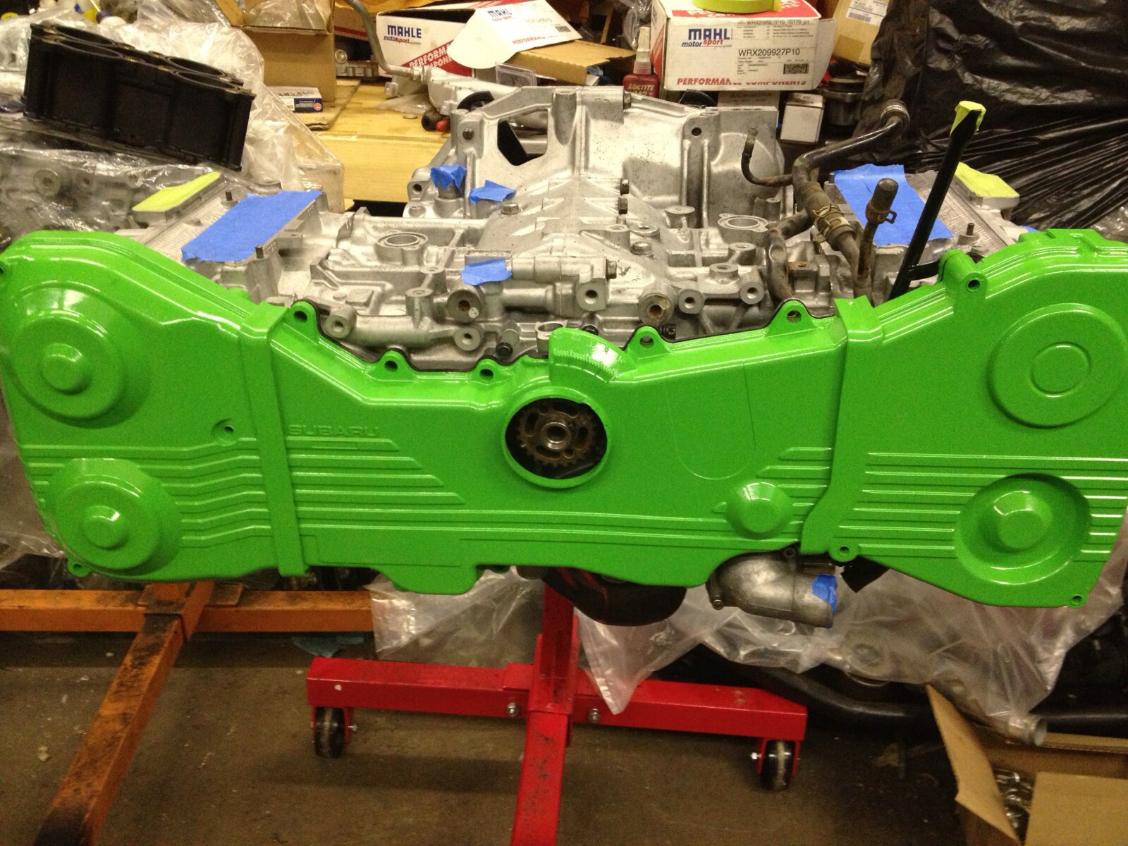 Replaced every bearing on the timing belt. Replaced the water pump, upgraded to a bigger oil pump, new belt and guides, and I even got the shield painted "Grabber Green" before reassembly. Attached thumbnail(s) Attached image(s)