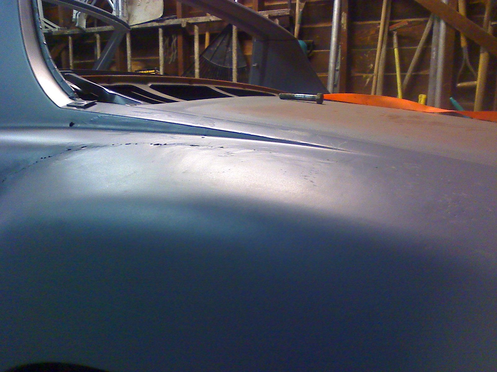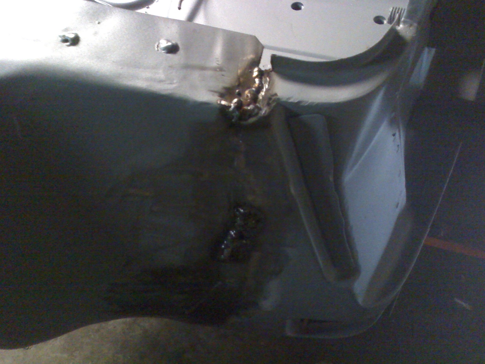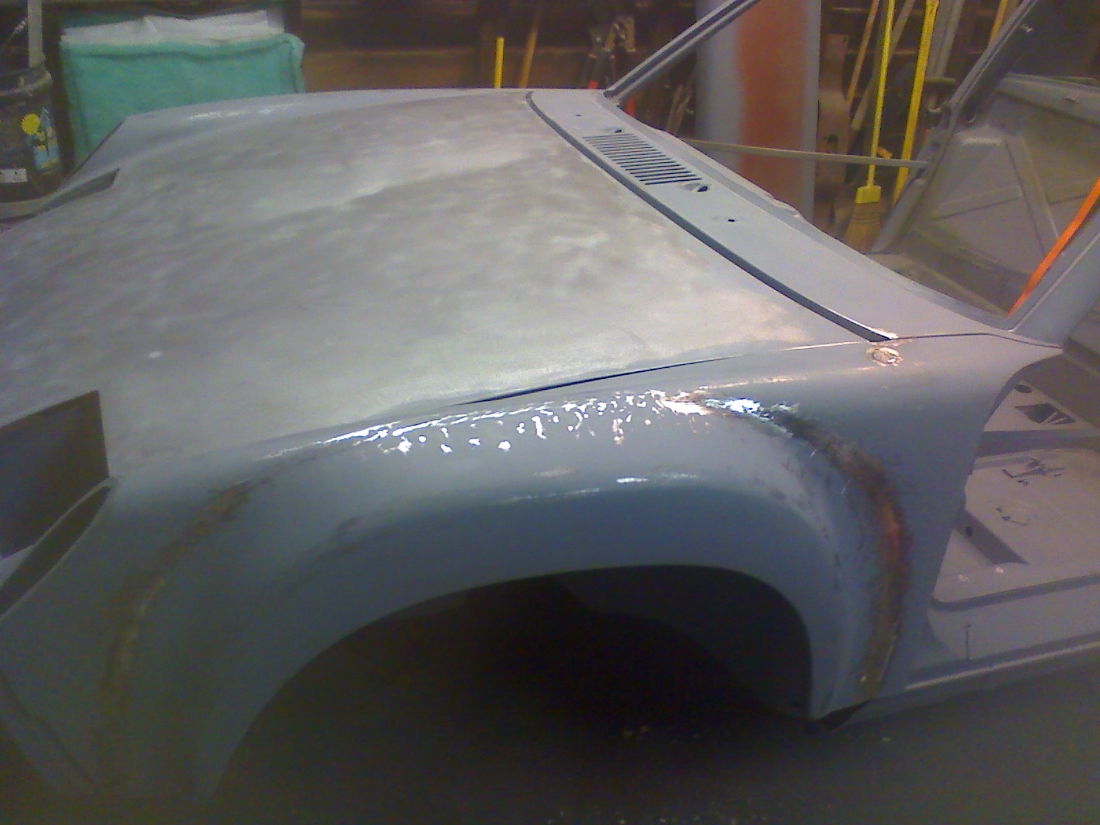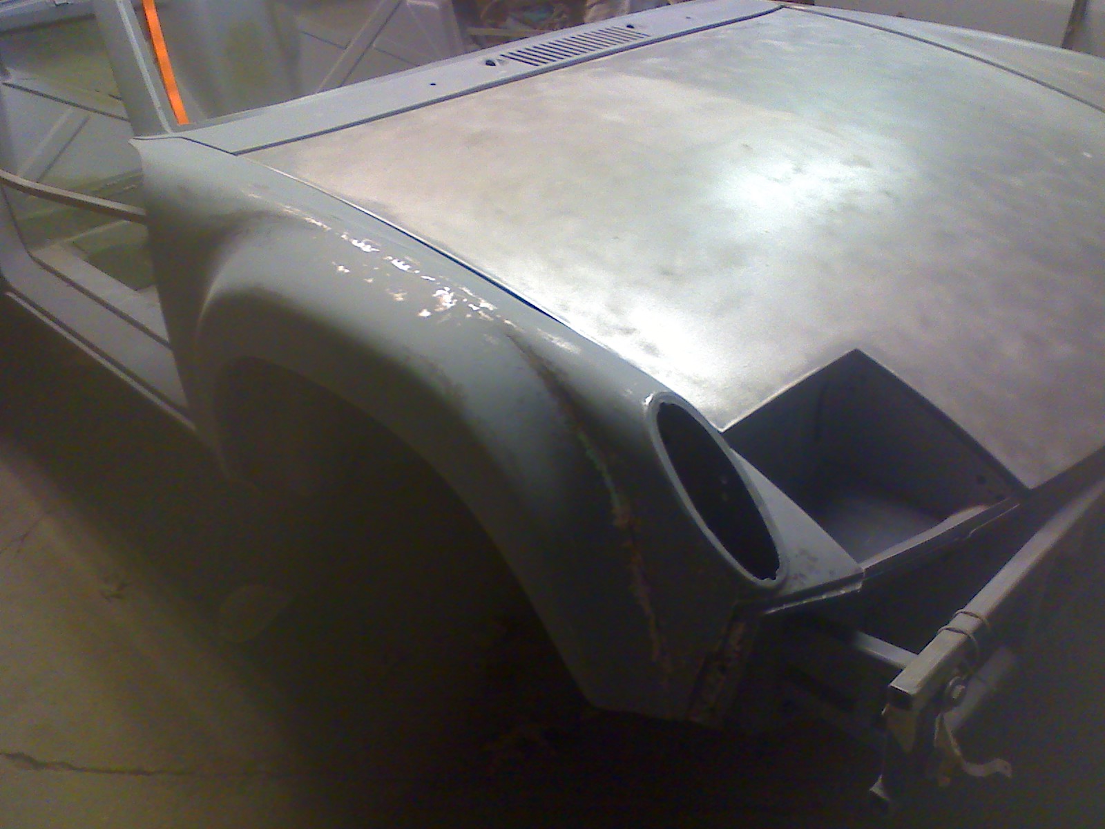 Dan has been doing a great job on the flares. He got all the "waves" out of one of them about an hour after I dropped it off. He also fixed the welds that the other guy ground too much off of. He sent me a question last night about how to match the flares with the existing sheet metal down by the rockers. I know I've seen a few threads on it, so I'll keep digging. I dropped the fiberglass rockers off at his garage this AM on my way to the airport. I'll let him have fun with that! Here's one of the pics he sent me last night. Already I can see a big improvement. I'm not sure what the other guy was doing with the pick-end of the metal hammer. Trying to shrink it up? Who knows. This guy is much better. Attached thumbnail(s) |