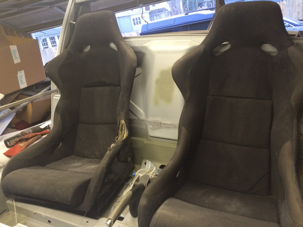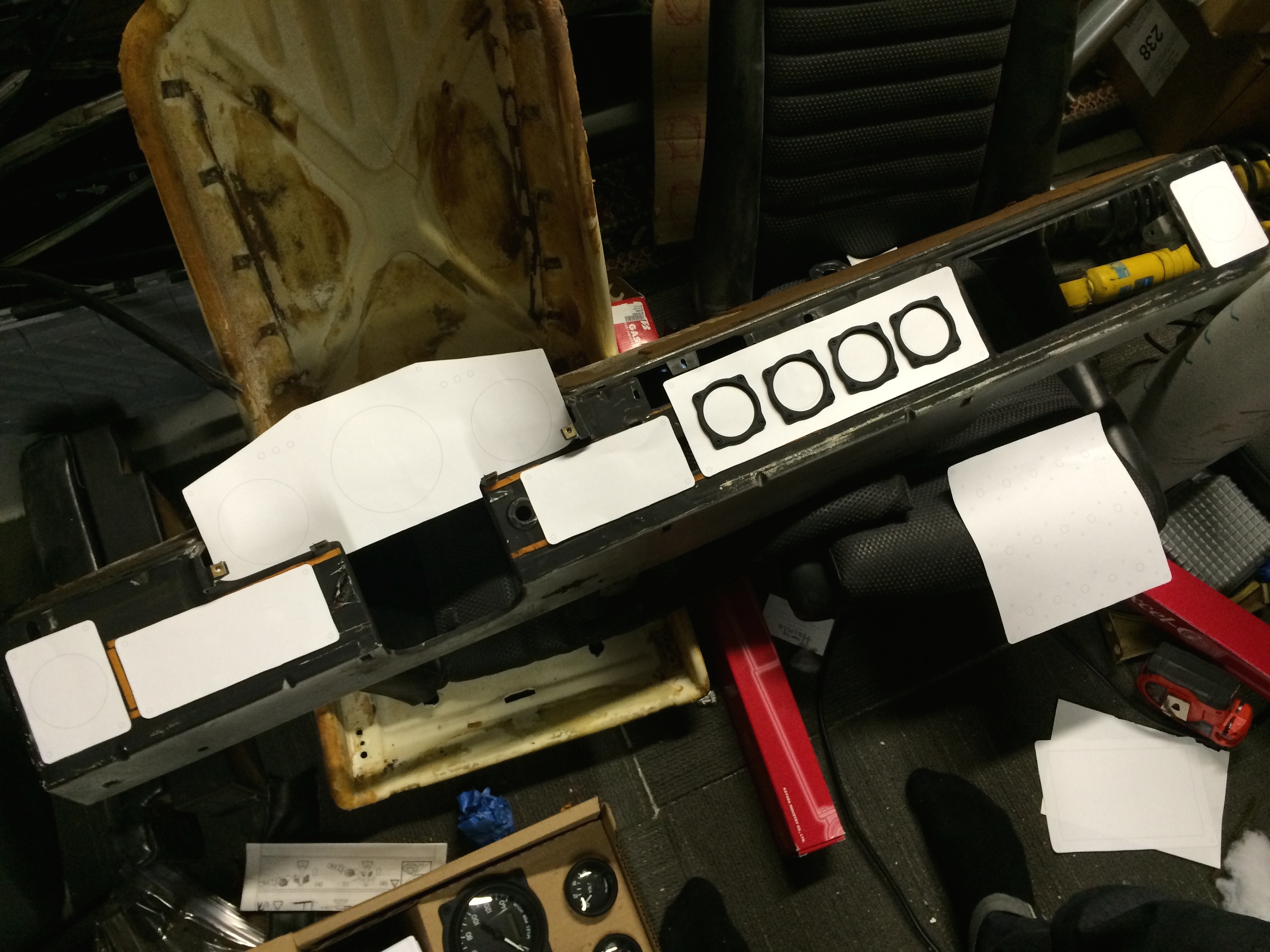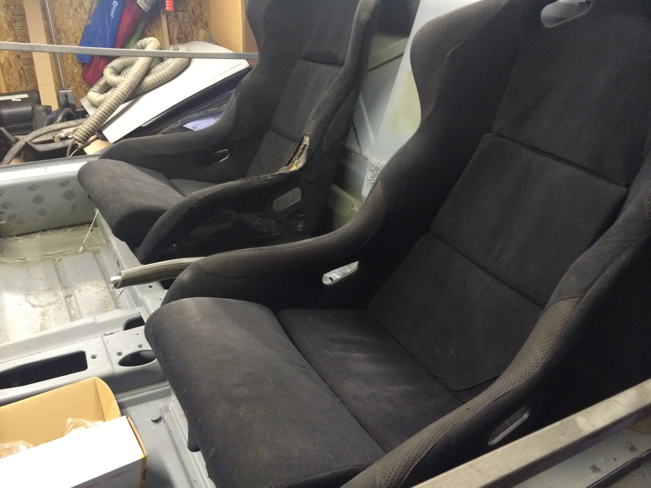 GT kits where made for the -6 cars, so the two pieces you have most like run up the inner logs towards the inner suspension console. They are covered by that much needed -4 engine mount on each side. You could cut them out, weld in the plates, and then put them back in as you need them for the Coldwater cradle. That's exactly what I figured out. I'm wondering if that particular part is really needed though. Also, I don't want to take something off, and then realize after it's too late, that I put them back incorrectly. In the end, I may just add the pieces I know I need, and then seam weld the parts that are normally just tacked up. That should give me the added strength that I need, without adding additional weight. In other news... I mocked up the dashboard yesterday so I know what the pieces of aluminum I need to have water-jetted for the dash. I had to make a few things smaller...others a bit bigger, and some of the holes that I made are just downright WAY too small. Also found a place local to me that had a bunch of Porsche rims and assorted other goodies. These Corbeau seats look to be a much better fit than the Carbon Fiber seats I bought last week. I can trade him mine for these, and have something closer to what I'm looking for without having to move the e-brake handle. Still hunting for a body guy that can take this from me on Saturday and work on it next week while I'm out of town. My hope is to have it back in a week and be ready for final blocking and paint. |