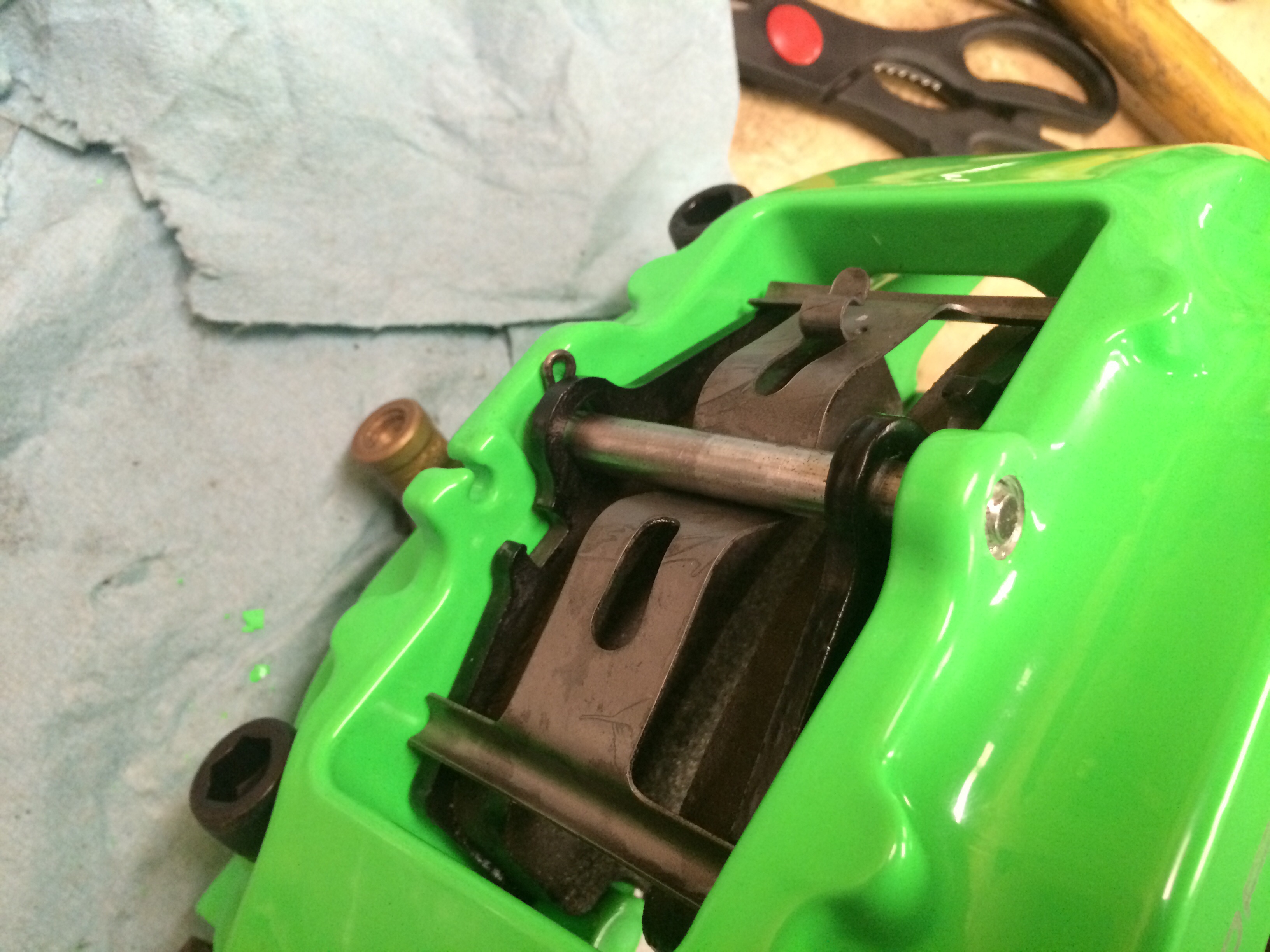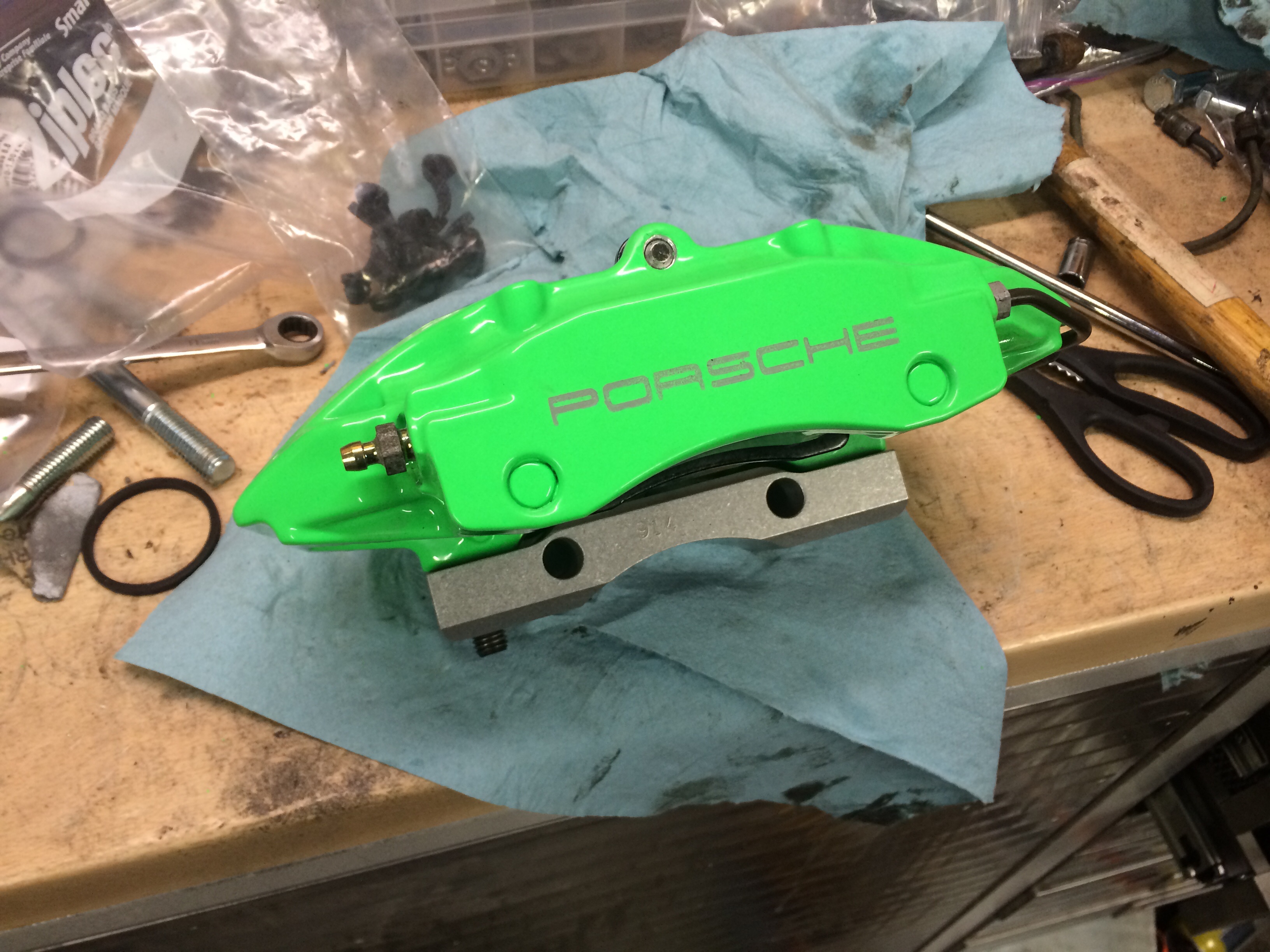 Do you have the spline installed and castellated nut on? Or is this a different issue? This car is going to be too nice to drive. I plan on driving the SHIT out of this car. I'm using 911 hubs all around and the rears just feel like they aren't tight enough. I don't have the leverage to crank on them right now (no motor) so I'll investigate further when I get that going. Tonight I spent the evening rebuilding all 4 brakes. I took everything down to a powder-coated frame and replaced every seal and dust cover. Then put the lines on them and bolted up the conversion parts and pads. The fronts are installed...rears are waiting for the brake rotors. Attached thumbnail(s) |