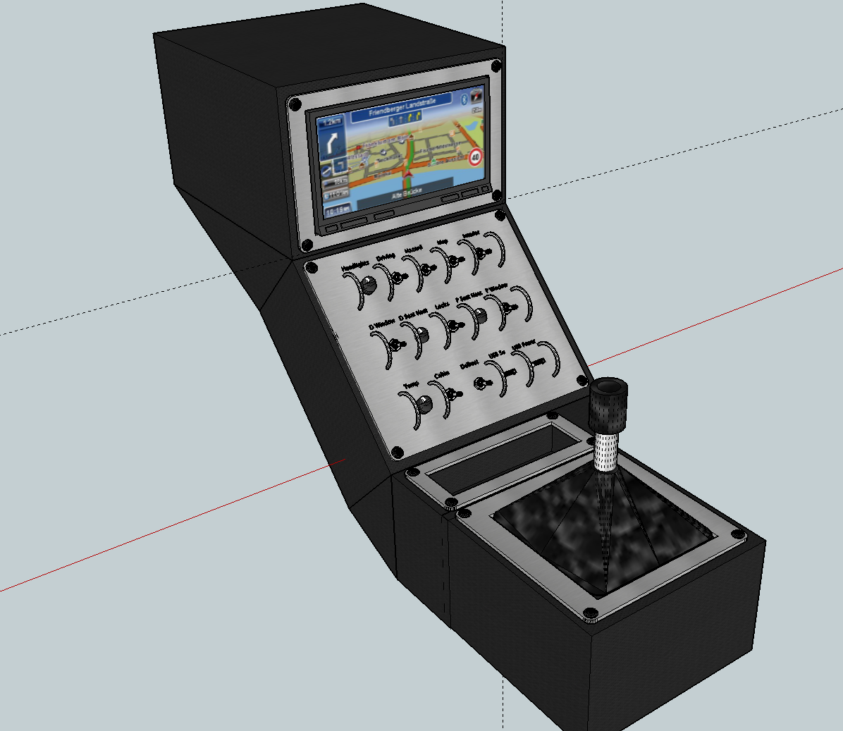 Here's a refresher of what I mocked up for the center console. The only difference is that I'll have an 8" sub in the back of it. I need to get in there to see where it'll fit and how I'm gong to seal it up. Other than that, the plates are the same. Really digging the aircraft theme, especially the gauges! You literally beat me to what was rattling around in my brain about 10 years ago before I went in. I wish you could find an old radar or Radar Warning Receiver (RWR) screen to mod, if you could rig a radar or MFD surround with your GPS it would really complete the look! Here's an example based off someone's home flight sim cockpit: (IMG:http://www.914world.com/bbs2/uploads_offsite/www.simpits.org-5360-1398437057.1.jpg) |