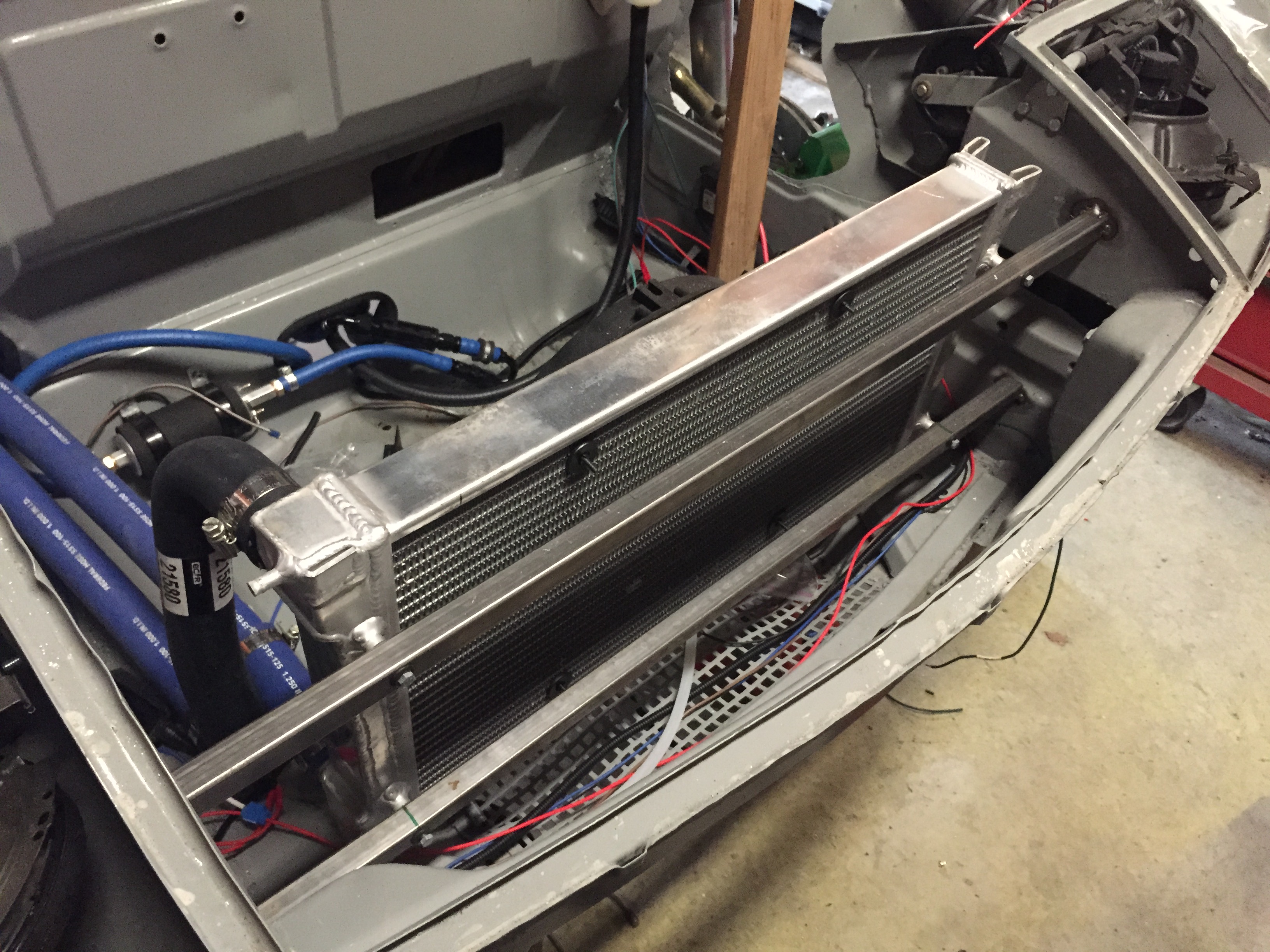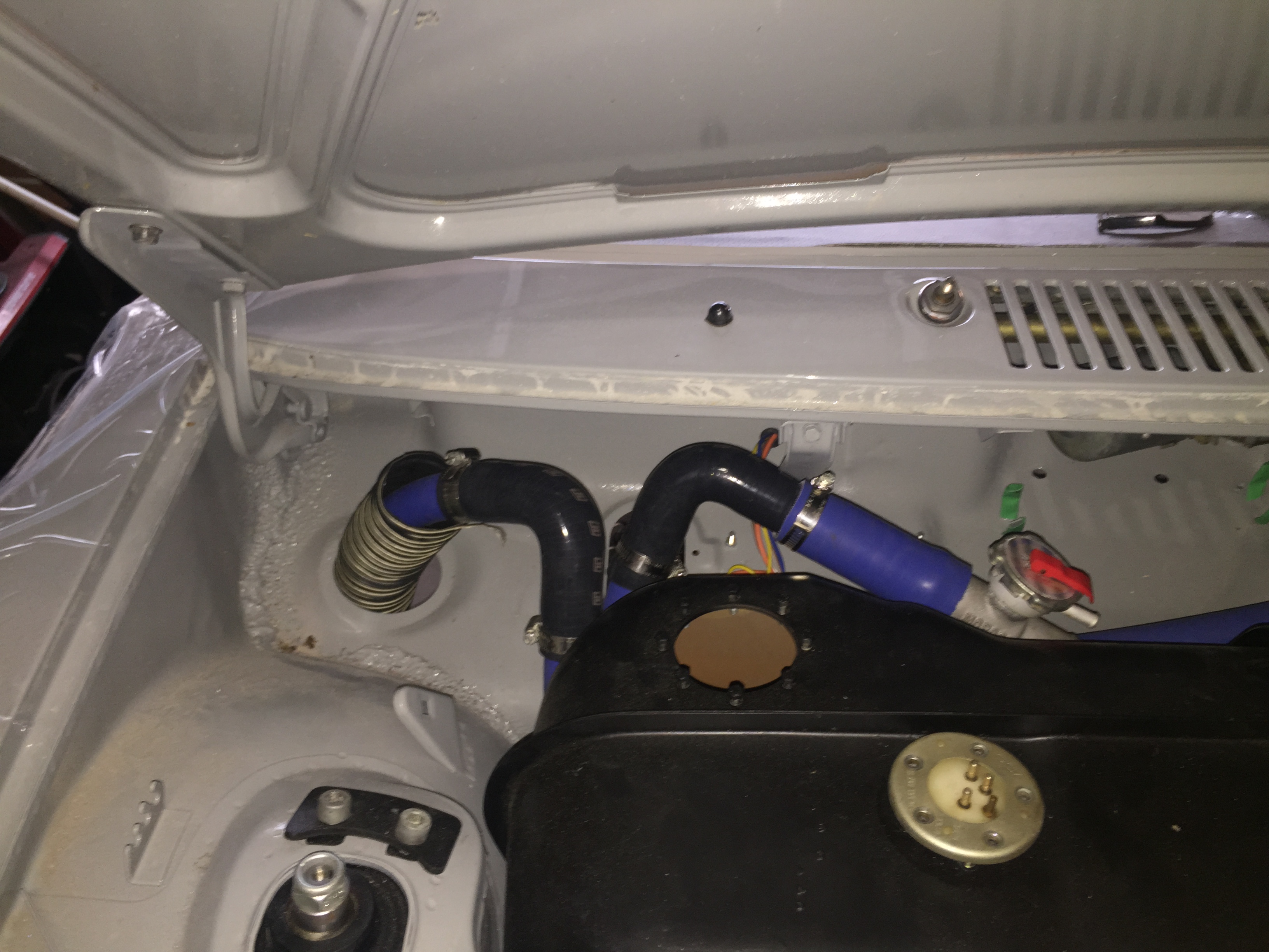 It's just kinda lying up there right now. That's absolutely the highest point, so I thought it would work best to have the coolant fill/burp valve up there. Just kinda sitting up there right now while I decide the best way to do it. I may end up with a solid metal tube up there to get the water from one side of the car to the other, then elbow down off of that.