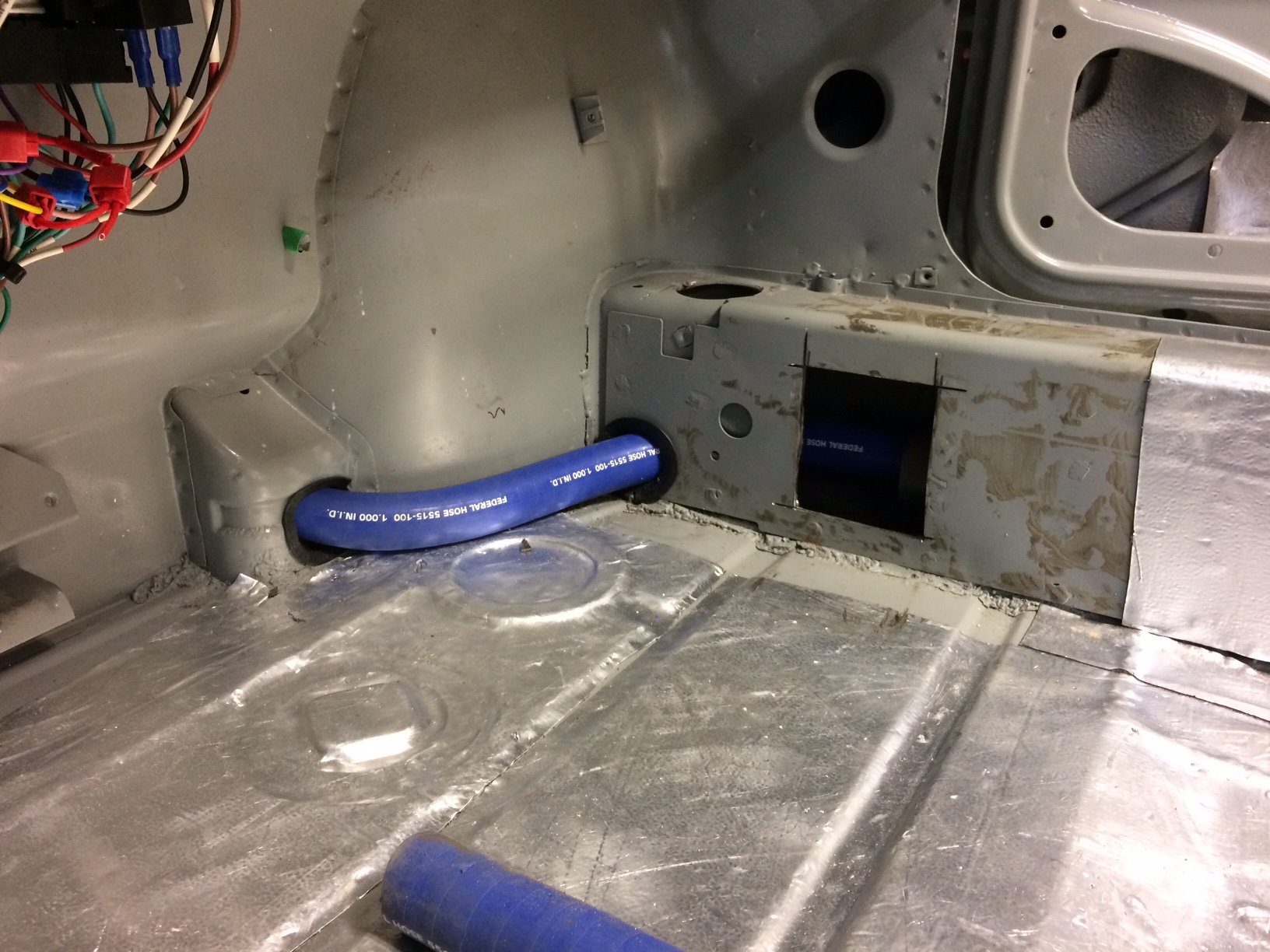 Hose routing through the passenger compartment proof of concept. Still need to clean up the holes and install edge treatment...and weld the access hole closed.