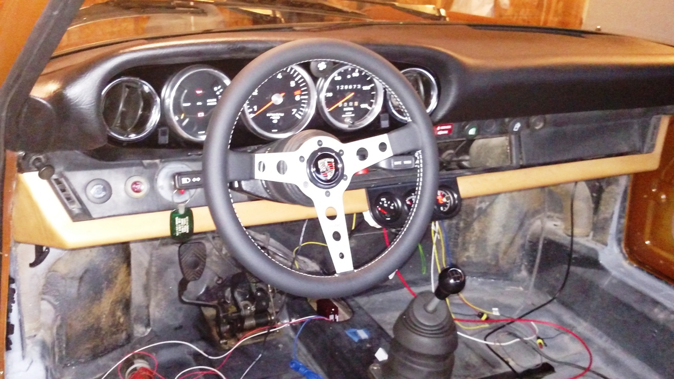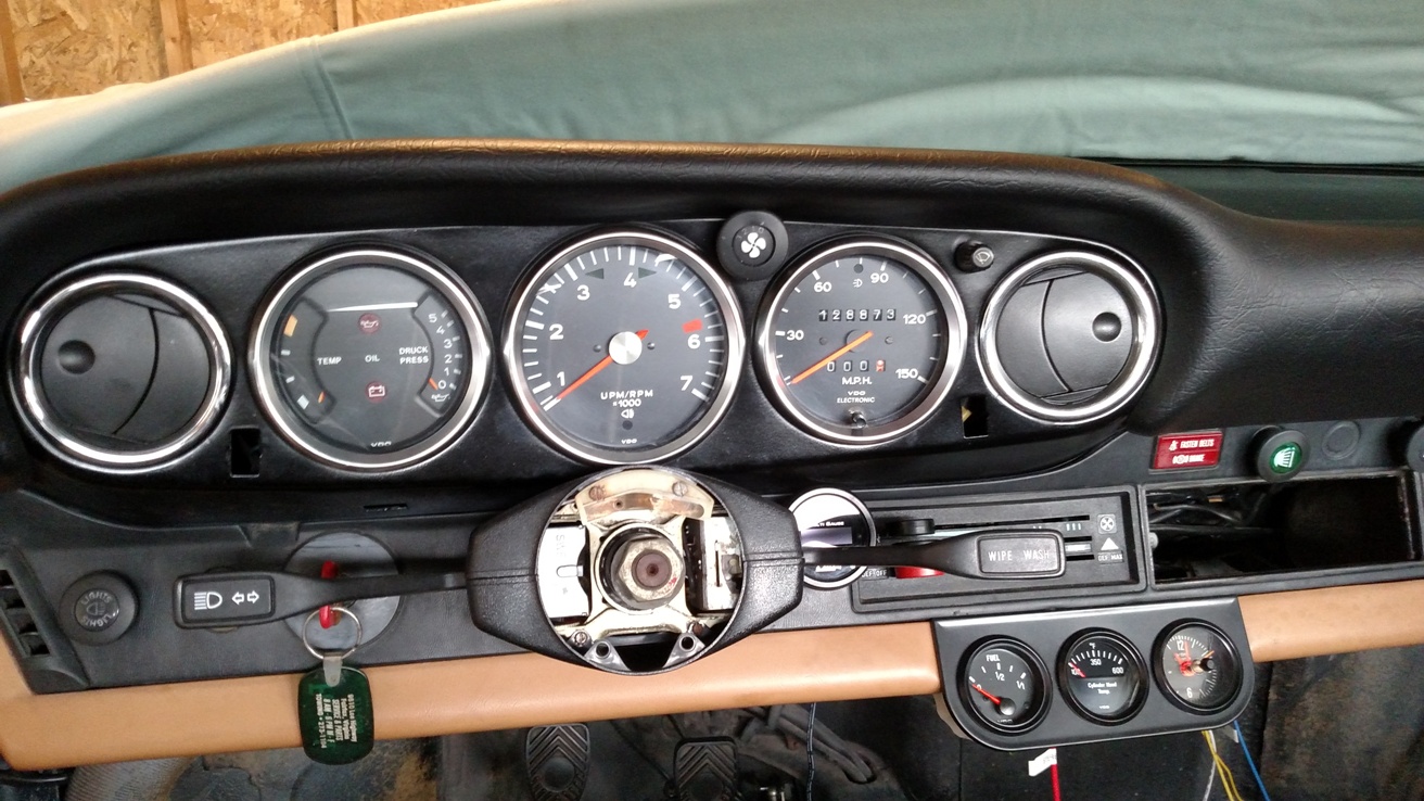 Ran in to a few snafu's still need to work it out (maybe) for some reason the ground wire (ground) was energized with 12V when the key was on. This of course created all kinds of havoc, primarily activating the headlights when the dimmer was turned on, as well as the gauges acting funny. I traced the wire back into the dash and it looks like it runs down to a plug into a module? I just eliminated it and ran a fresh ground for the gauges and backlight. So I now have in the upper dash Oil temp & pressure with oil and alt idiot lights from a 911, stock tach and stock speedo. I also removed the EGR light and put a fan switch (from a 911 AC system) for the new dash vents that bank the upper gauges. Now I need to finish wiring in the lower gauges, to include a gas gauge, CYL head temp, clock (2"VDO) and a PLX Air Fuel/Volt meter. All the lower VDO gauges will be lit off the gauge lighting circuit including dimmer function, and LED indicators for the fog lights, low fuel and new aux fan. The PLX will come on with the ignition. Its not stock, and the purist may hate it, but I kinda like it (IMG:style_emoticons/default/beer.gif) Dash almost complete with MOMO steering wheel Good view of all gauges. I have the PLX mounted with EZpass style velcro, I moved it down a bit to be more center. ![]() Here is the offending 12V ground wire, and some of the new wires I had to run, the yellow is the Oil Pressure, and green is new ground. I also had to run an eztra 12V switched lead for the double gauge. |