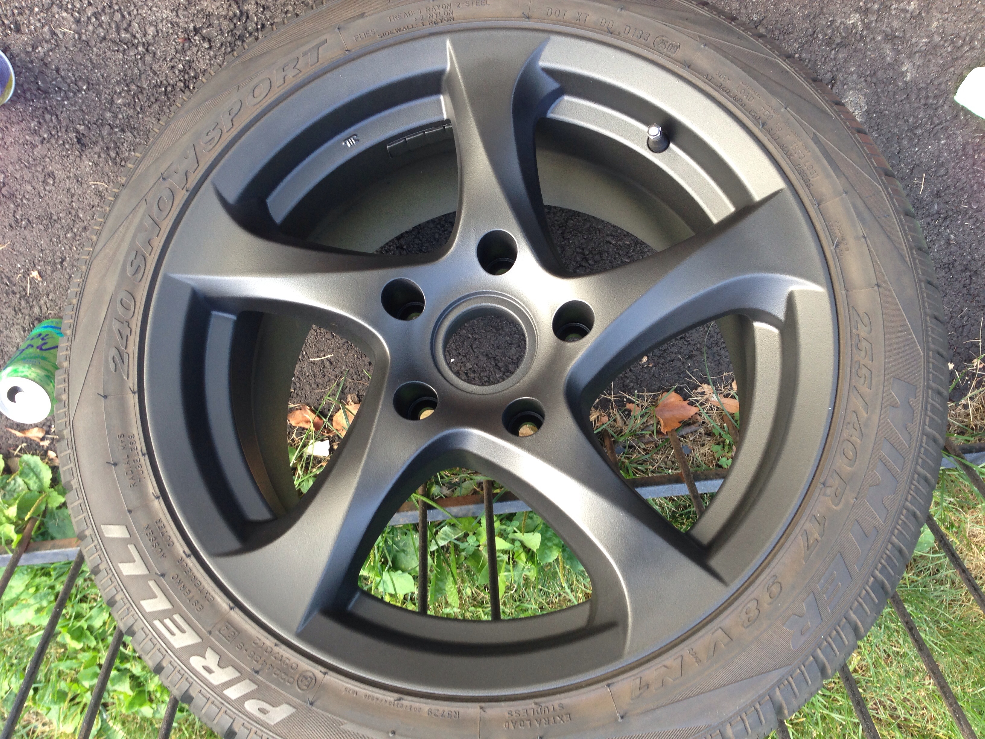 I bought a few cans of the spray to see what it would look likely my rims. VERY easy to spray on and got great coverage. I am going to let it dry for a fee days, but here's what it looks like now. I've been thinking of doing this to either Fuchs or Mahles. Seems like a matt finish? More pics? |