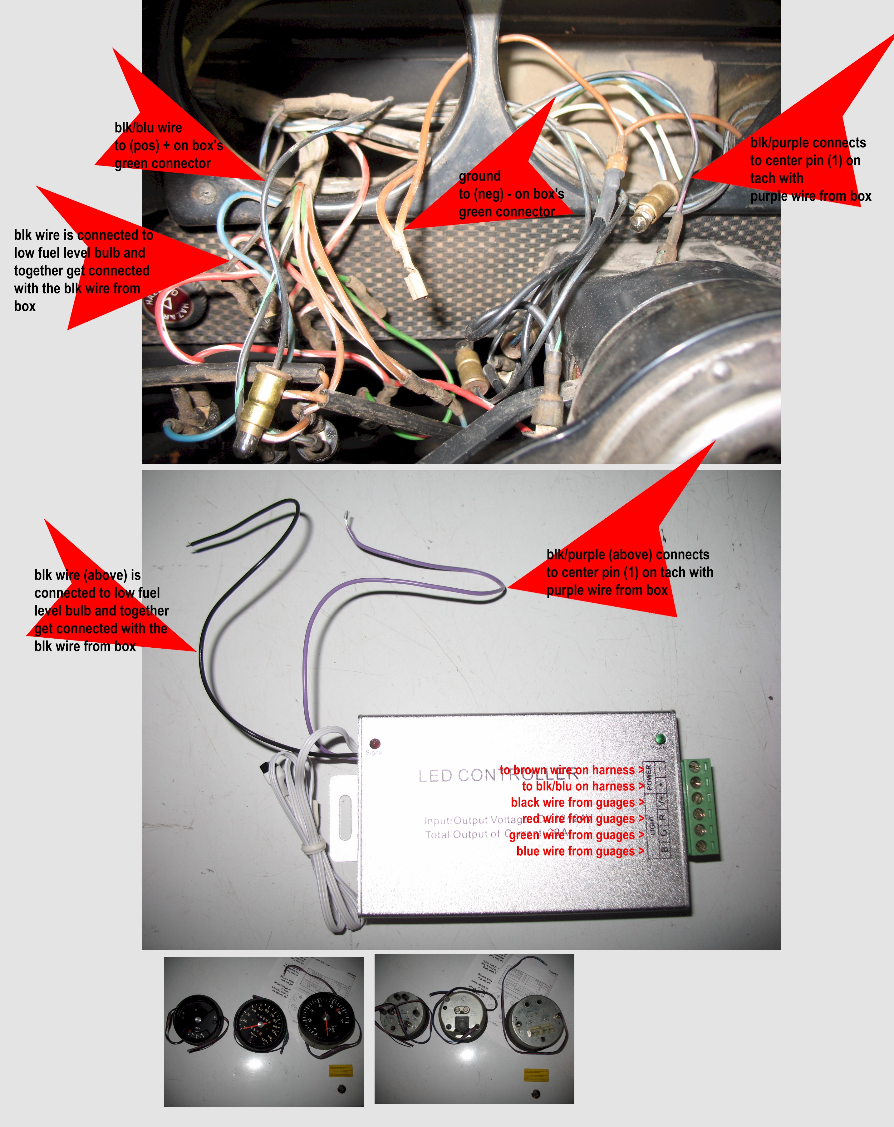 click on image to ENLARGE. 1- most incandescent bulbs get reinstalled. all BACK LIGHT incandescent bulbs get painted with black nail polish first. note that 3 BACK LIGHT incandescents can't get reinstalled because their sockets are being occupied by the RGBblk 4 wire ribbons, thus 3 incandescent bulbs will have to hang loose behind the gage cluster. 2- the indicator bulbs don't get painted black, as they are still needed. ok, so it is now the afternoon, and I buttoned up my wiring. I now have a wire for my parking lights indicator, my high beam indicator, I made 3 sets of pictails to fed the box's purple and black wires, and I labeled my left and right directional indicators. I painted the back light bulbs with gloss black rustoleum I had laying around. I plan to pop the gages in tomorrow and get a video of them in action. Attached thumbnail(s) Attached image(s)