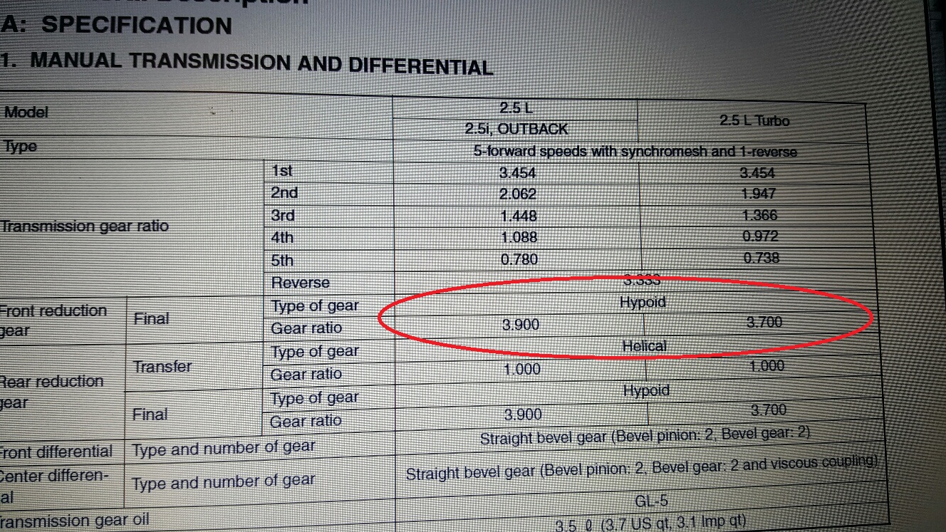 It APPEARS that the non-turbo cars are 3.90 and the turbo cars are 3.70. And it does seem like mine runs a little high RPM in 5th. Can't confirm the final drive...could be a typo but it seems right. I have a 2006 WRX (turbo car) trans. |