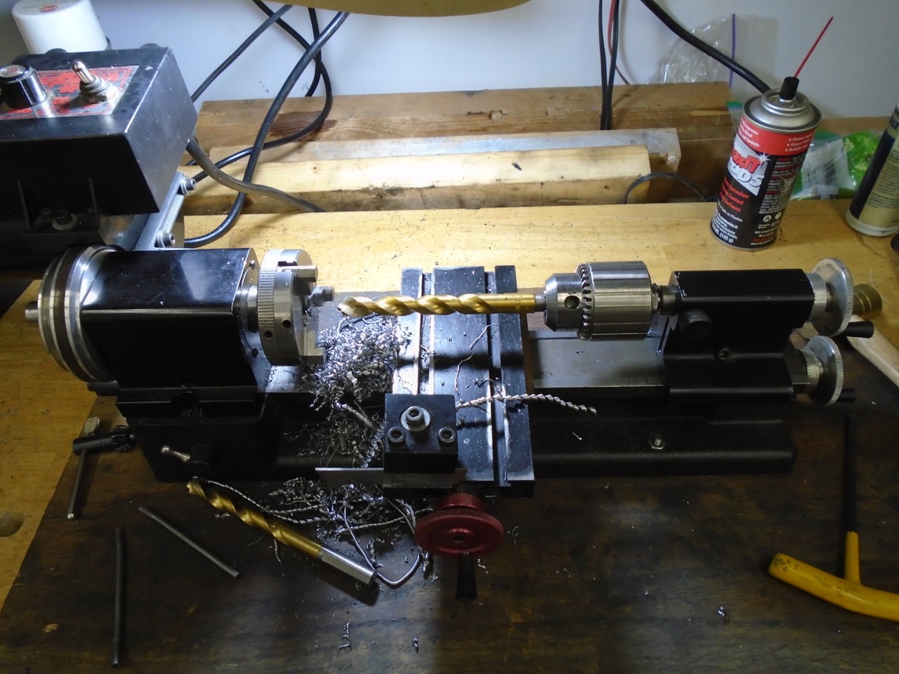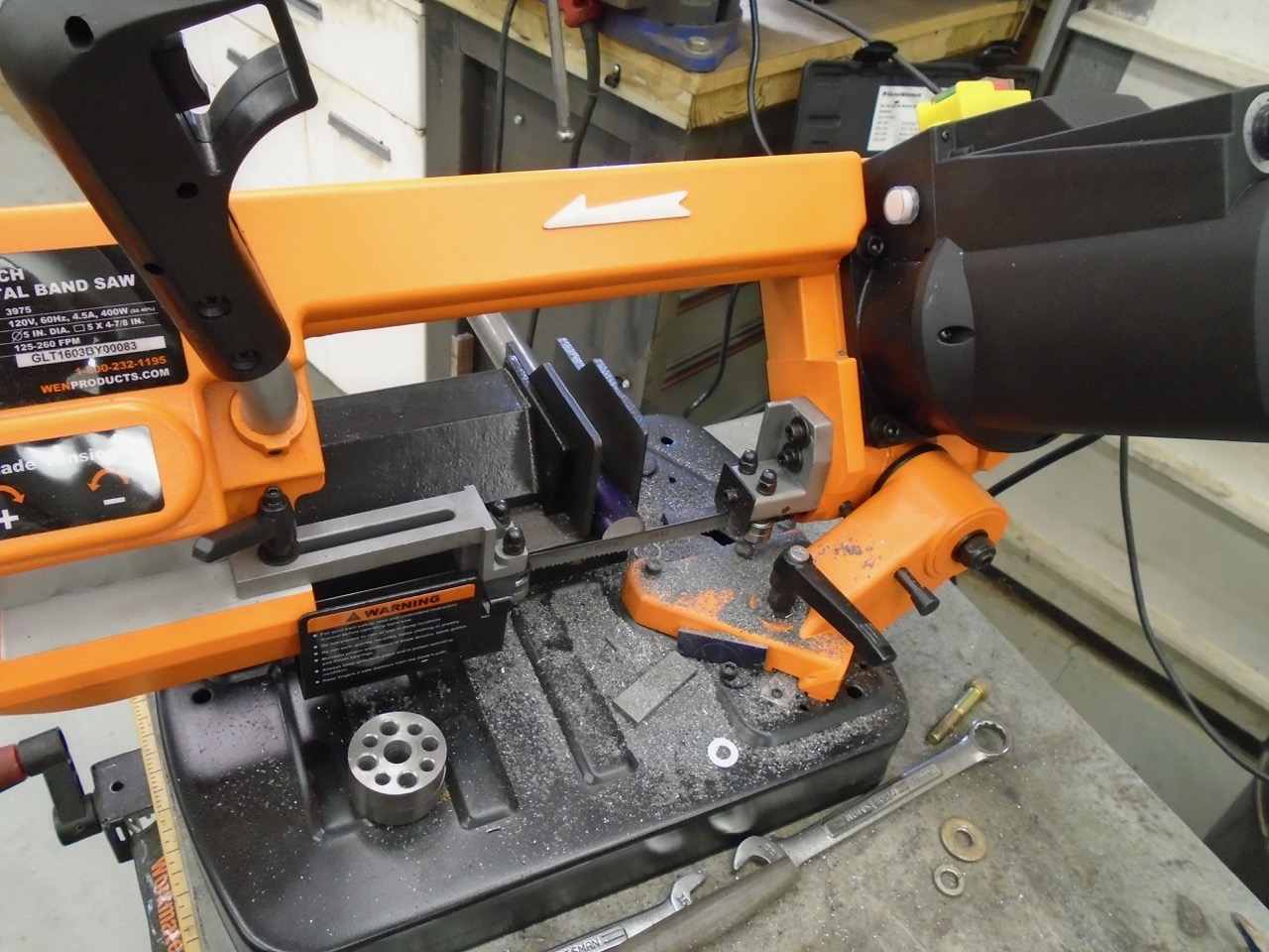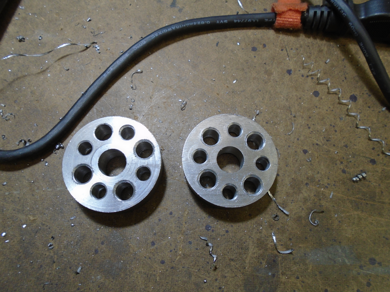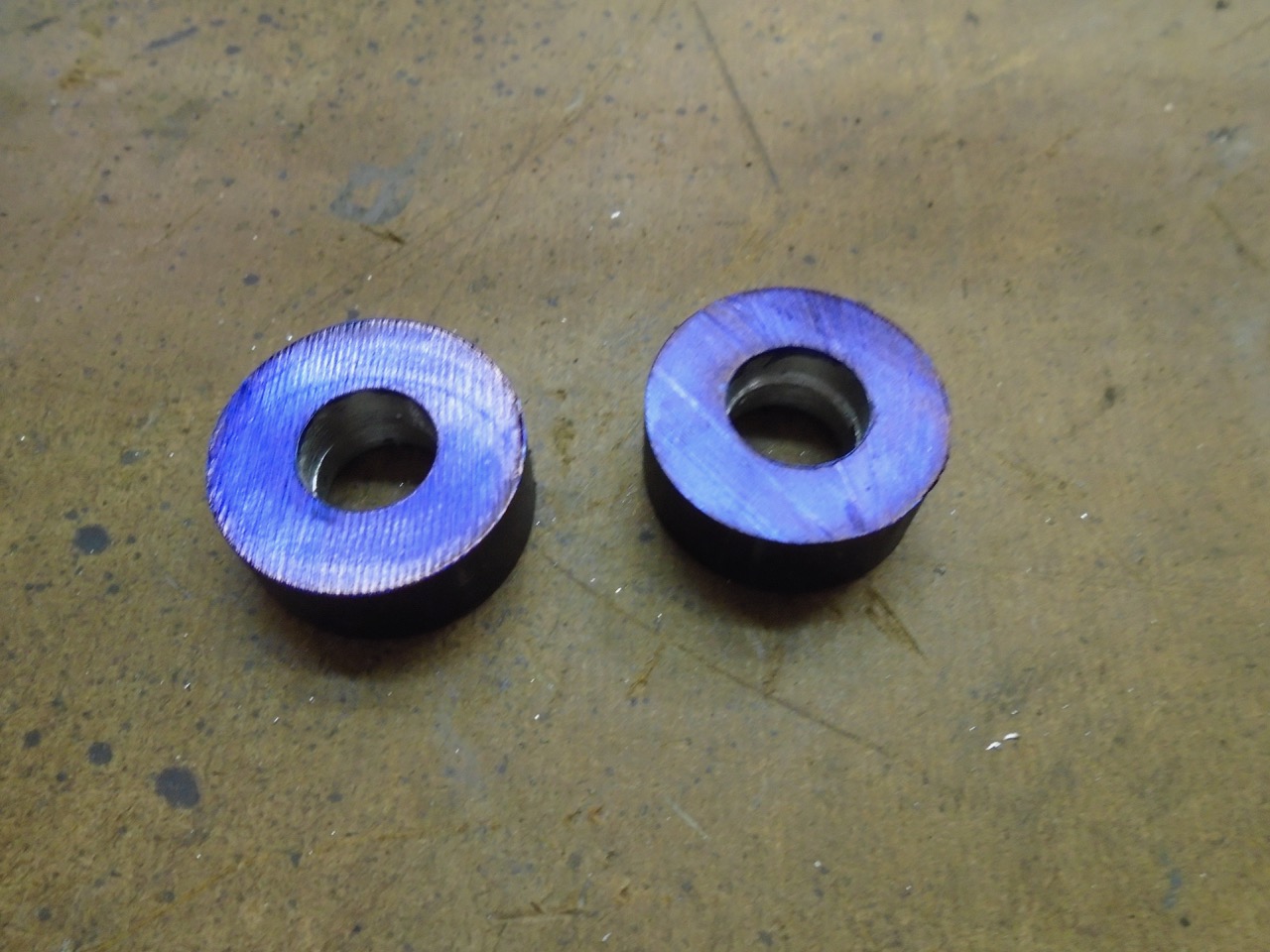 One was the blanks for my transmission mount spacers. I then chucked it in the lathe and trued up the end I had cut on my vertical band saw. Re mounted it into saw, and cut it in half to make the pieces I need. I then drilled them and added some lightening holes to the spacers.
