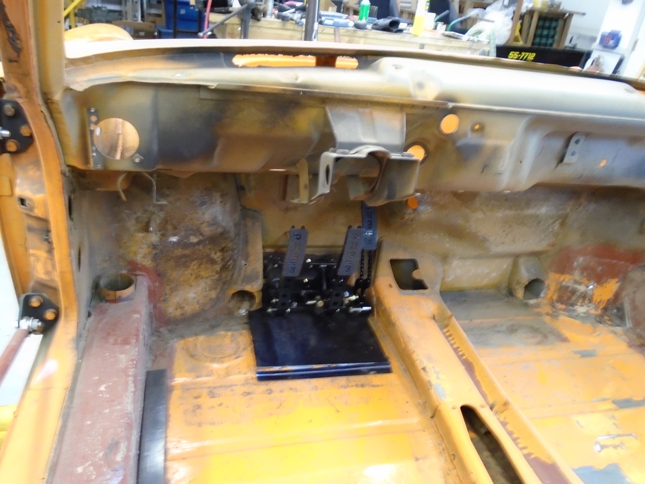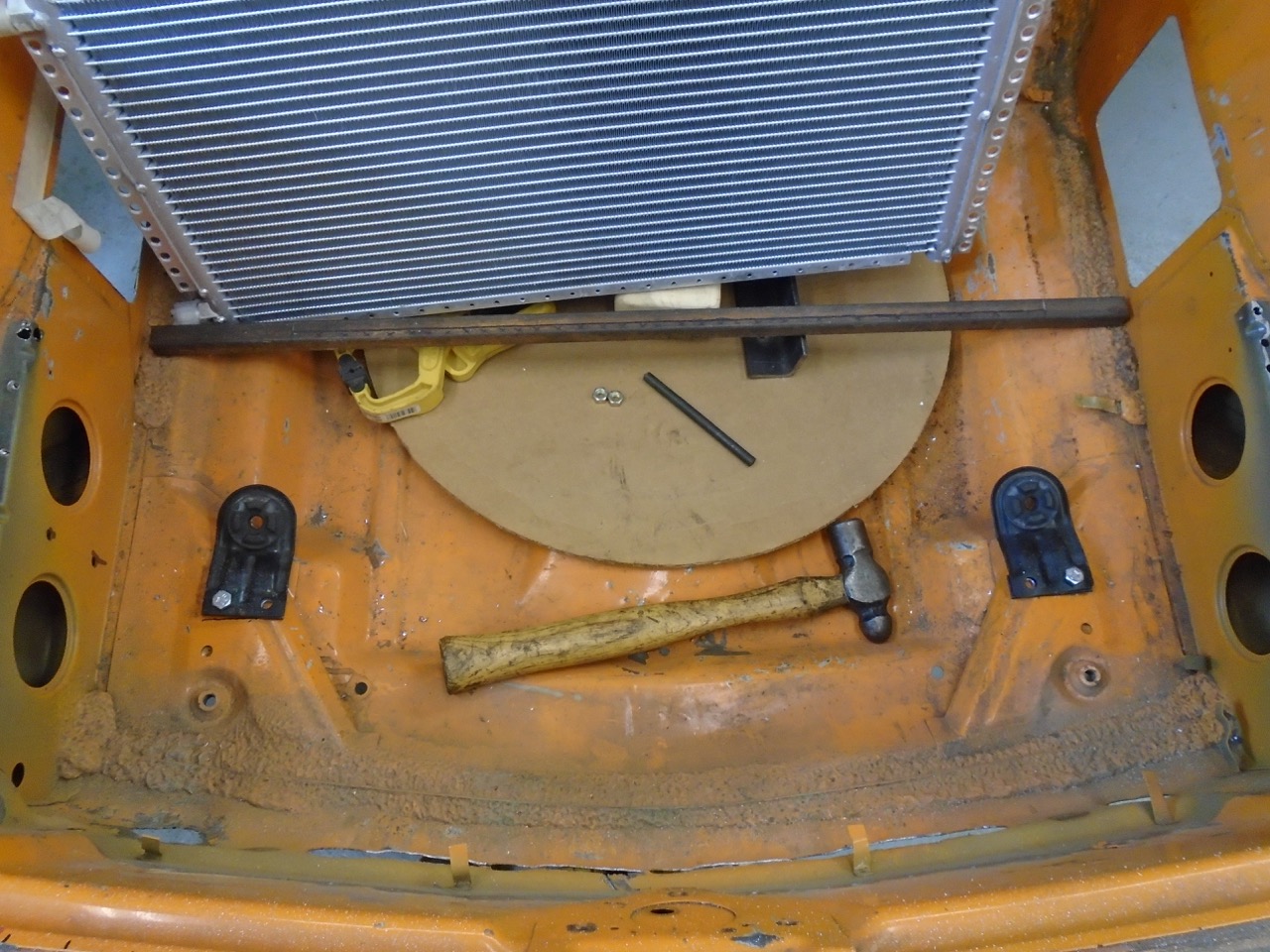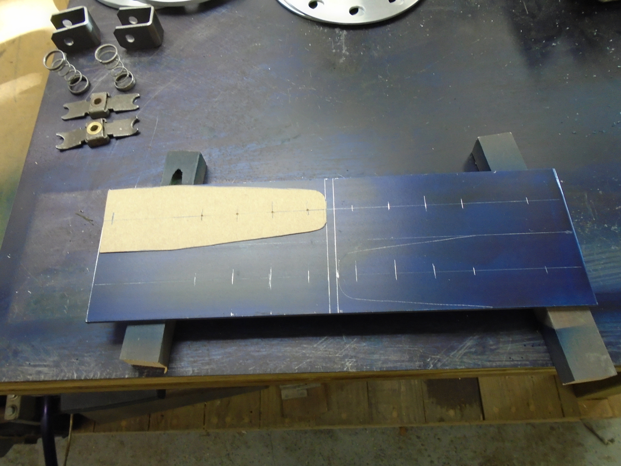 Yesterday. Where the heck did I put the scribe, which lead to me cleaning the shop, which lead to me finding the scribe (IMG:style_emoticons/default/biggrin.gif) and which lead to me thinking I need to purchase more scribes!! All the metal lost from the work on Friday and Saturday. Always make you feel good to have a pan full of shavings. I then got to work on the rear trunk fill section. I got part of it to level out, then tack, hammer, grind, tack, hammer, grind, tack, hammer, grind, etc.... Welder was running like crap. (IMG:style_emoticons/default/mad.gif) Would barely do anything, checked everything over and found a loose ground. Good I thought I found the issue, move on. Then I started back in, still welding like crap. I have gas, so that is not the issue. (IMG:style_emoticons/default/WTF.gif) It is HTP easy grind wire, in a 0,23" diameter. More than likely become filler rod for my TIG, as the stuff just seems to suck. It does grind rather easily, and cleans up well. And to make it all worse when it does start to run correctly, it will break and the feed will ball it up in the machine. (IMG:style_emoticons/default/mad.gif) This is how far I got, with it. And then I ran out of CO2 /Argon (IMG:style_emoticons/default/headbang.gif) I think I will switch to all Argon tanks, and keep 3 of them around, one on each welder one spare. At least until I finish this project. Panel fits really tight , I just need to push the upper section into place. I just wedge a 2x2 under the one section, get it just right and (IMG:style_emoticons/default/welder.gif) (IMG:style_emoticons/default/smash.gif) So I have been dreading working on the pedal. All sorts of variables going on, and I keep procrastinating the build. I started with a mockup, but then tossed it away, and just went to metal. Chemdyed it up, and started marking things. A cut here a whole there, a few more cuts and this is what I ended up with. Need to make a reinforcement piece to reduce flex under the floor board, and also to accept the front suspension arm bolt at the rear location. I then started woking the back side, and made a piece to cover the M/C and keep them tidy. I still need to make the two side pieces. This will unbolt to gain access the the MC's just incase you need to RR one of them. After that I worked on the cooling system placement of items. I would love to see the front trunk, but can't figure out an easy way to do that. There is room for a 14x12 RAD behind the light buckets into the fender, if you made it 14 x 14 the tubes could be in the trunk area, making it easier to hook up Both sides would have a larger cooling capacity than my current griffen, so that is doable That leads you to no 14x14 rads unless you get the custom made. And that equals $$$$ So long of the short, I still have not quite decided how to mount the rad. I do know that it will most likely change several times before I get the final pieces done. |