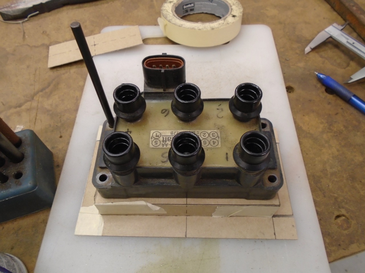 I did make a nice cardboard mockup of the coil mount back on the trunk wall. I was going to build it out of 20ga, and be all artsy. I transfer markings on cardboard via my trusty Dyekem - a little dab on the point and you can transfer the center of the hole my barely making contact. Squared corners mount is made up. Now to get the it to fit nicer around the coil. Trick number 2, masking tape and a knife, stretch it across the corner and cut it out. I can careful transfer it to metal. Then file it to fit. That is if to the coil mount as, I am not ready to transfer it to metal, it was a quick project while I waited for stuff to cool off. More work to come, I will update latter tonight. |